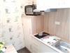 • Küche mit 2 Stühlen u. Tisch, Mini-Backofen, 2 Kochfelder, Dunstabzugshaube, Kühlschrank mit Gefrierfach, Kaffeemaschine, Toaster, Wasserkocher und div. Haushaltsutensilien