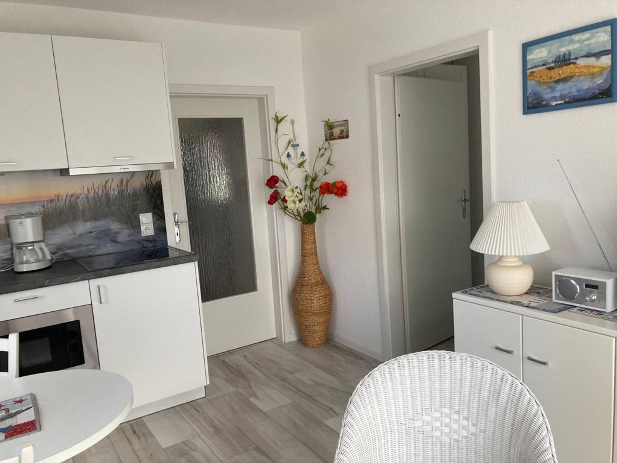 3-Zimmer Ferienwohnung im Erdgeschoss einer liebevoll angelegten Ferienanlage. Die Ferienwohnung ist im Wohnbereich ausgestattet mit einer gemütlichen Couch und einer offenen Küche mit Essbereich.