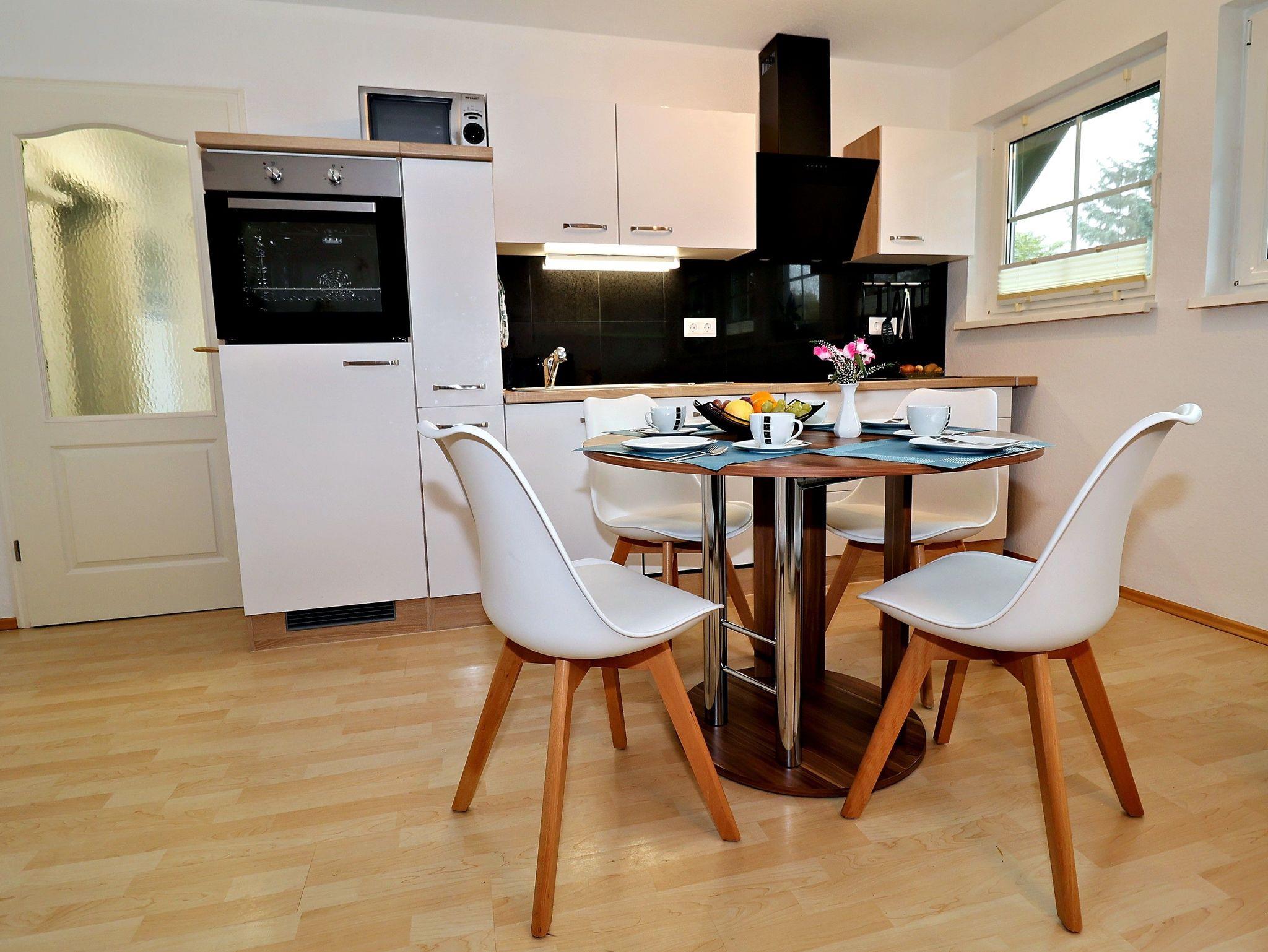 • eine komfortable, vollausgestattete offene Küchenzeile mit Ceranfeld- 4 Platten, Backofen, Kühlschrank, Wasserkocher, Geschirr, Besteck, Gläser, Mikrowelle, Kaffeemaschine, Toaster, erweiterbarem Essbereich