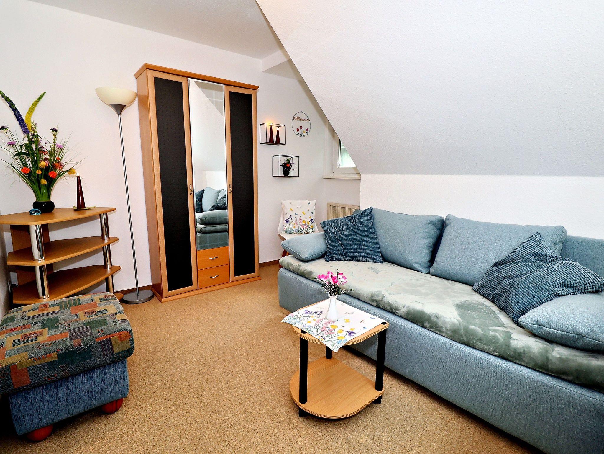 • 1 Gästezimmer mit einem Schlafsofa (1,60 m Liegefläche) und Kleiderschrank.