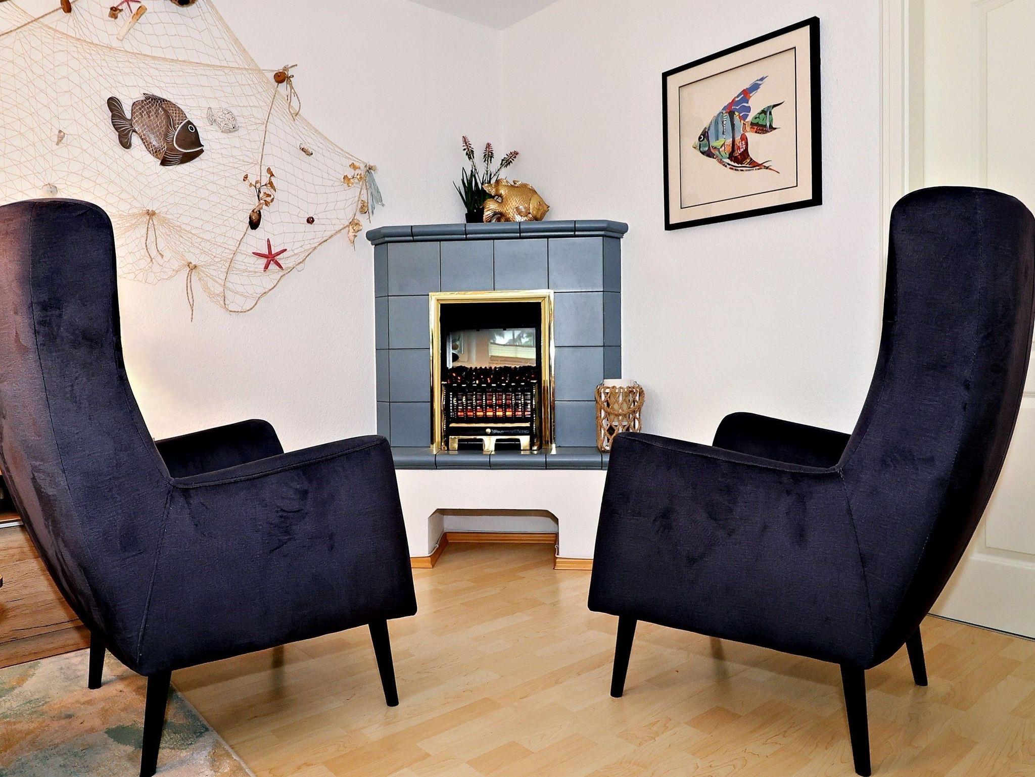 • 1 Wohnraum ist ausgestattet mit einer gemütlichen Sitzecke: Schlafsofa (1,60 m Liegefläche),2 Sessel, TV und einem elektrischen Kamin, WLAN