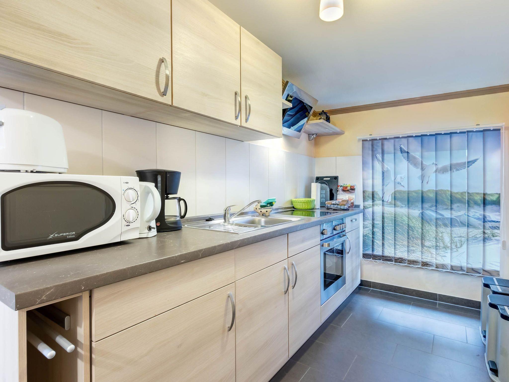 Ein Kinderbett und Hochstuhl stehen kostenfrei zur Verfügung. Die Wohnung ist mit einer Küchenzeile, einer hochwertigen Sitzgarnitur (die auch als Bett genutzt werden kann) sowie modernen Geräten wie Herd, Kühlschrank, Mikrowelle, Toaster, Wasserkocher und Kaffeemaschine ausgestattet.