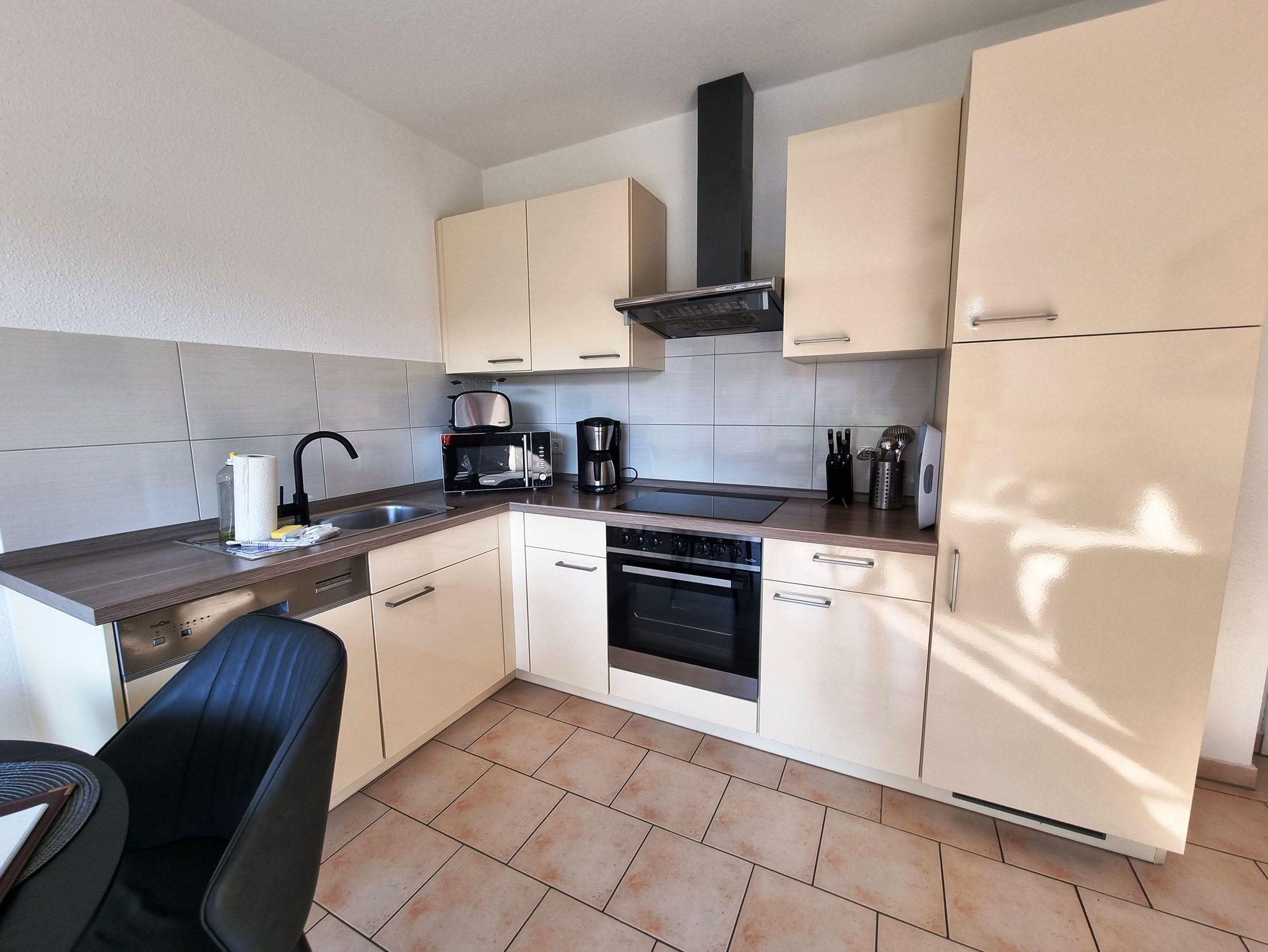 Die Ferienwohnung liegt im Erdgeschoß des Ferienhauses. Sie besteht aus Wohnzimmer, kompl. ausgestatteter Küche, Schlafzimmer und Tageslichtbad. Die Ausstattung der Einbauküche ist neuwertig funktional und qualitativ hochwertig unter anderem mit Toaster, Kaffeemaschine, Backofen mit Heißluft, Kochfeld, Geschirrspüler, Gefrierfach. Große Südterrasse mit Blick auf den Küstenwald, große Spielwiese. Grillplatz