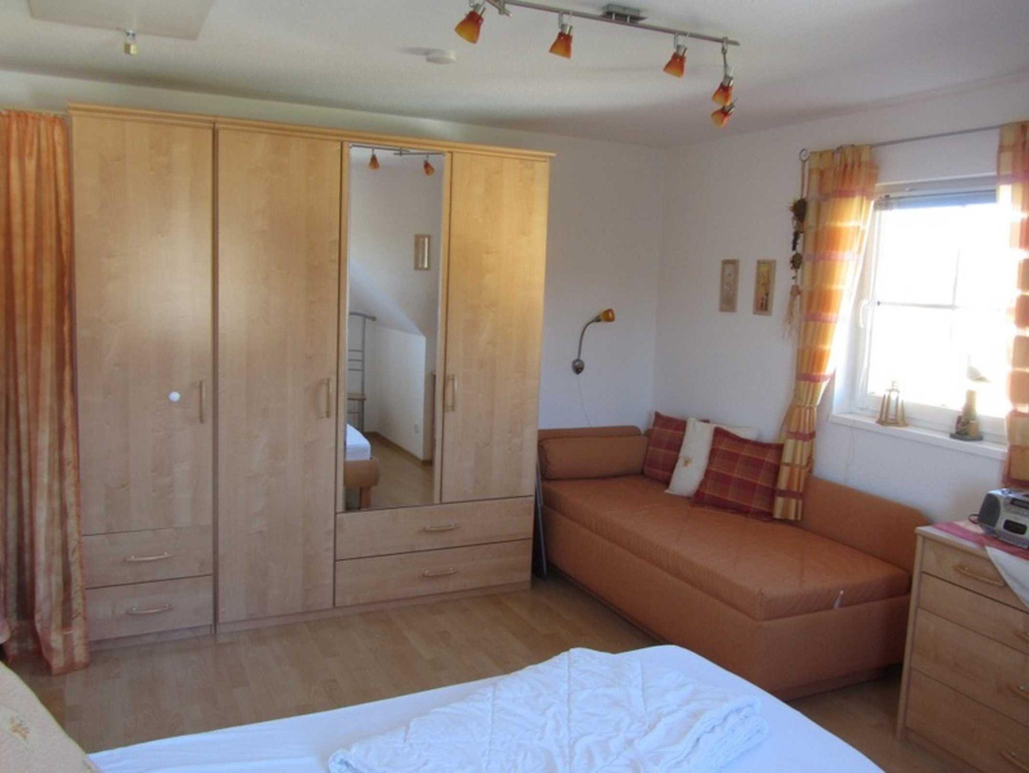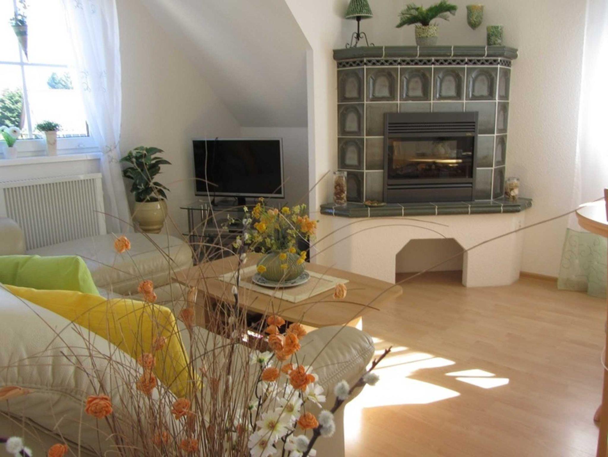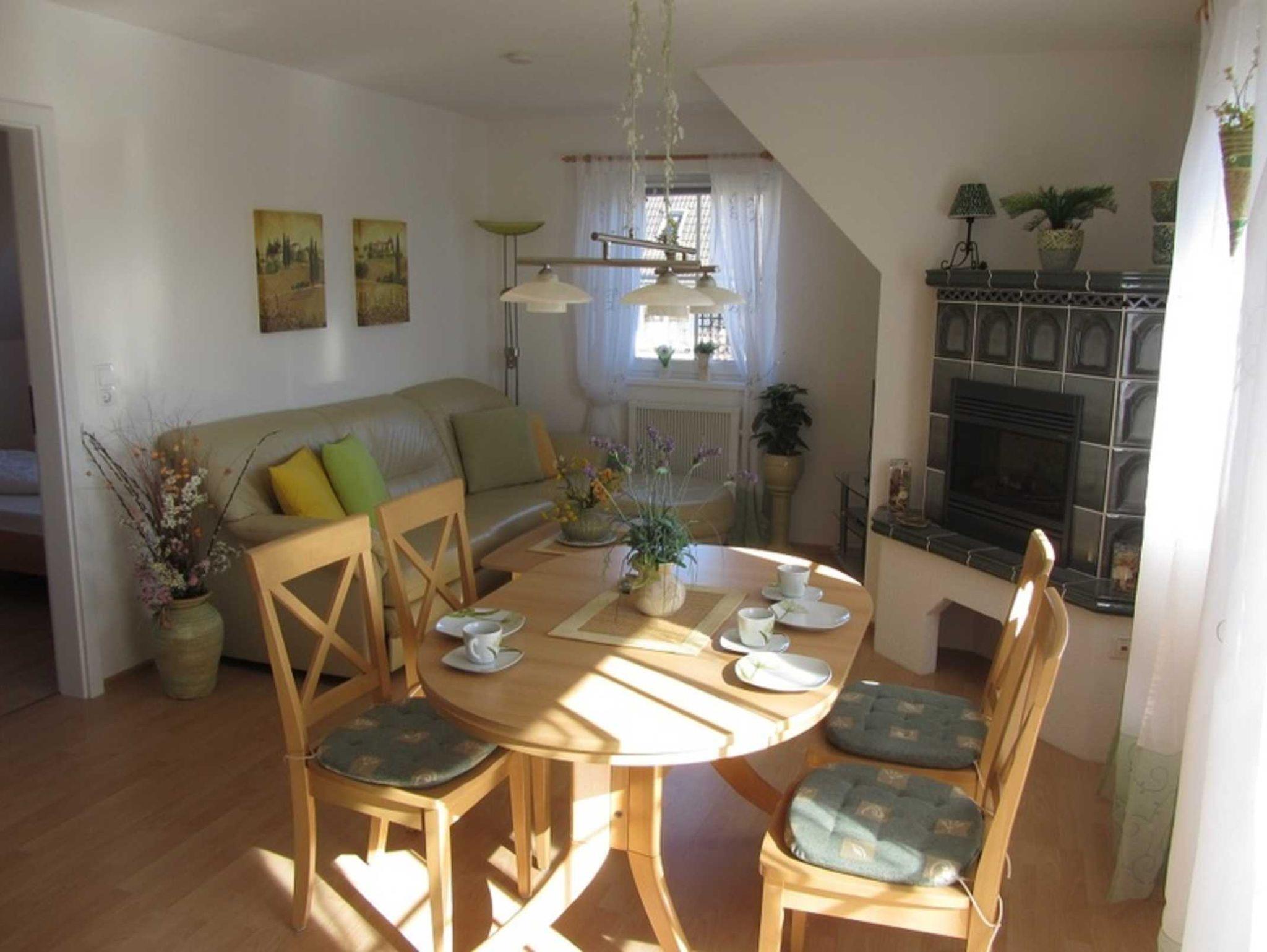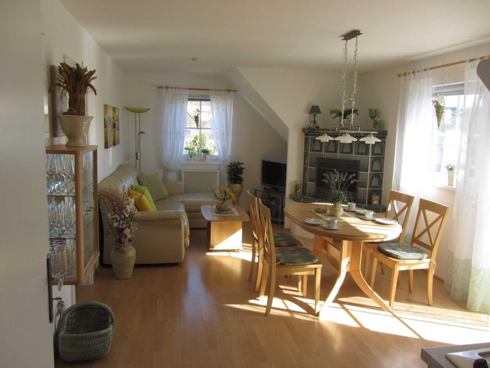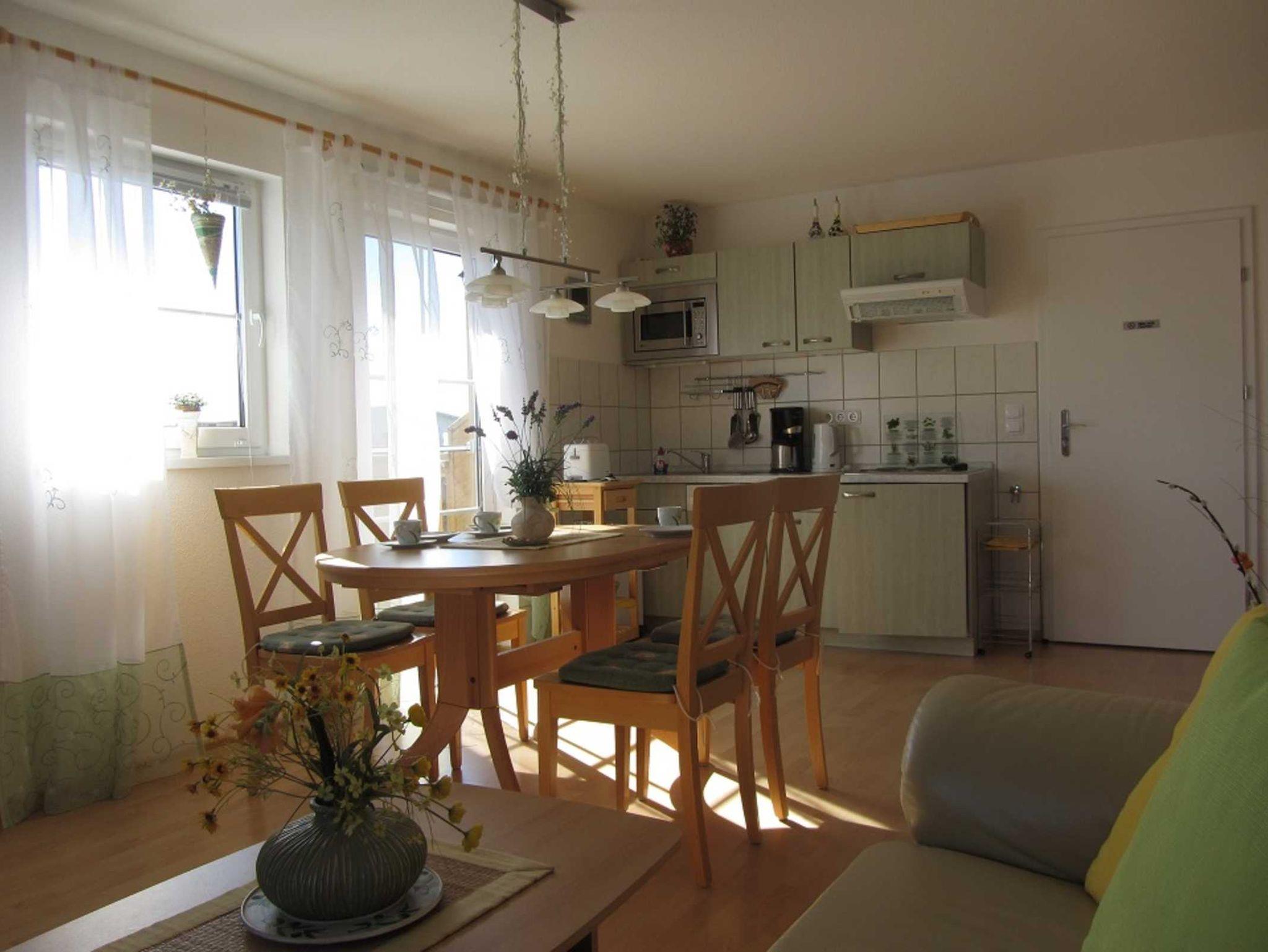 Helle 2-Zimmer Ferienwohnung im Obergeschoss einer liebevoll angelegten Ferienanlage. Die Ferienwohnung ist im Wohnbereich ausgestattet mit einer gemütlichen ausziehbaren Eckcouch und einer offenen Küche mit Essbereich.