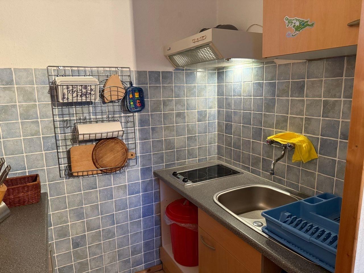 Die offene Küche ist komplett ausgestattet und bietet somit alle Möglichkeiten zur Selbstversorgung. An kälteren Tagen sorgt ein Kachelofen für Behaglichkeit. Das Badezimmer ist mit einer Dusche und einem WC ausgestattet. Es gibt zwei Schlafzimmer, eines davon verfügt über ein Etagenbett. Das Wohnzimmer ist gemütlich eingerichtet und verfügt über einen Sat-TV.