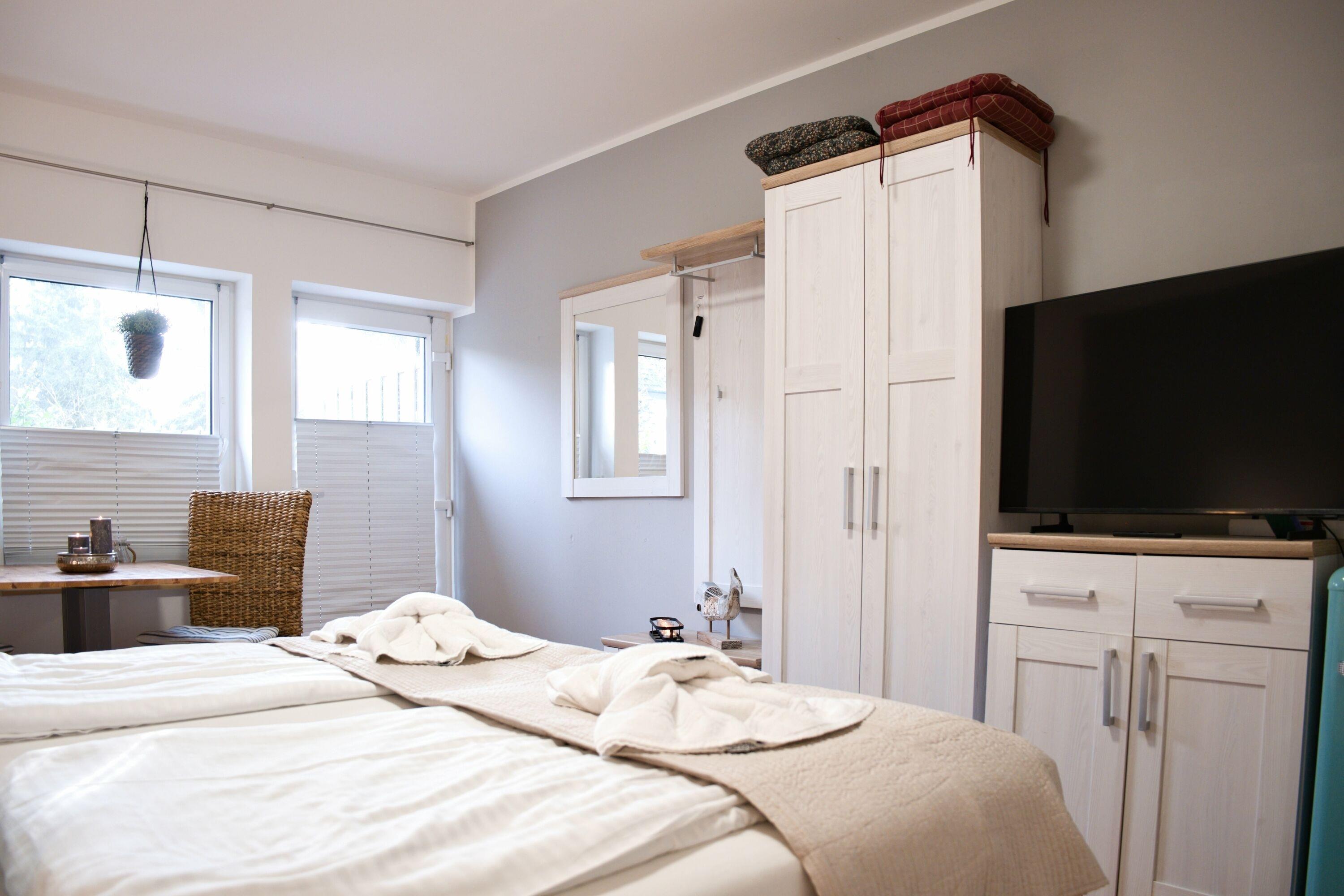 Unsere Pension bietet Ihnen die Möglichkeit, in gemütlichen Doppelzimmern zu übernachten. Dieses Zimmer verfügt über eine separate Küche, in der Sie sich selbst versorgen können. Auch ein eigenes Badezimmer mit Dusche ist vorhanden. Für einen erholsamen Schlaf steht ein komfortables Doppelbett zur Verfügung. Zur Unterhaltung steht Ihnen ein Fernseher zur Verfügung und für angenehme Temperaturen sorgt die Heizung. Jedes Zimmer verfügt außerdem über einen separaten Eingang und eine eigene Terrasse, sodass Sie Ihre Privatsphäre genießen können. Zusätzlich haben Sie die Möglichkeit, die möblierte Sonnenterrasse zu nutzen und sich dort zu entspannen.
