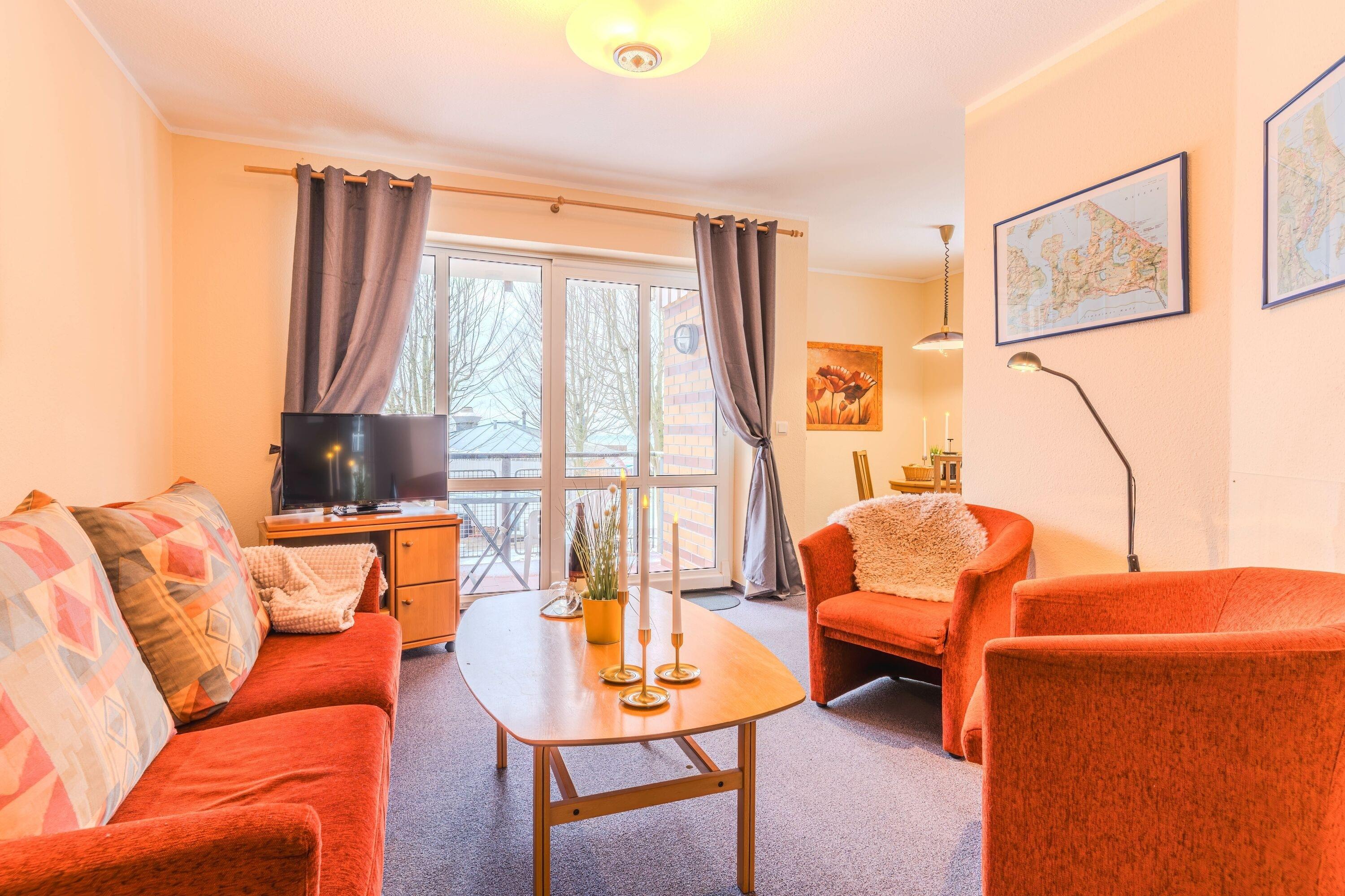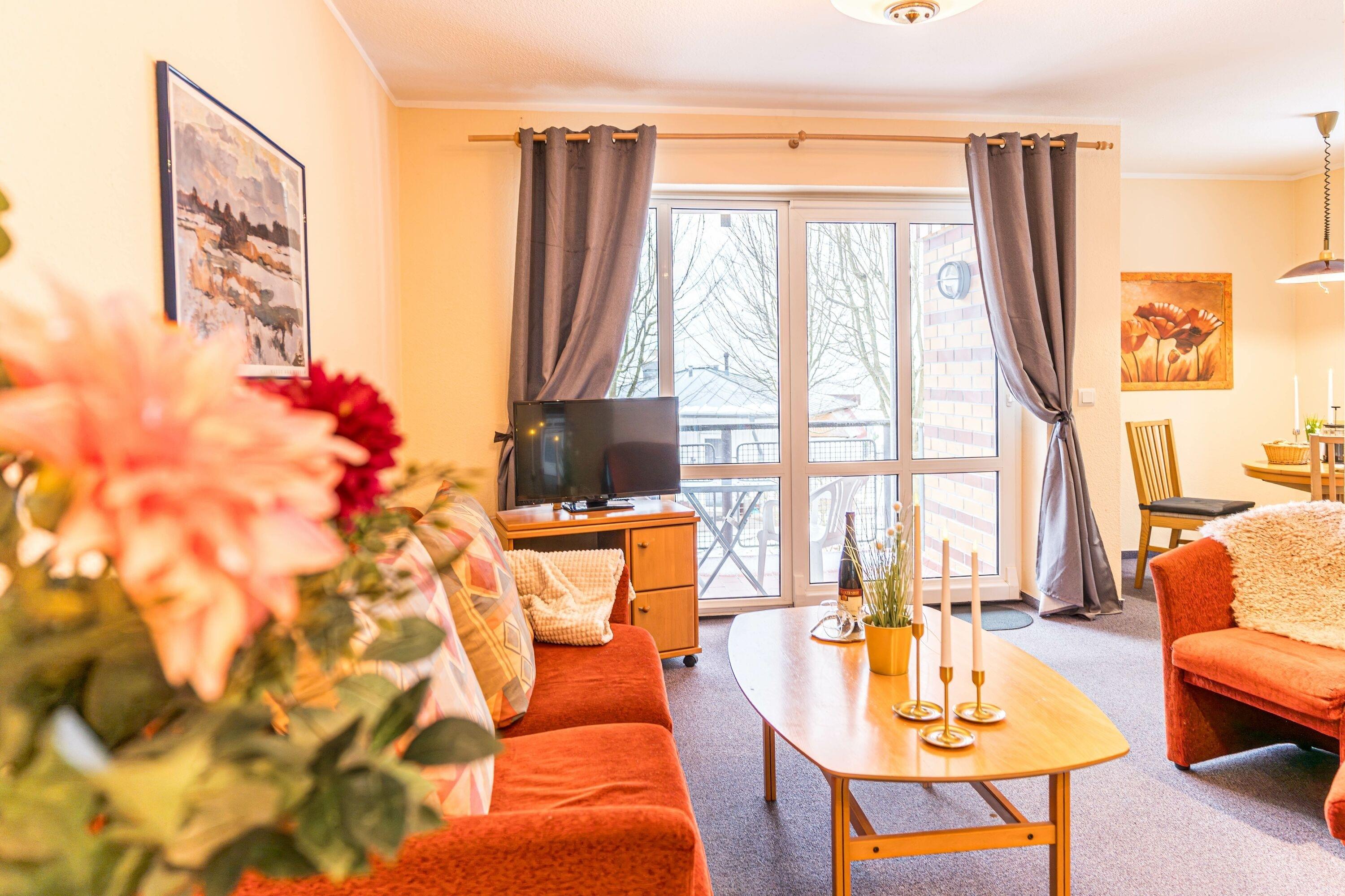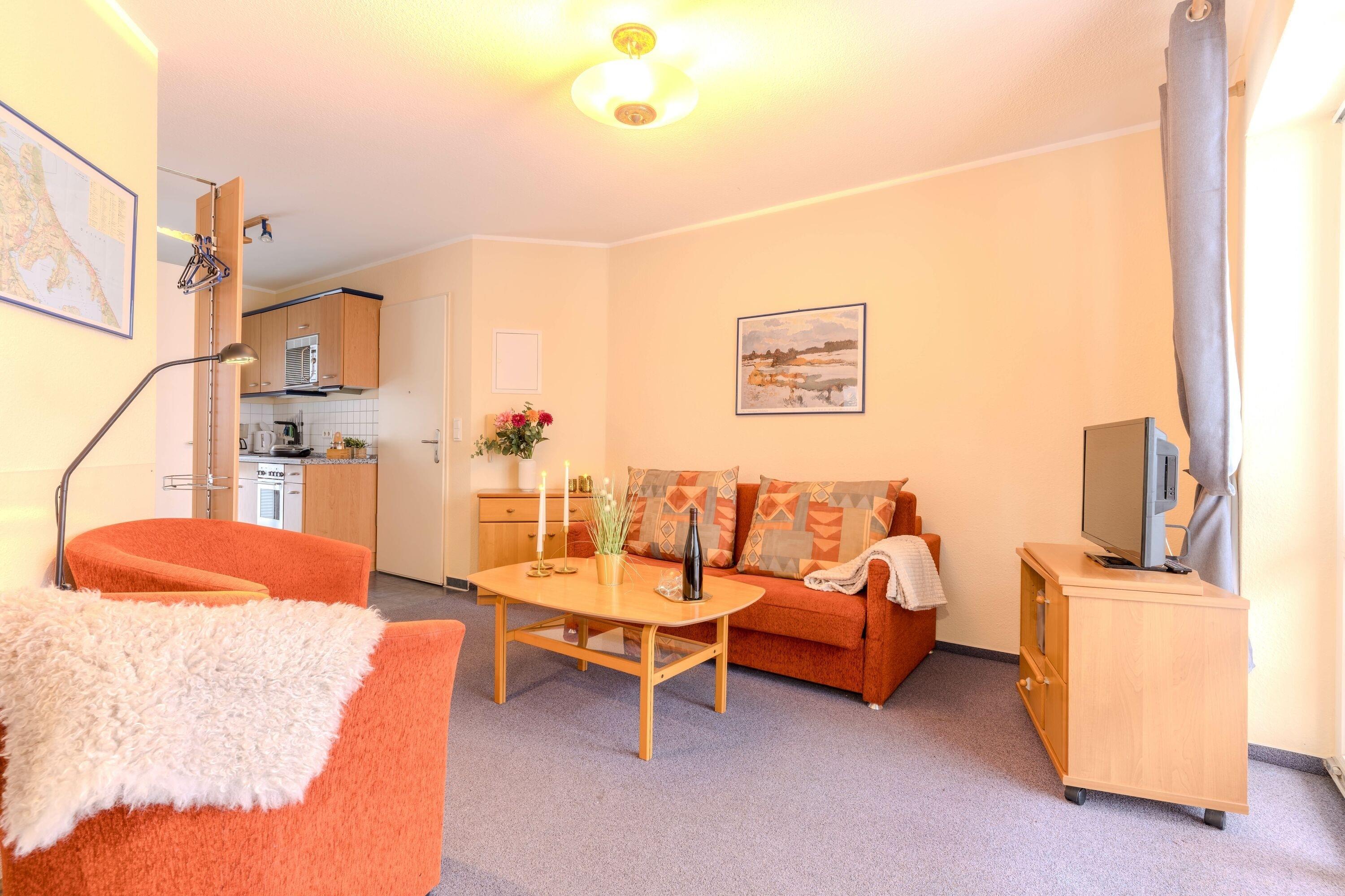 • Helles Wohnzimmer mit Fernseher, Radio und gemütlicher Schlafcouch