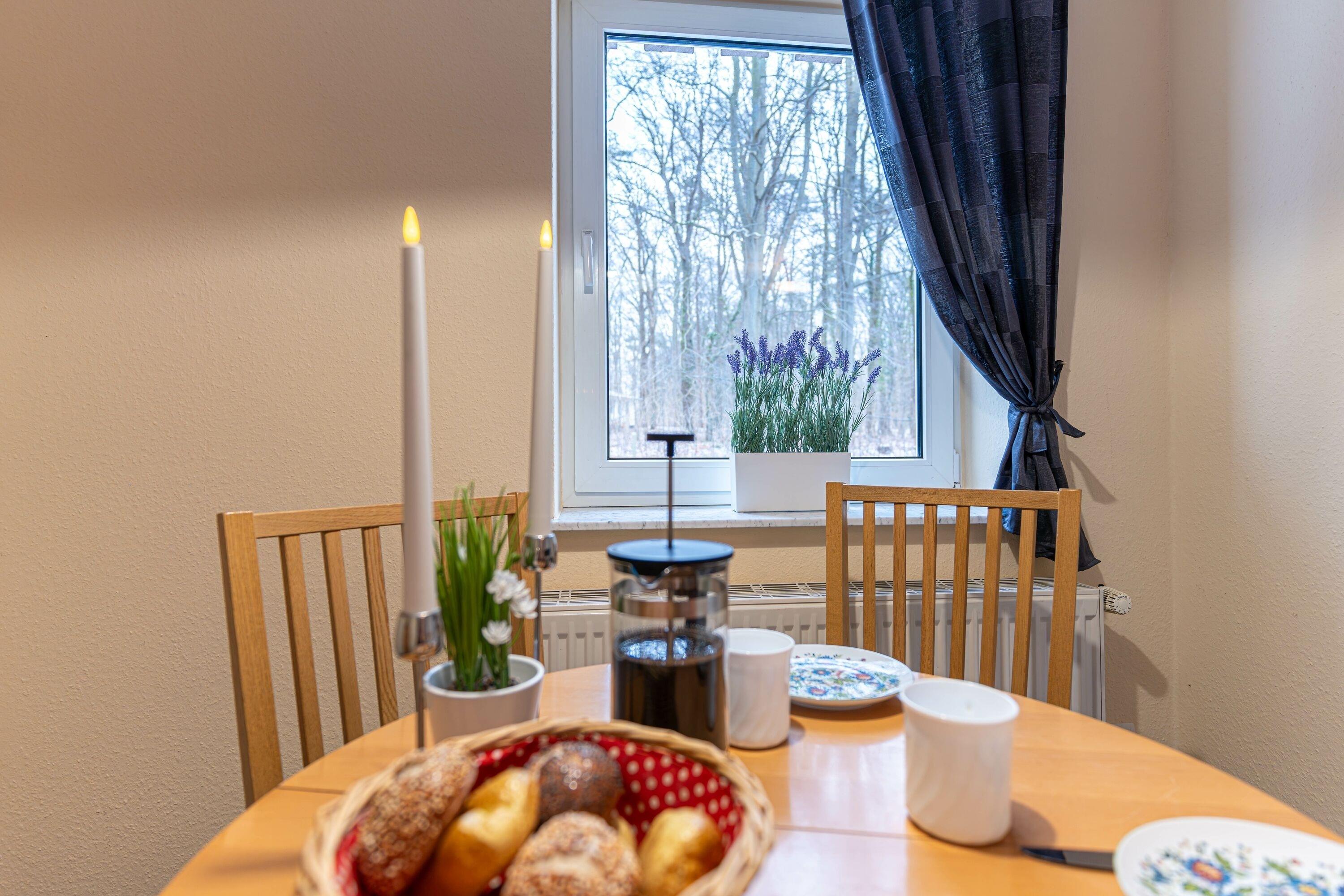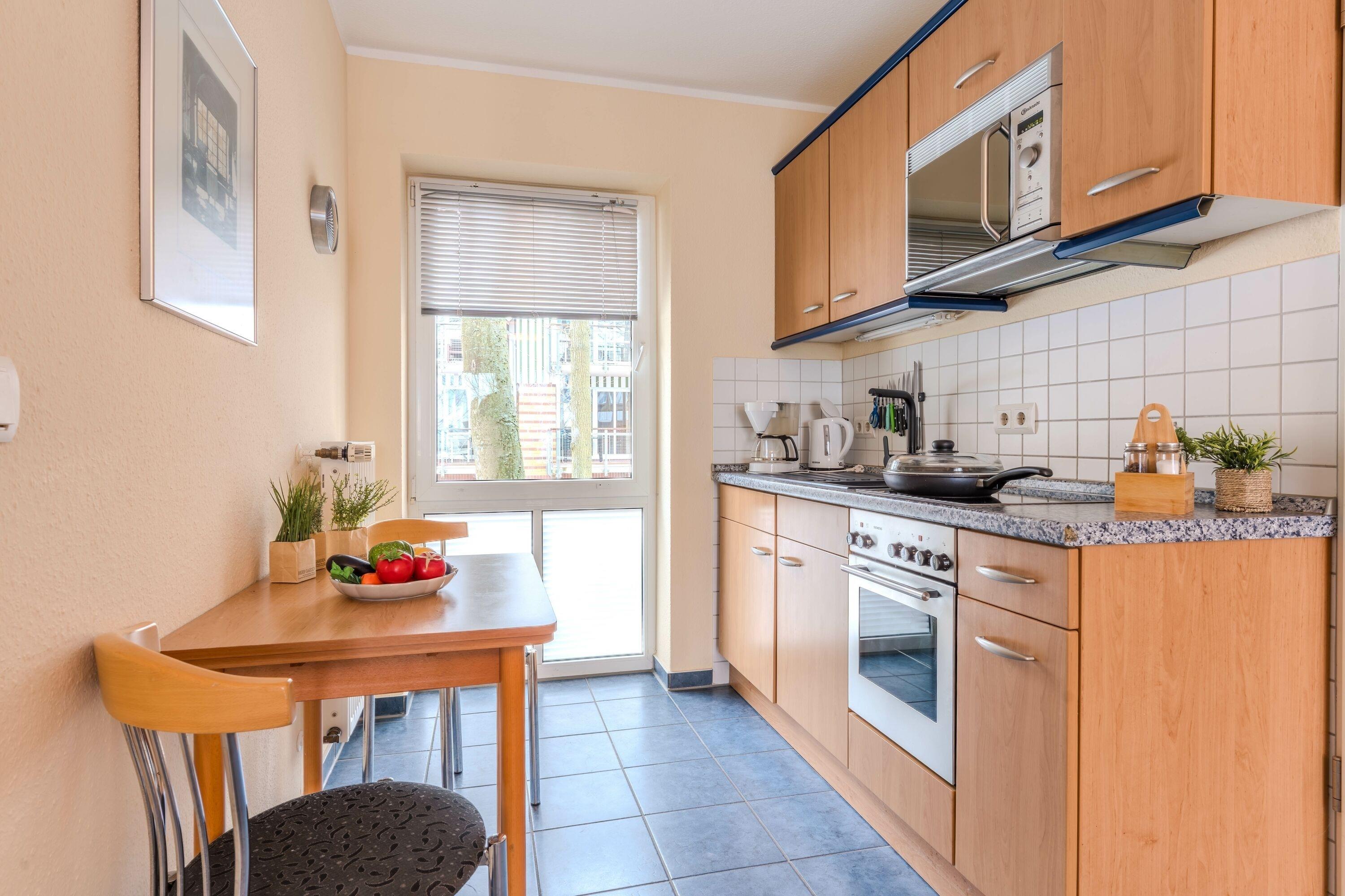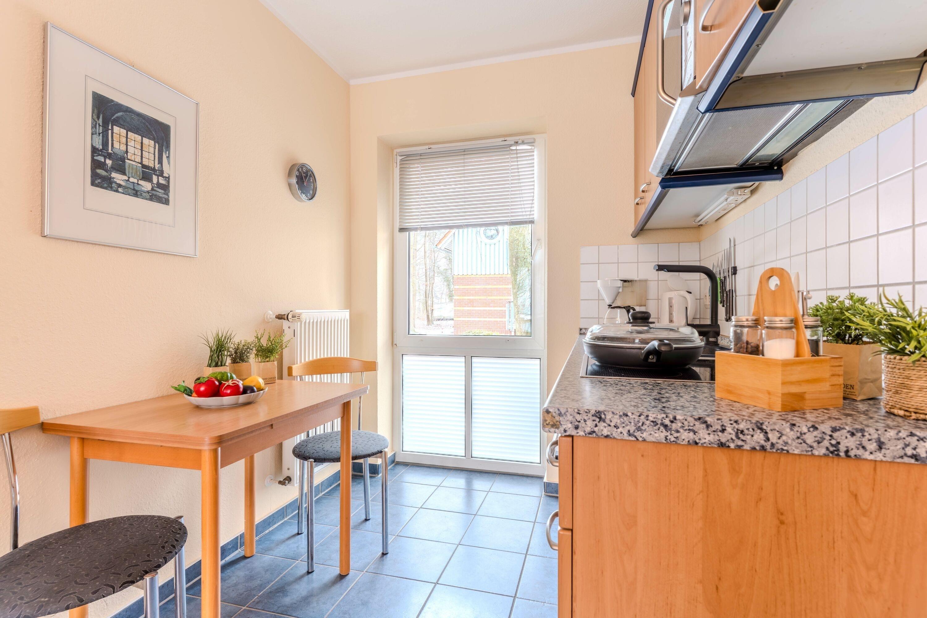 • Offene Küche mit Wasserkocher, Kaffeemaschine und Kühlschrank – ideal für Selbstversorger