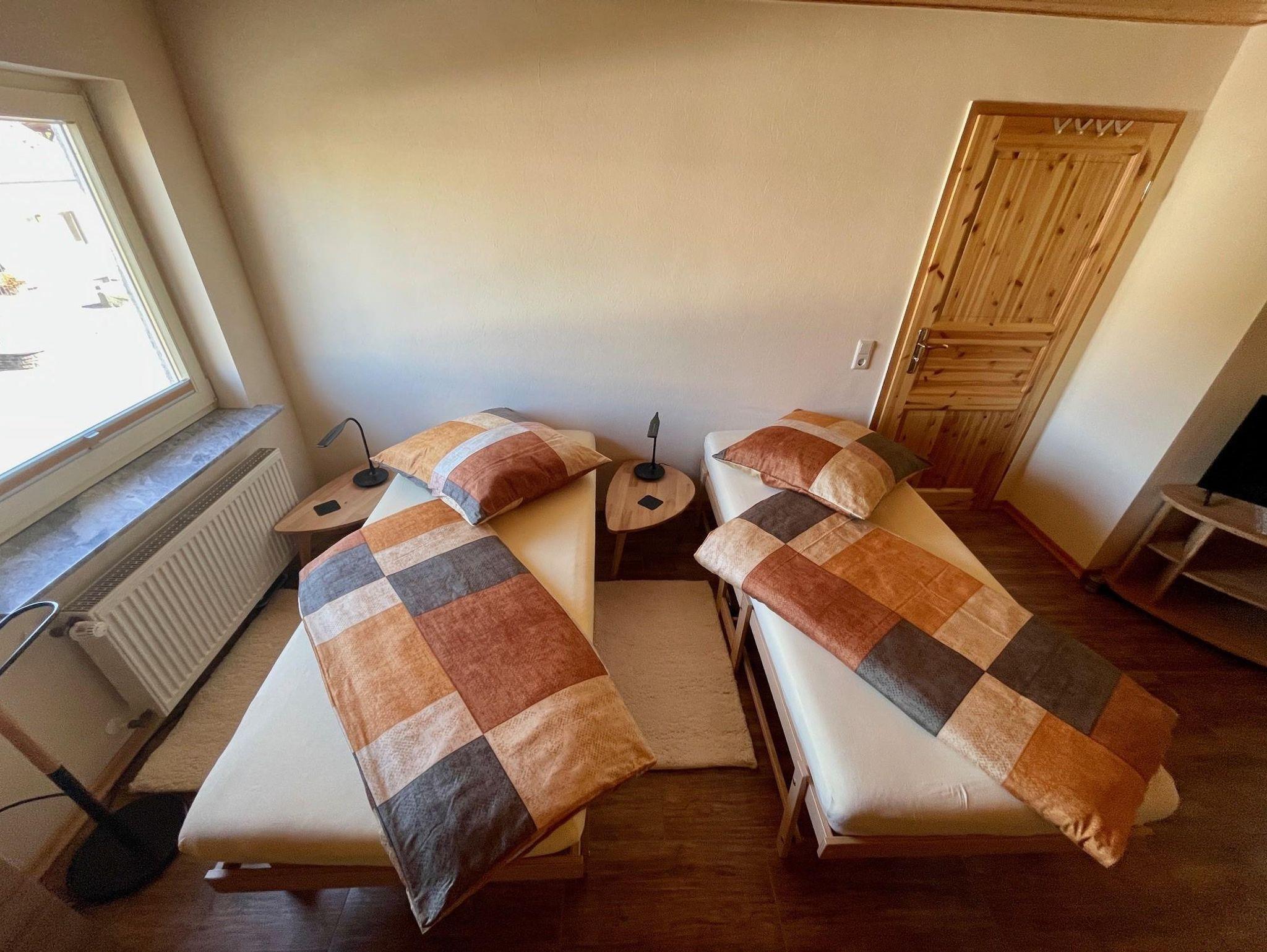 Zwei Einzelbetten kann man zu einem Doppelbett zusammenstellen. Hier ist zusätzlich ein Fernseher verfügbar.