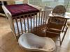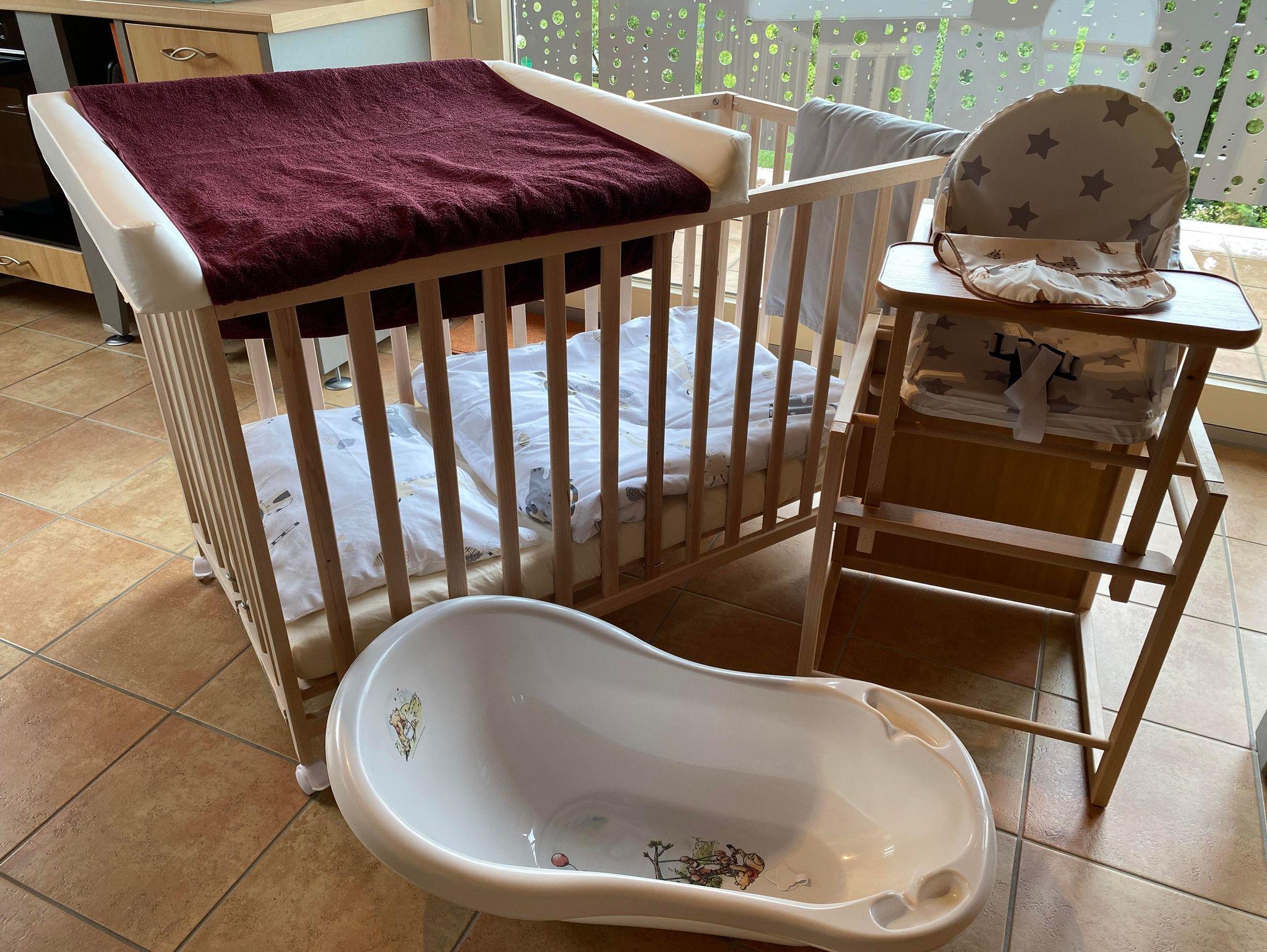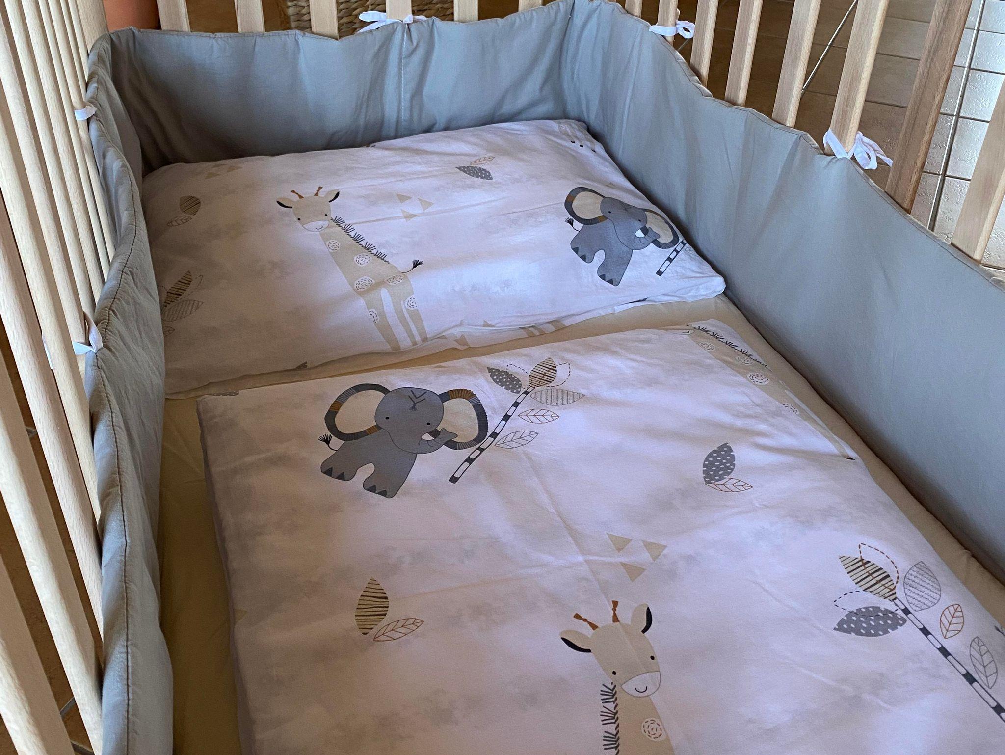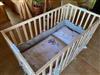 Zwei fahrbare, höhenverstellbare Kinderbetten mit dazugehöriger Bettwäsche und Nestchen (für Säuglinge/ Kleinkinder bis zu ca. 3 Jahren), ist auch als Laufstall nutzbar.