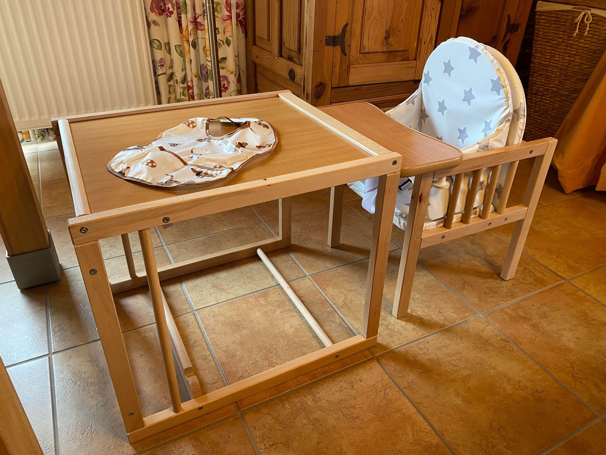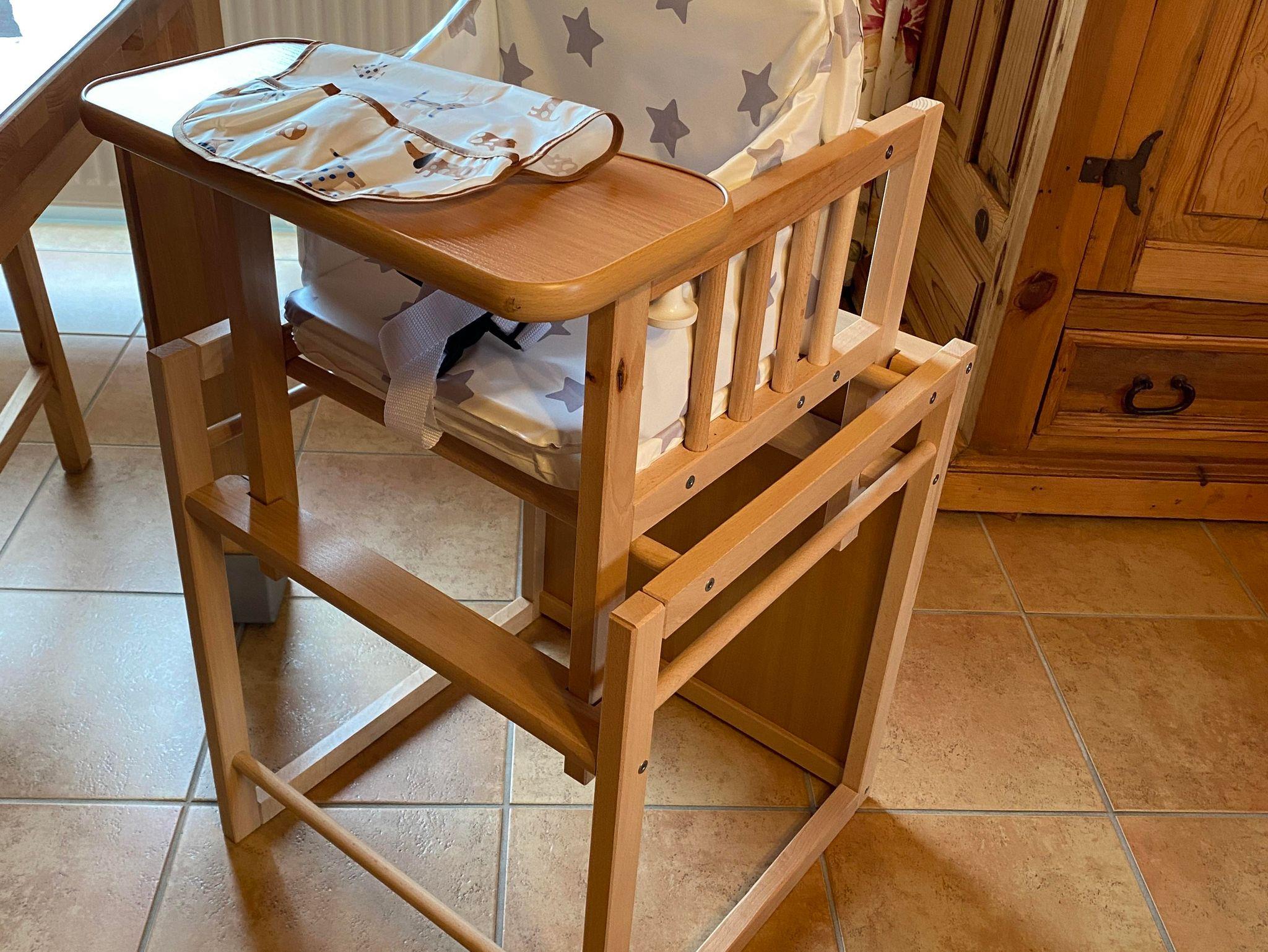 Ein Kinderkombihochstuhl (für Säuglinge/ Kleinkinder bis zu ca. 3 Jahren) den man z. B. auch zu einer flexiblen Einheit mit Tisch und Stuhl umbauen kann.