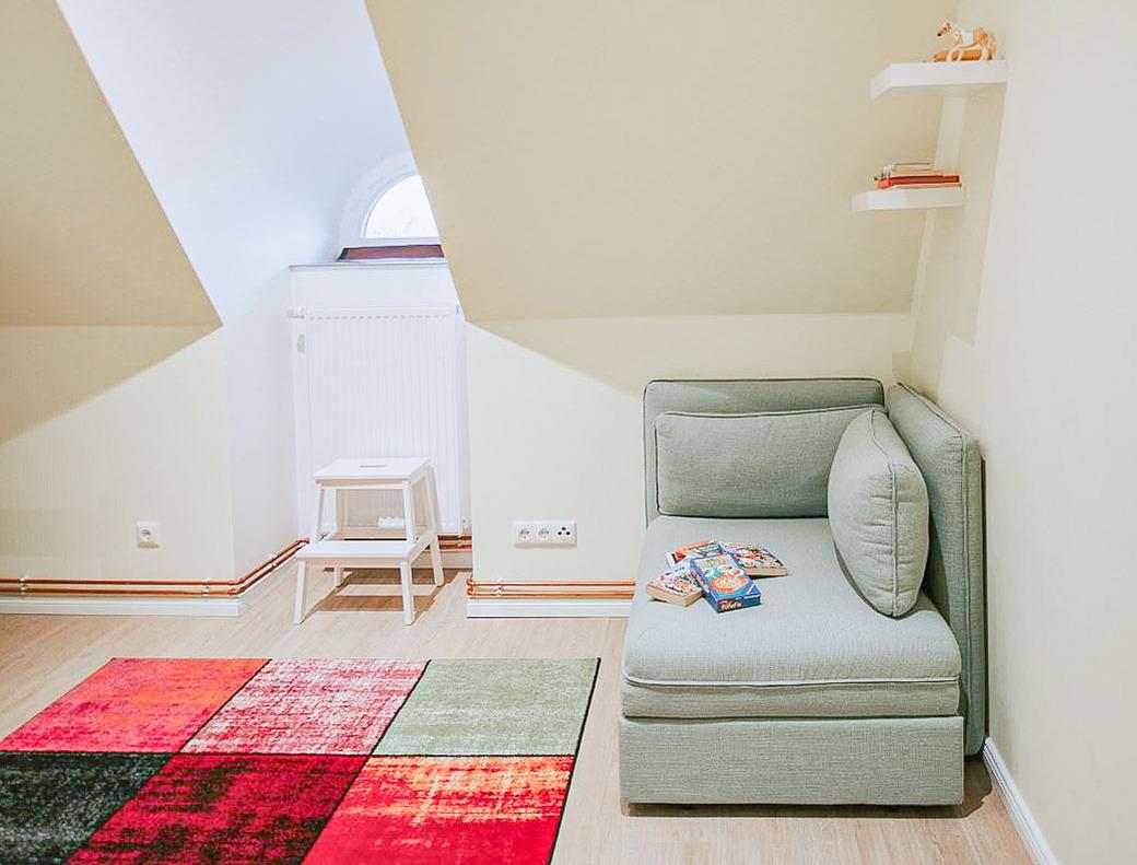 sogar zu einem dritten Schlafplatz werden. Ein großer, bunter Teppich lädt zum Spielen, Toben und kreativ sein ein.