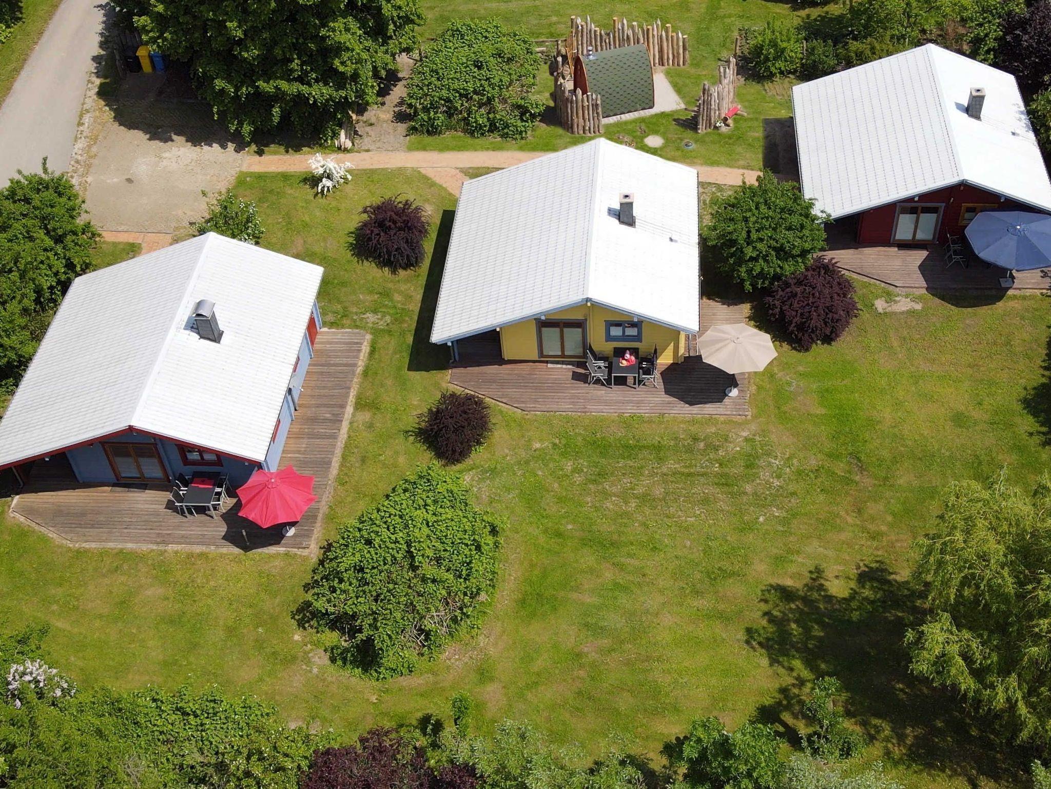 Auf dem 1600m² großen Grundstück stehen drei je 50m² große Holzhäuser - Ostsee Land Ferienhäuser mit Kamin, Podsauna und Waschmaschine.