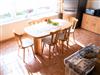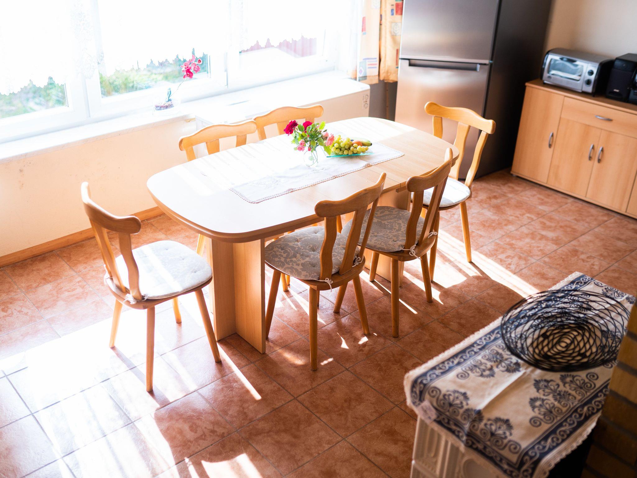 Das 110qm große Ferienhaus erstreckt sich über drei Etagen. Sie betreten das Haus über die Seitentreppe und die überdachte Terrasse. Es begrüßt Sie ein heller offener Essbereich mit einer kleinen Küchenzeile, die alle wichtigen Küchengeräte und -utensilien für Sie bereithält. Ein großer Kühlschrank mit Tiefkühlfach, ein 4-Platten-Herd, ein Geschirrspüler, Wasserkocher, Toaster und Kaffeemaschine sowie genügend Geschirr, Besteck und Kochutensilien sind vorhanden. Ein Esstisch mit 6 Stühlen sowie ein alter Kachelofen machen den Raum zu einem gemütlichen Ort der Begegnung. Von hier können Sie den Blick in den Garten schweifen lassen oder vor dem Flachbild-Fernseher gemeinsam relaxen. Auf dieser Etage befindet sich ein kleines Bad mit WC und einer kleinen Dusche, die durch einen Vorhang platzsparend in das kleine Bad integriert ist. Über eine Steintreppe gelangen Sie in die untere Etage - hier befinden sich die beiden Schlafzimmer sowie das Bad mit Dusche und WC. Das erste Schlafzimmer ist mit einem Doppelbett und einem Kleiderschrank versehen und bietet einen direkten Zugang in den Garten. Hinter dem Vorhang unter der Treppe sind für unsere kleinsten Mitreisenden ein Kinderreisebett und ein Kinderhochstuhl untergebracht. Das zweite Schlafzimmer ist mit insgesamt 4 Schlafmöglichkeiten ausgestattet: Hier befinden sich zwei längst hintereinander stehende Einzelbetten sowie ein Doppelstockbett und ein Kleiderschrank. Auch von hier können Sie den Blick in den Garten genießen. Eine weitere Holztreppe führt Sie vom Essbereich in das Dachgeschoss. Der holzverkleidete Raum ist das Herzstück des Hauses. Dort befinden sich eine ausziehbare gemütliche Schlafcouch, ein Sessel und ein Kindersessel sowie ein weiteres TV-Gerät. Dieser Wohnraum, der für gemeinsame Spiele- und Familienabende ideal geeignet ist, kann auch als Schlafraum genutzt werden. Im Flurbereich am Eingang vor dem Bad befindet sich eine kleine Waschmaschine, die Sie gerne nutzen können. Auf der windgeschützten überdachten Terrasse können Sie in den warmen Monaten Ihre Mahlzeiten genießen - der großzügige Esstisch mit 6 Stühlen bietet genügend Platz. Weiterhin stehen Ihnen zwei Liegestühle zur Verfügung, die Sie mit in den garten nehmen können.