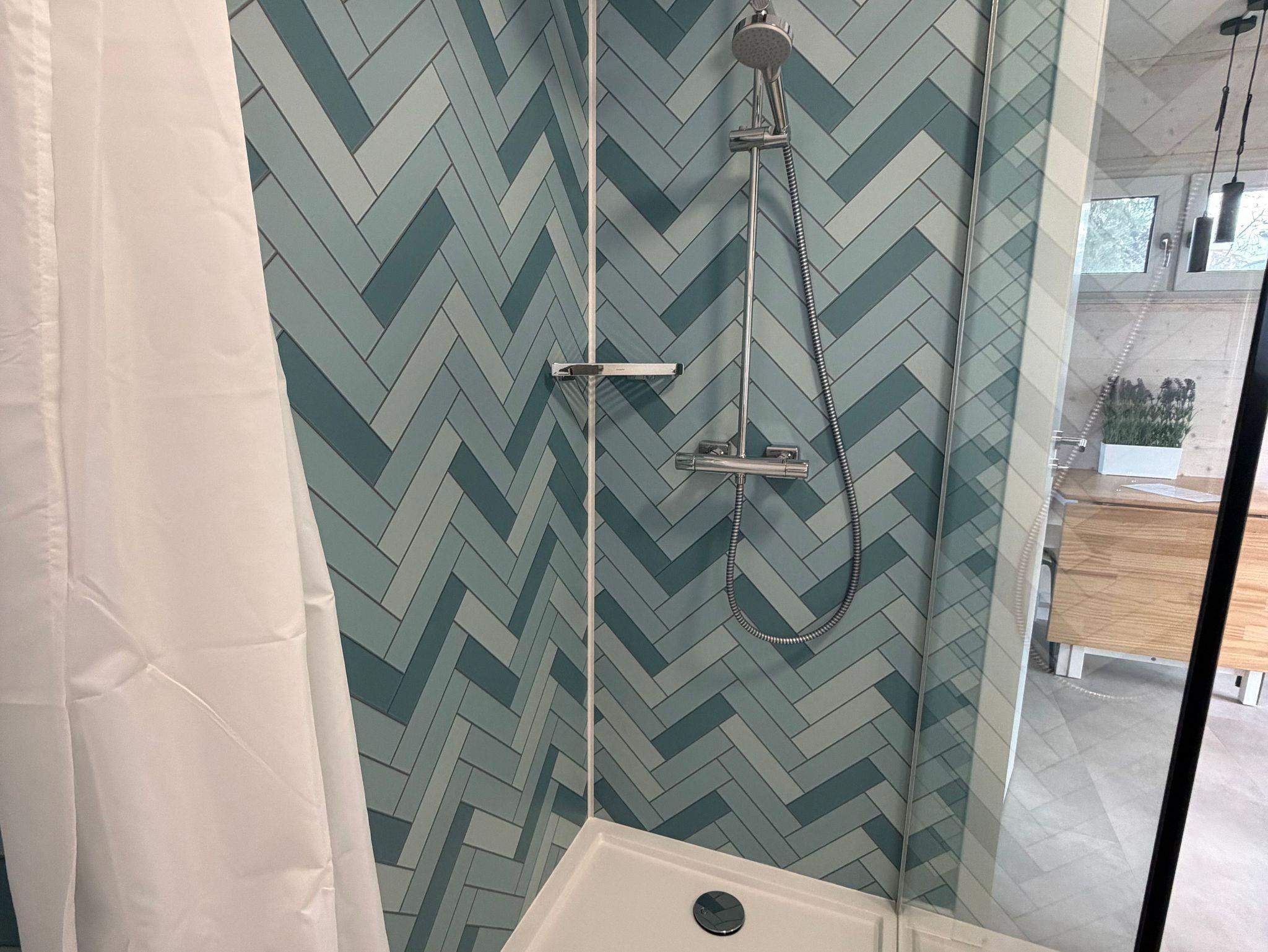 Das moderne Badezimmer verfügt über Dusche, Waschbecken, WC sowie einen 80-Liter-Boiler für warmes Wasser.
