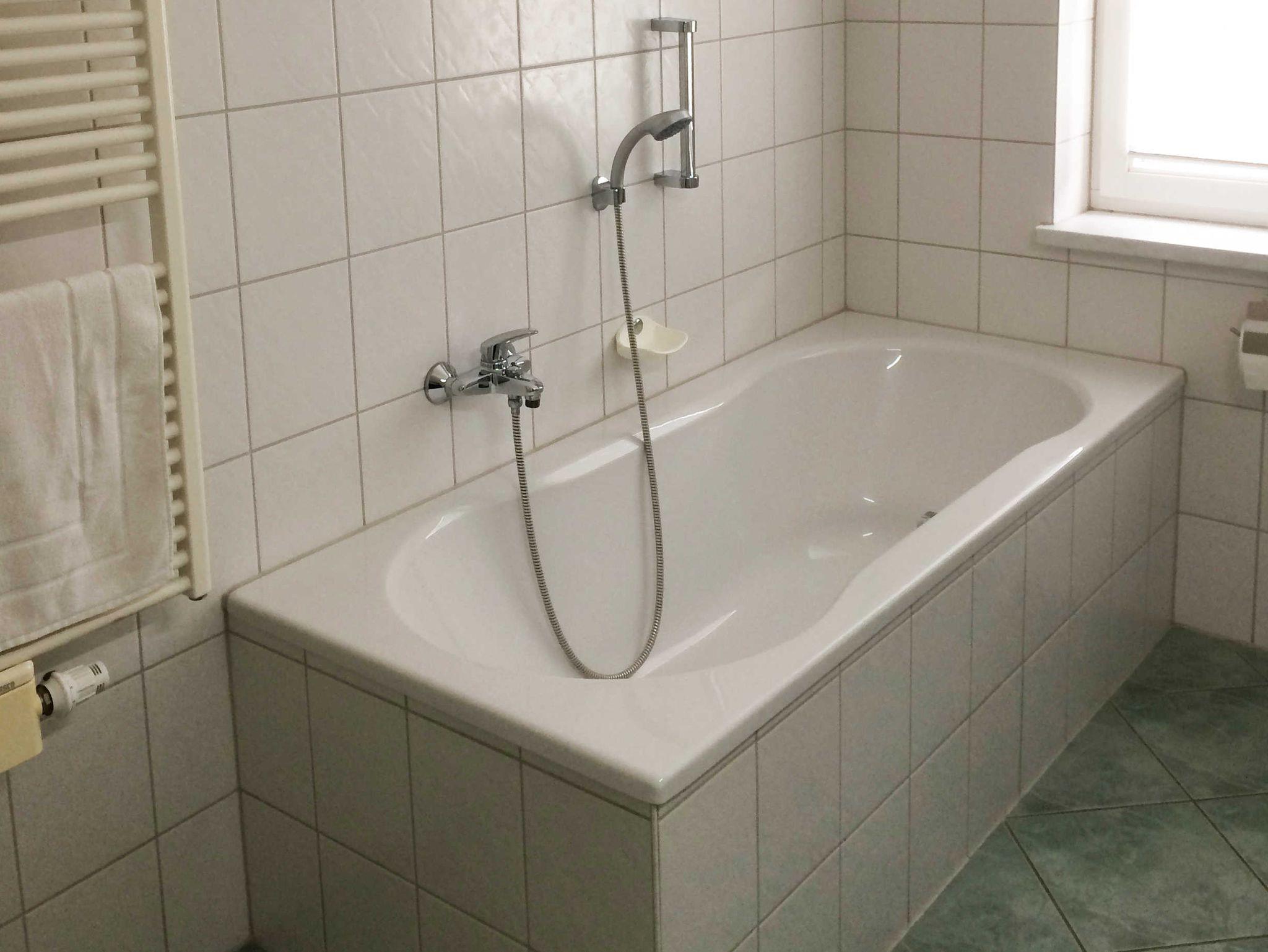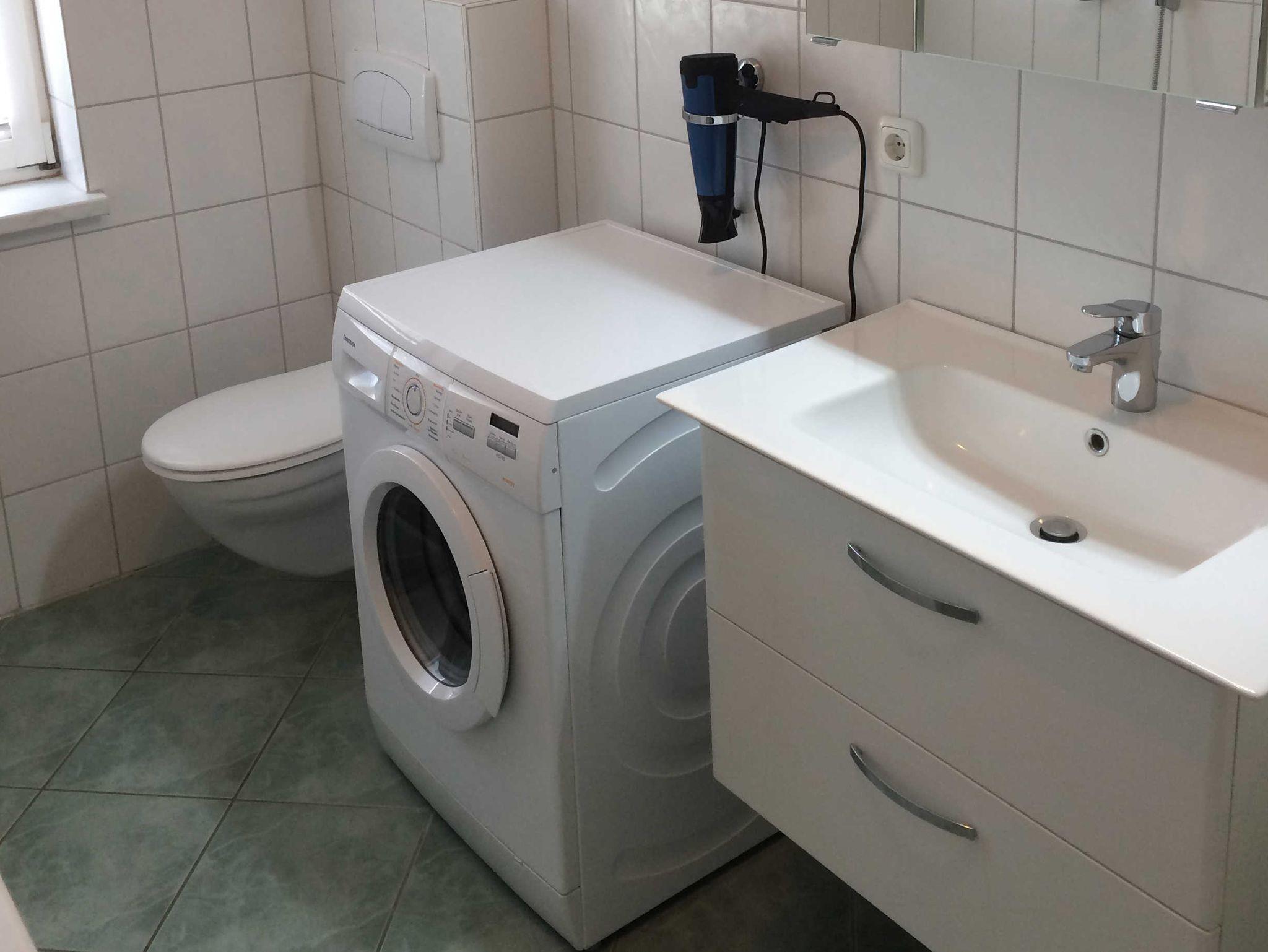 Das Bad ist mit Dusche, Badewanne, Föhn und WC ausgestattet, außerdem steht ein Waschmaschine (gegen Gebühr) zur Verfügung.