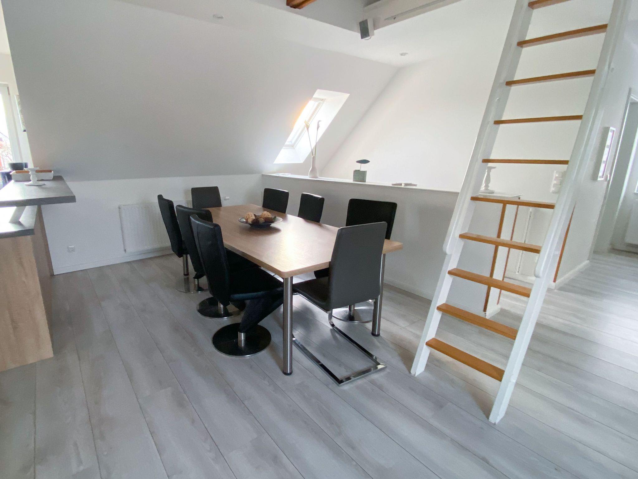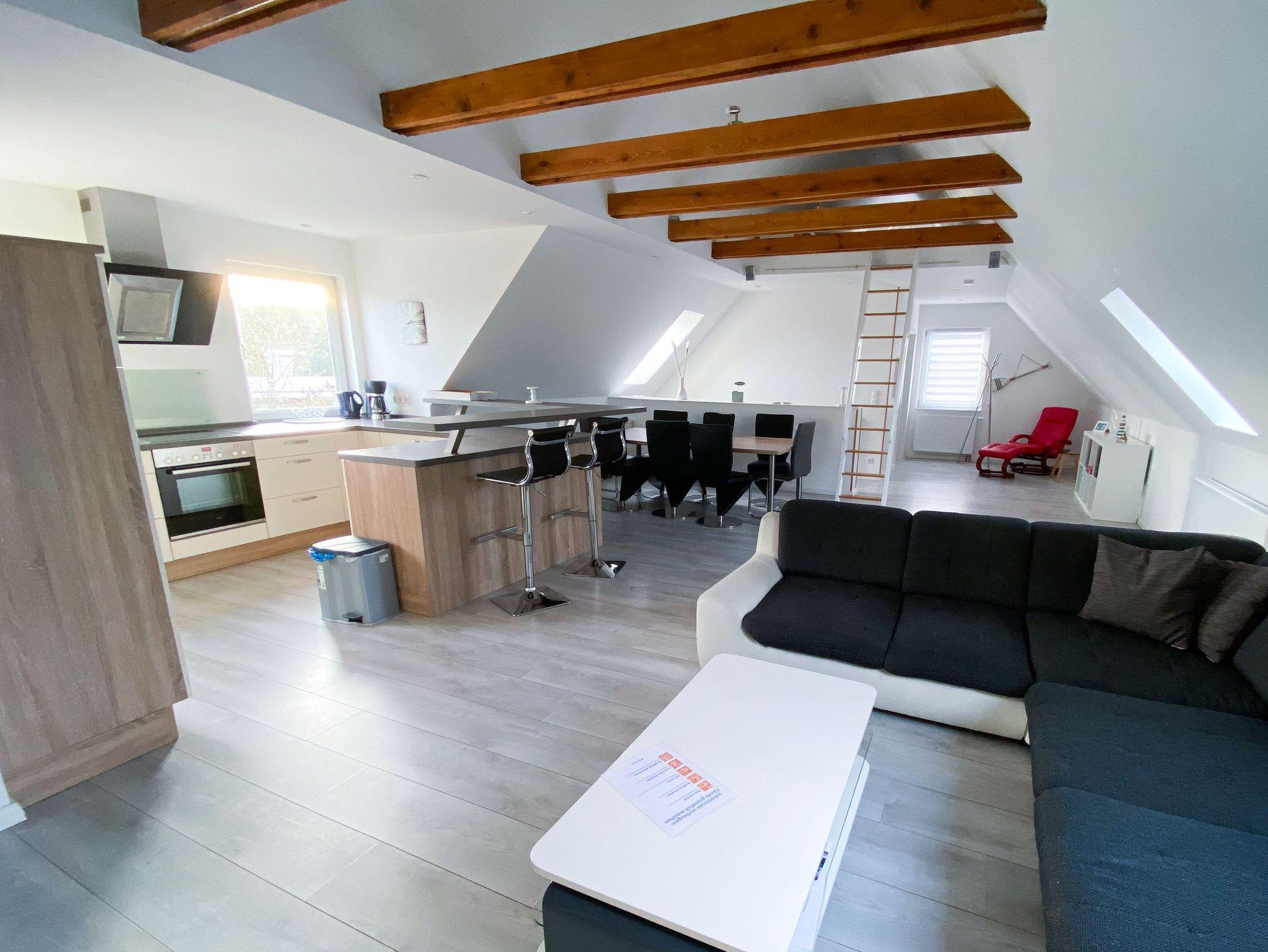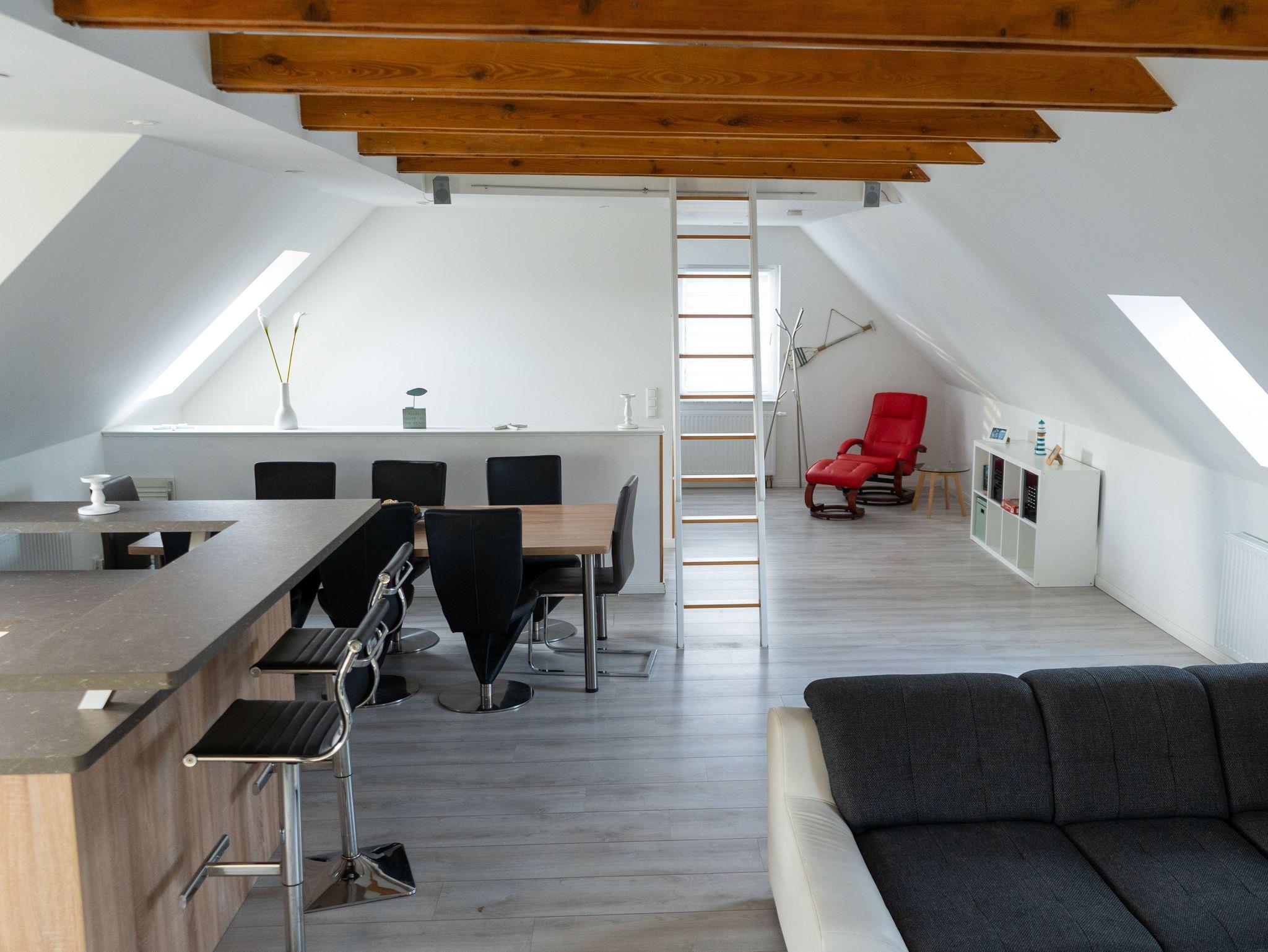 Die großzügige 120 m² Ferienwohnung befindet sich im Haupthaus und erstreckt sich über das gesamte Dachgeschoss. Sie bietet Platz für bis zu 8 Personen und überzeugt mit einer komfortablen Ausstattung, die keine Wünsche offenlässt.