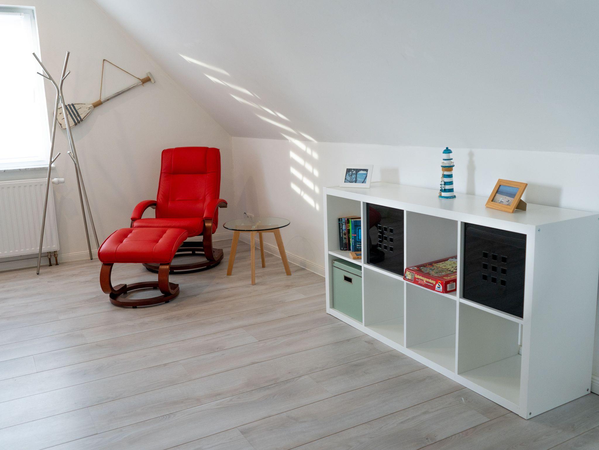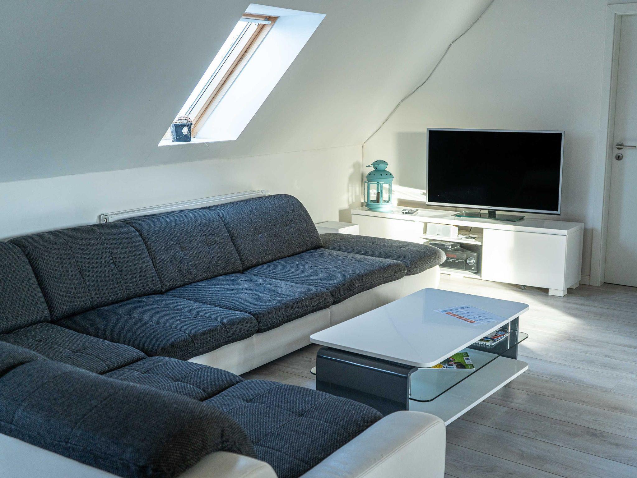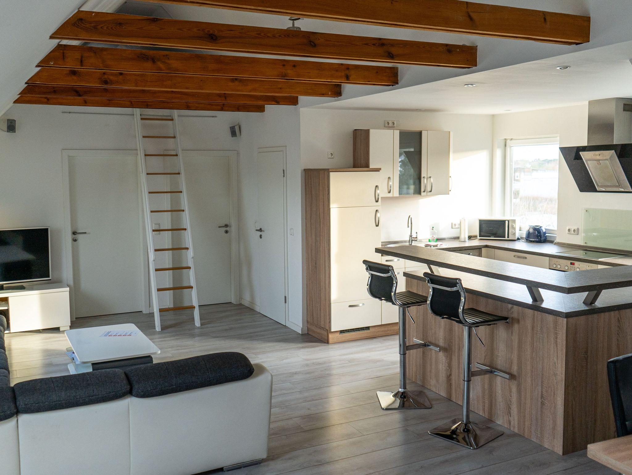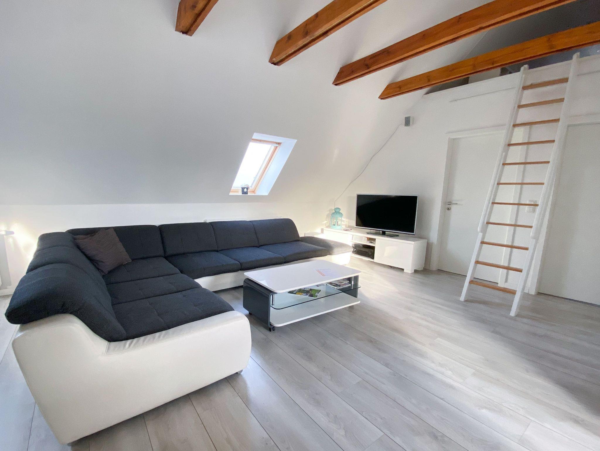 Die großzügige 120 m² Ferienwohnung befindet sich im Haupthaus und erstreckt sich über das gesamte Dachgeschoss. Sie bietet Platz für bis zu 8 Personen und überzeugt mit einer komfortablen Ausstattung, die keine Wünsche offenlässt.