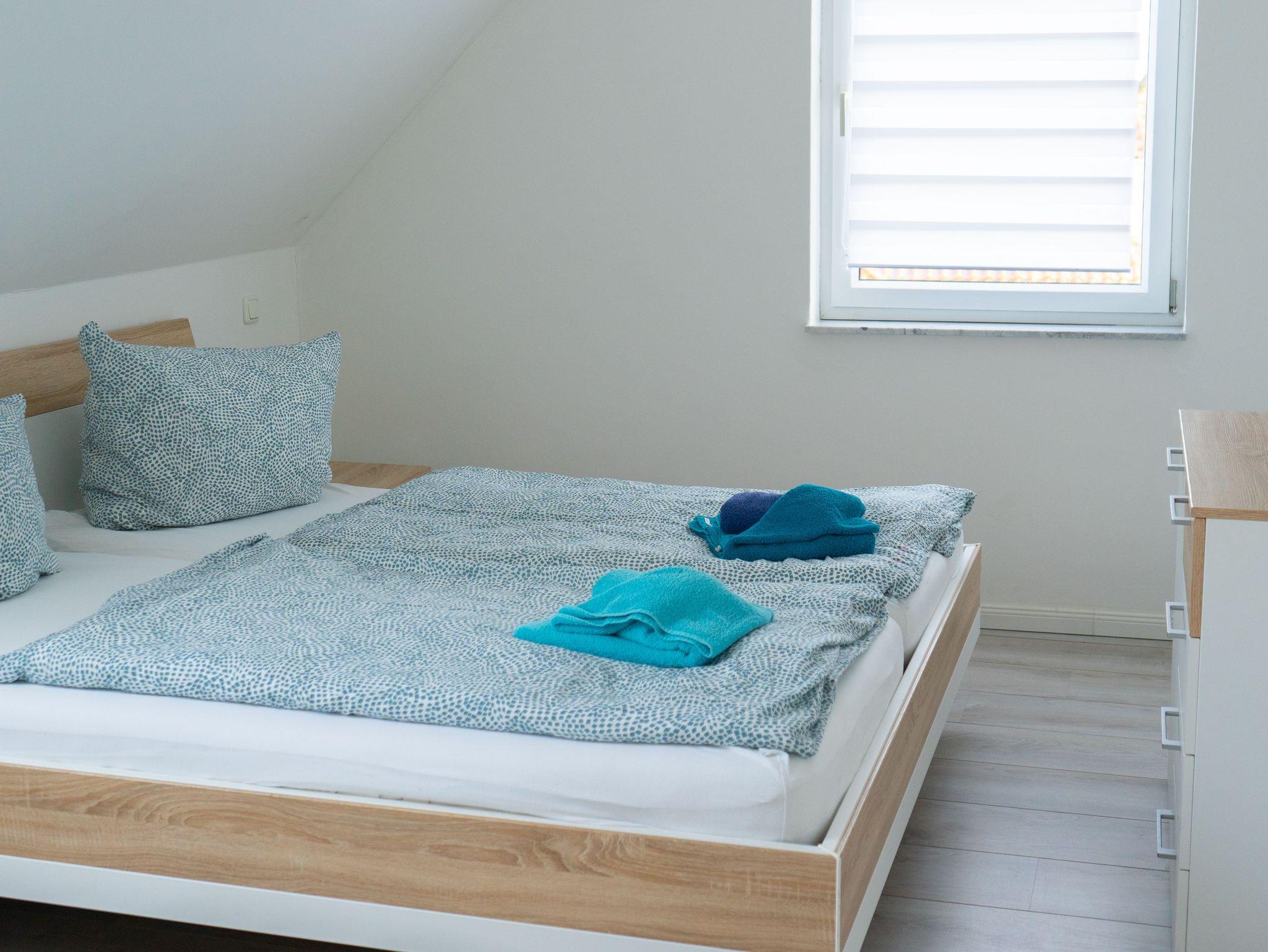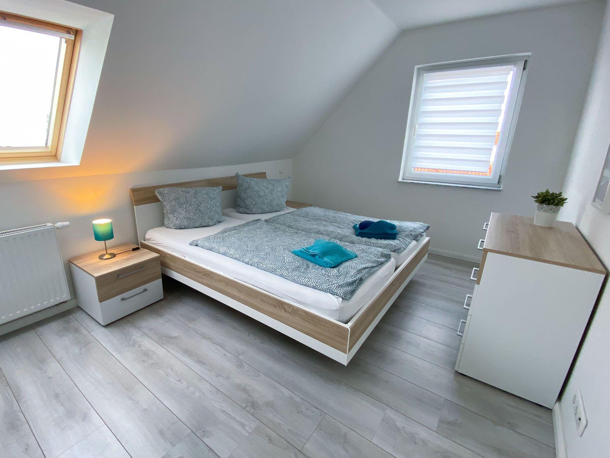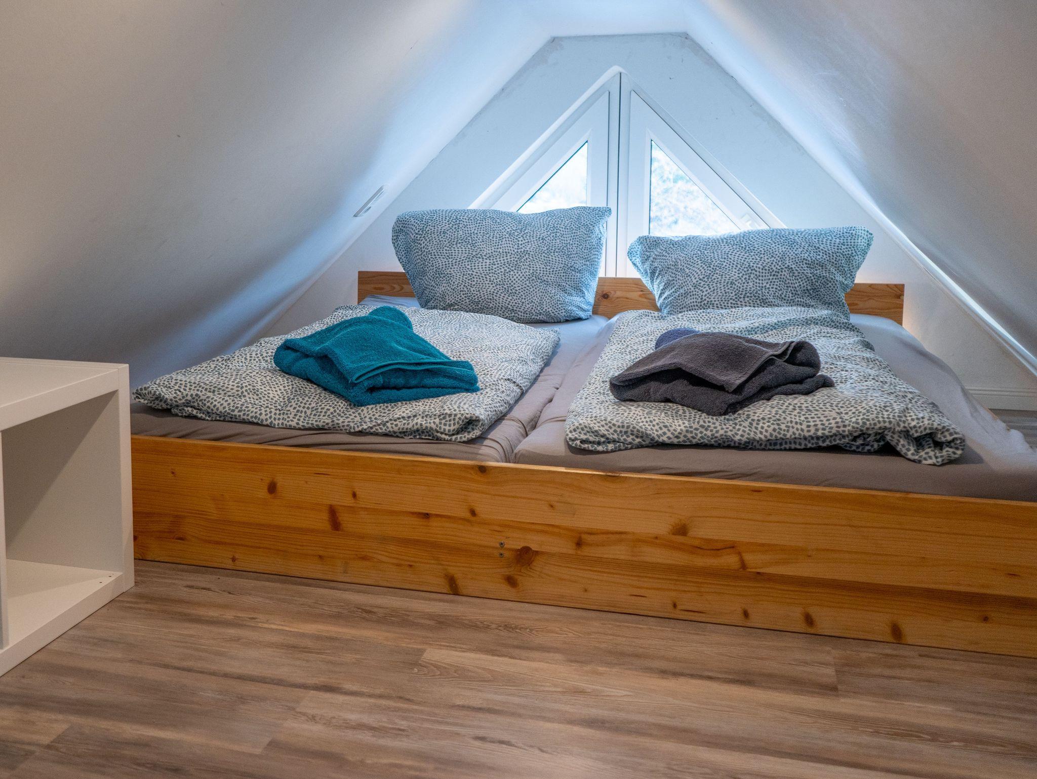 Für erholsamen Schlaf sorgen zwei Schlafzimmer mit jeweils einem Doppelbett (200 × 200 cm, getrennte Matratzen). Zusätzlich gibt es in den beiden ausgebauten Dachgiebeln vier weitere Schlafplätze (90 × 200 cm, jeweils zwei Matratzen nebeneinander). Diese Bereiche sind über eine Leiter erreichbar; die Deckenhöhe beträgt dort ca. 1,40 m und eignet sich besonders für Kinder oder Jugendliche.