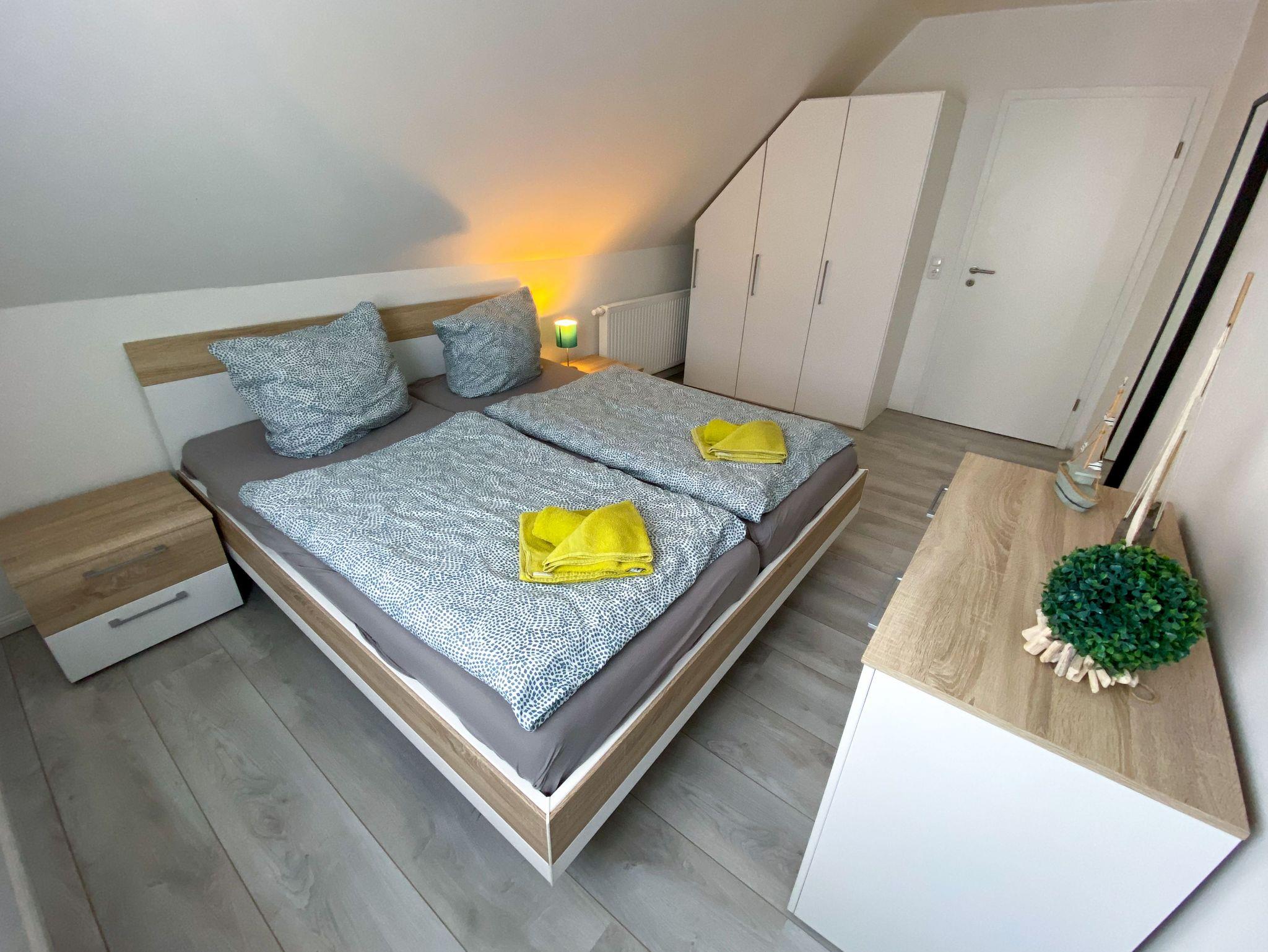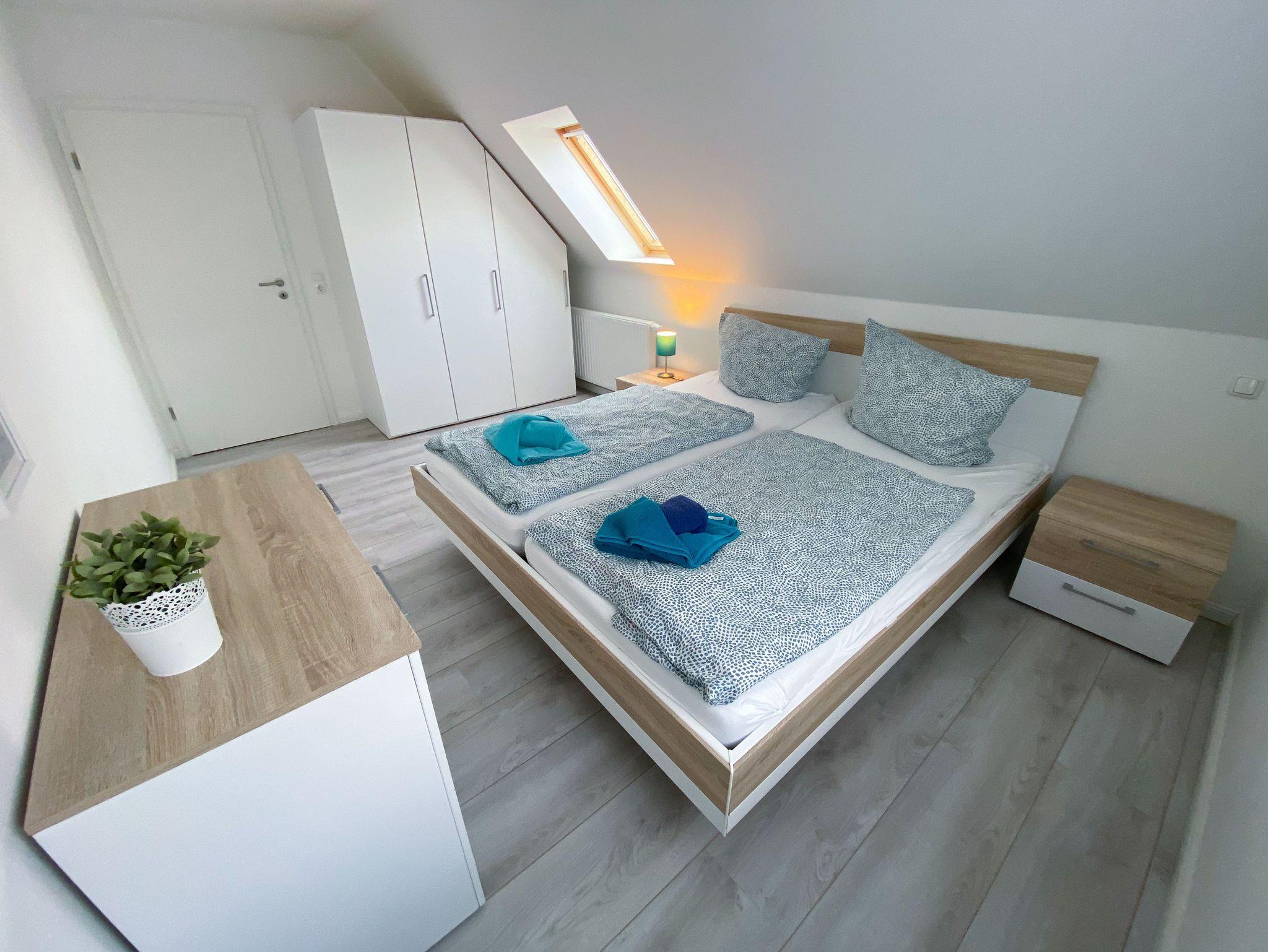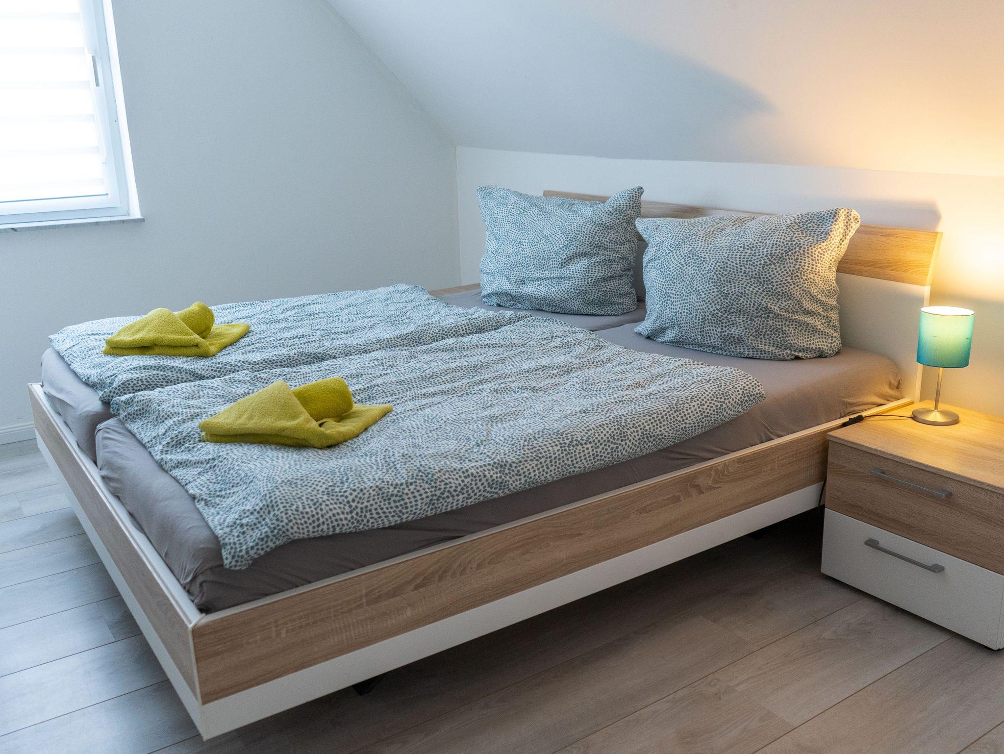 Für erholsamen Schlaf sorgen zwei Schlafzimmer mit jeweils einem Doppelbett (200 × 200 cm, getrennte Matratzen). Zusätzlich gibt es in den beiden ausgebauten Dachgiebeln vier weitere Schlafplätze (90 × 200 cm, jeweils zwei Matratzen nebeneinander). Diese Bereiche sind über eine Leiter erreichbar; die Deckenhöhe beträgt dort ca. 1,40 m und eignet sich besonders für Kinder oder Jugendliche.