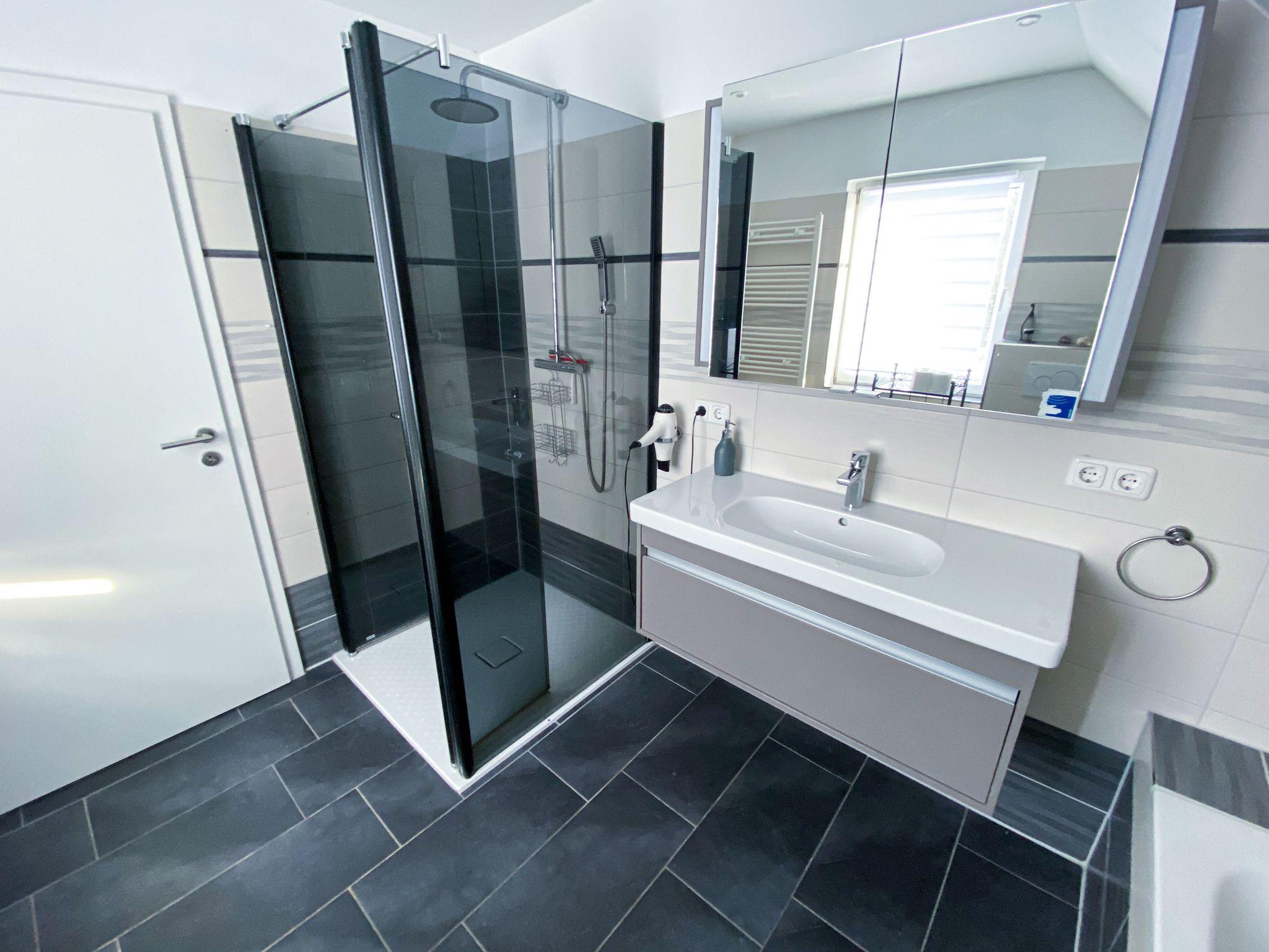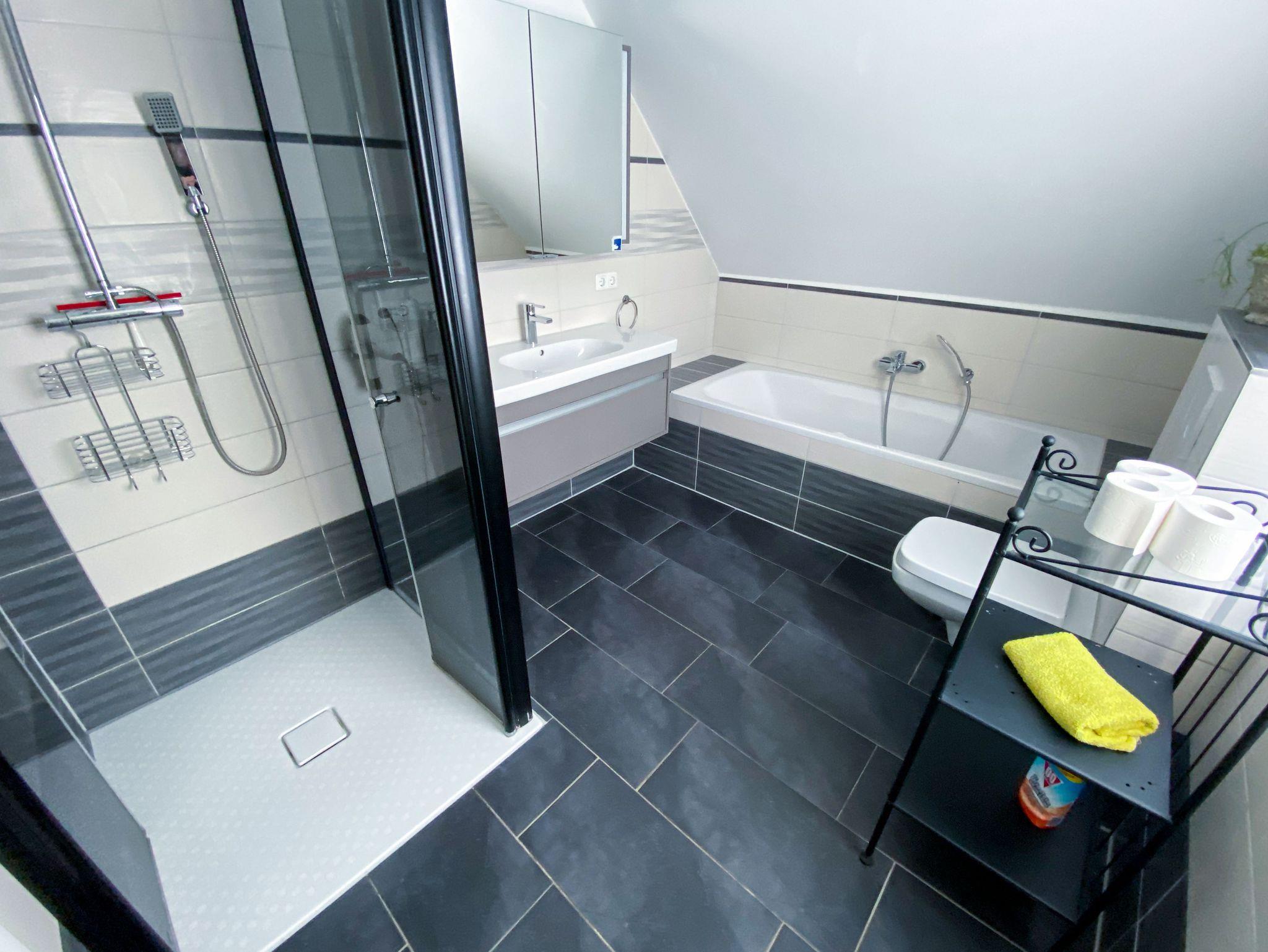 Das helle Badezimmer verfügt über Dusche und Badewanne. Ein zusätzliches Gäste-WC bietet weiteren Komfort.