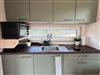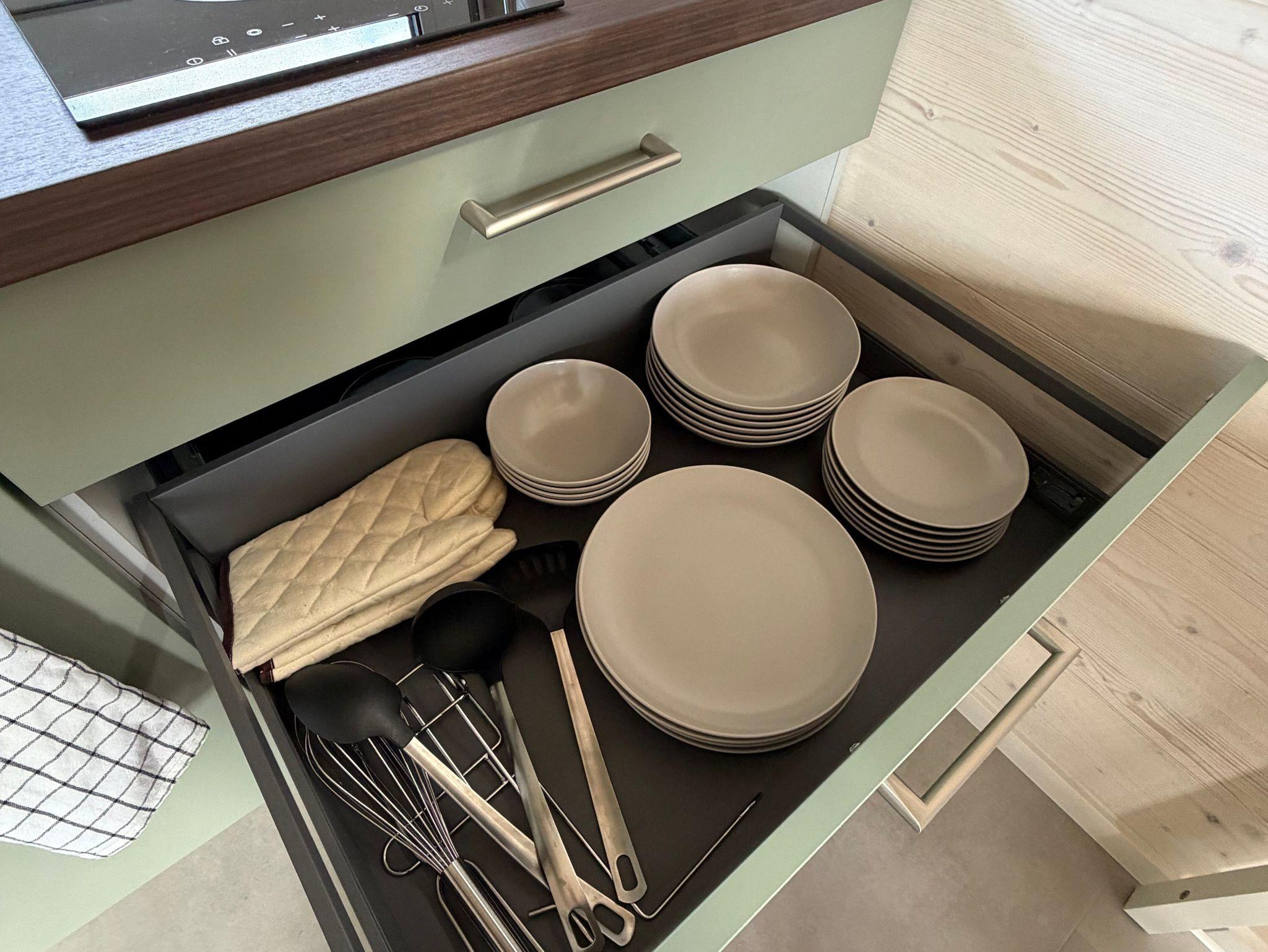 Die moderne Küchenzeile ist mit einem 2-Platten-Ceranfeld, kleinem Backofen, Wasserkocher, Kaffeemaschine und Kühlschrank ausgestattet. Am praktischen Esstisch finden bis zu vier Personen Platz. Die Küche ist vollständig ausgestattet, sodass Sie sich bequem selbst versorgen können.
