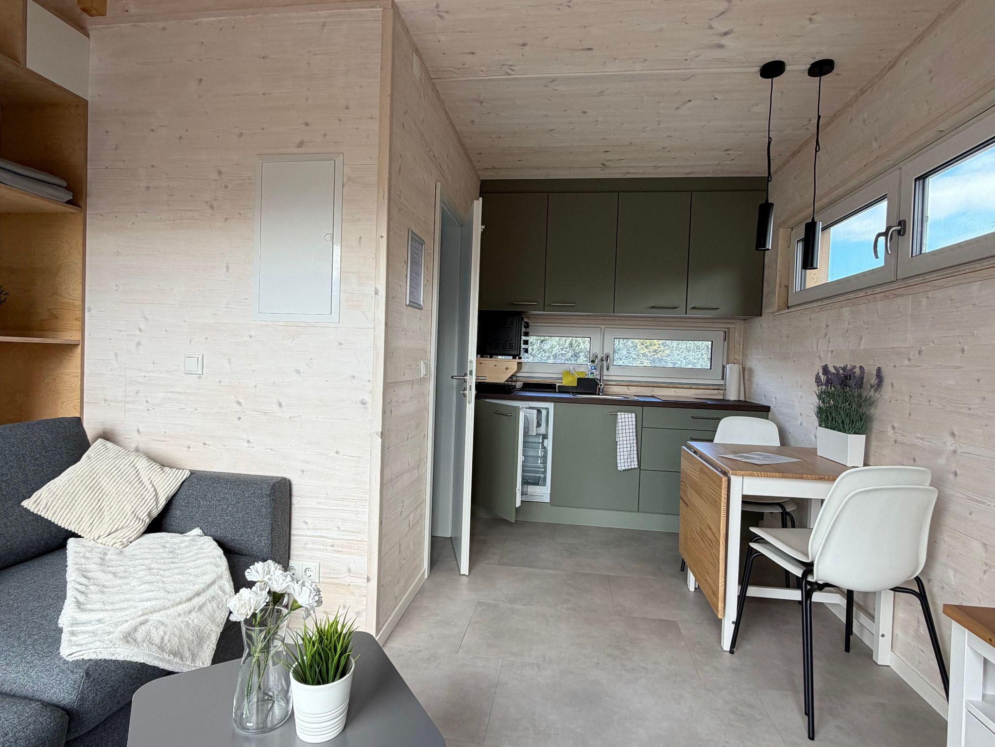 Unser modernes Tiny House in ökologischer Holzbauweise bietet auf ca. 35 m² Platz für bis zu 4 Personen. Freu dich auf stilvolles Design, eine voll ausgestattete Küche, gemütliche Schlafplätze, Klimaanlage (Heizen & Kühlen) und eine sonnige Terrasse.