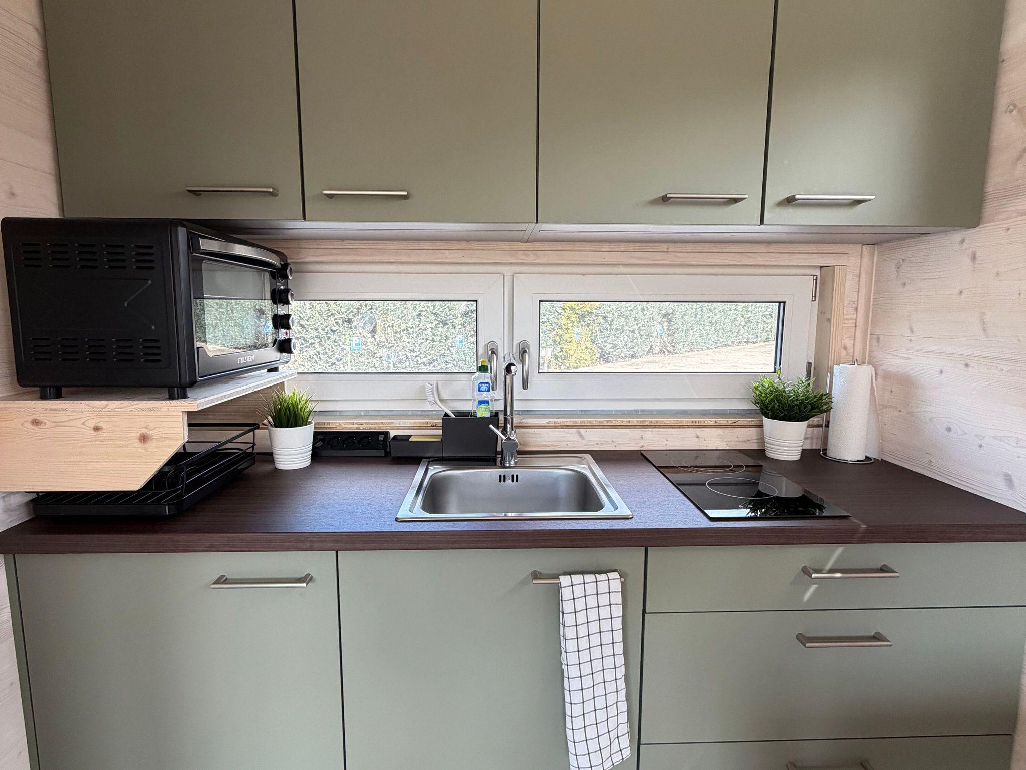 Zusammen mit der Schlafcouch im Wohnbereich (140 cm breit, mit Matratze) bietet das Tiny House Platz für maximal 4 Gäste. Für besonderen Schlafkomfort stellen wir Ihnen Decken in Übergröße (220 x 155 cm) zur Verfügung.