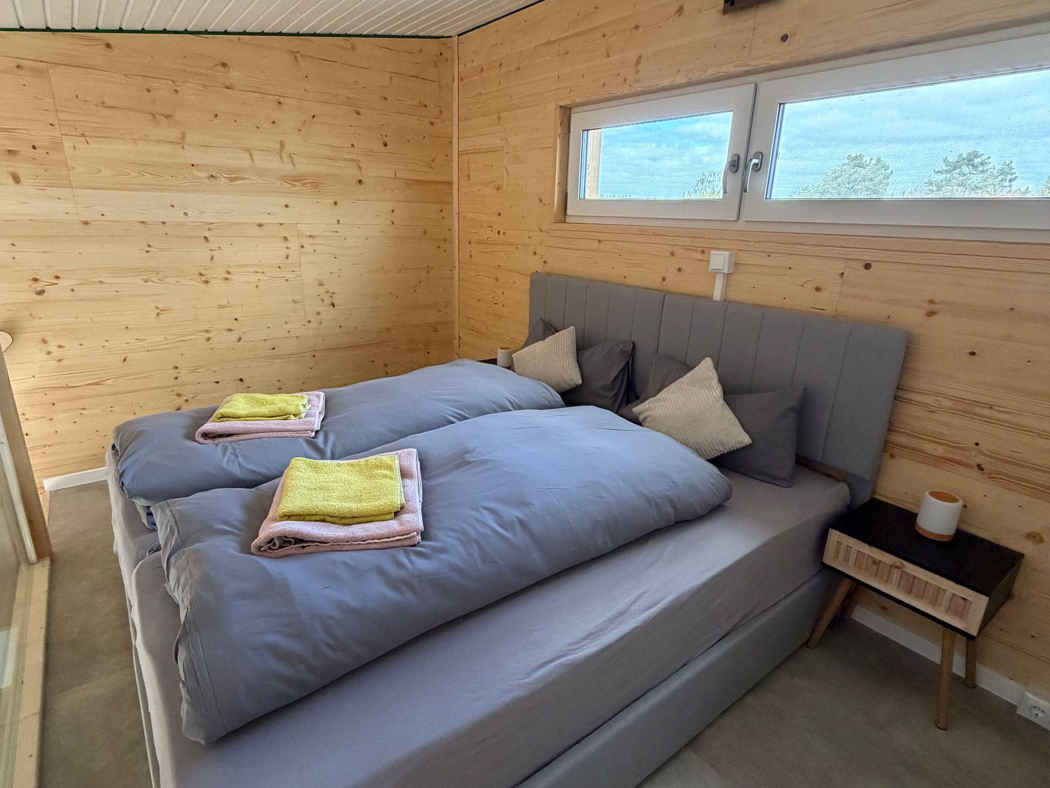 Über eine Treppe mit integriertem Stauraum erreichen Sie das Schlafzimmer im Obergeschoss. Dort erwartet Sie ein komfortables Doppelbett (180 x 200 cm). Dieses besteht aus zwei Einzelbetten (je 100 x 200 cm), die bei Bedarf auseinandergezogen werden können so kann jeder Gast in einem eigenen Bett schlafen.
