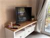 Ein heller Wohnraum mit großer Fensterfront, Schlafcouch (140 cm Breite, mit Matratze) und Fernseher sorgt für Gemütlichkeit. Von hier gelangen Sie direkt auf die möblierte Terrasse ideal für Mahlzeiten im Freien oder entspannte Abende.