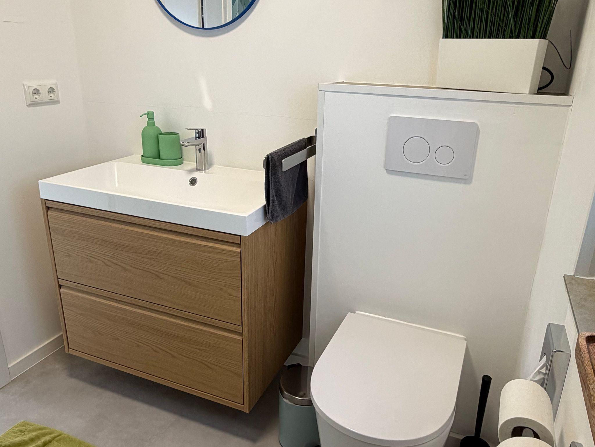 Das moderne Badezimmer verfügt über Dusche, Waschbecken, WC sowie einen 80-Liter-Boiler für warmes Wasser.