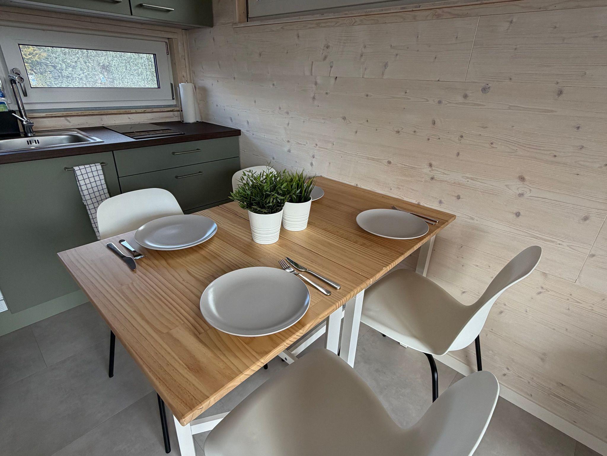 Die moderne Küchenzeile ist mit einem 2-Platten-Ceranfeld, kleinem Backofen, Wasserkocher, Kaffeemaschine und Kühlschrank ausgestattet. Am praktischen Esstisch finden bis zu vier Personen Platz. Die Küche ist vollständig ausgestattet, sodass Sie sich bequem selbst versorgen können.