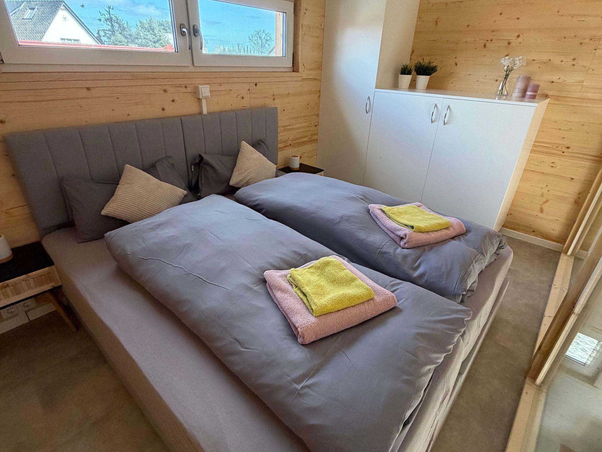 Über eine Treppe mit integriertem Stauraum erreichen Sie das Schlafzimmer im Obergeschoss. Dort erwartet Sie ein komfortables Doppelbett (180 x 200 cm). Dieses besteht aus zwei Einzelbetten (je 100 x 200 cm), die bei Bedarf auseinandergezogen werden können so kann jeder Gast in einem eigenen Bett schlafen.