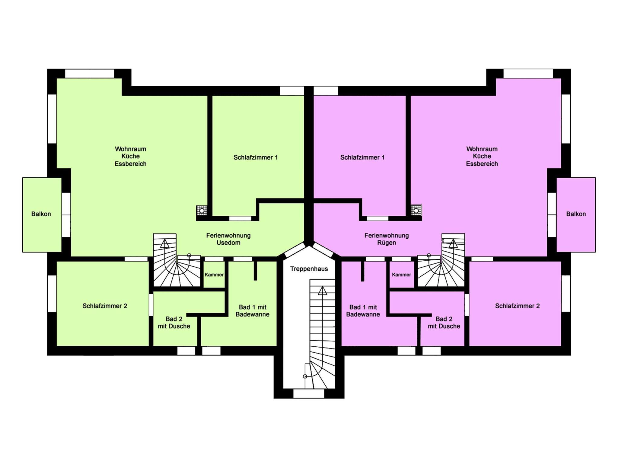 Die zwei Ferienwohnungen im Obergeschoss verfügen jeweils über einen Wohnraum mit integriertem Küchen- und Essbereich und Kaminofen, vier separaten Schlafzimmern mit Balkonen und drei Bädern. Die Ferienwohnung Usedom hat einen 40m² großen Saunabereich mit Dusche, Ruheliegen und Balkon.