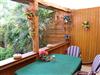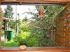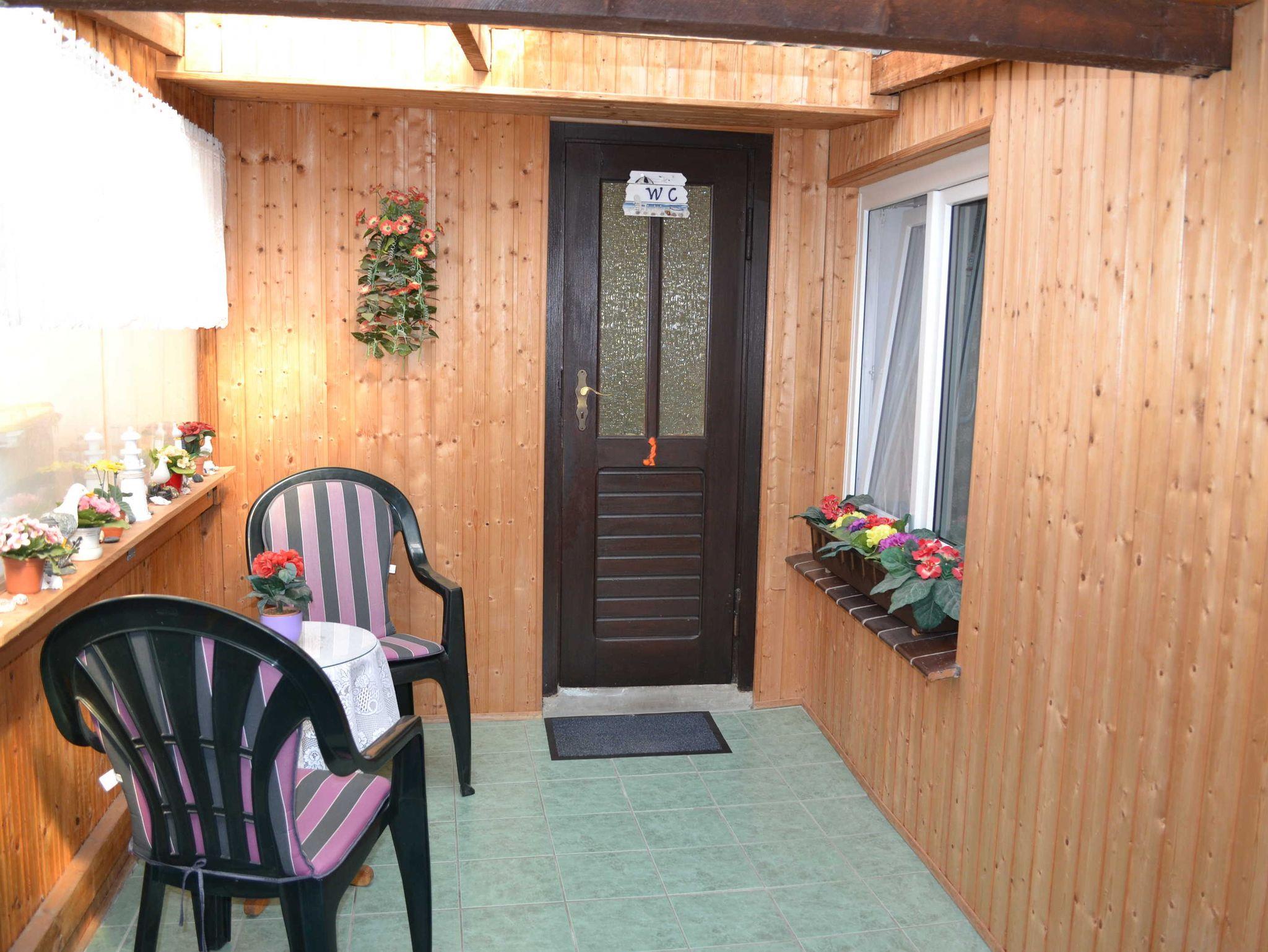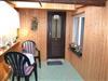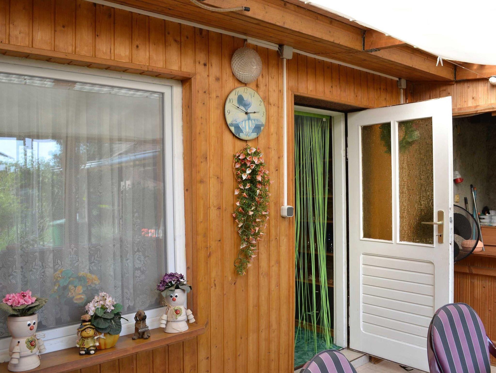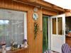 Über die Veranda mit Sitzgruppe gelangt man in die Küche und in das Bad sowie in einen kleinen Flur, der zum Schlafraum und zum Wohnraum führt. Vom Wohnraum aus kommt man auf eine überdachte Terrasse mit Gartenblick.