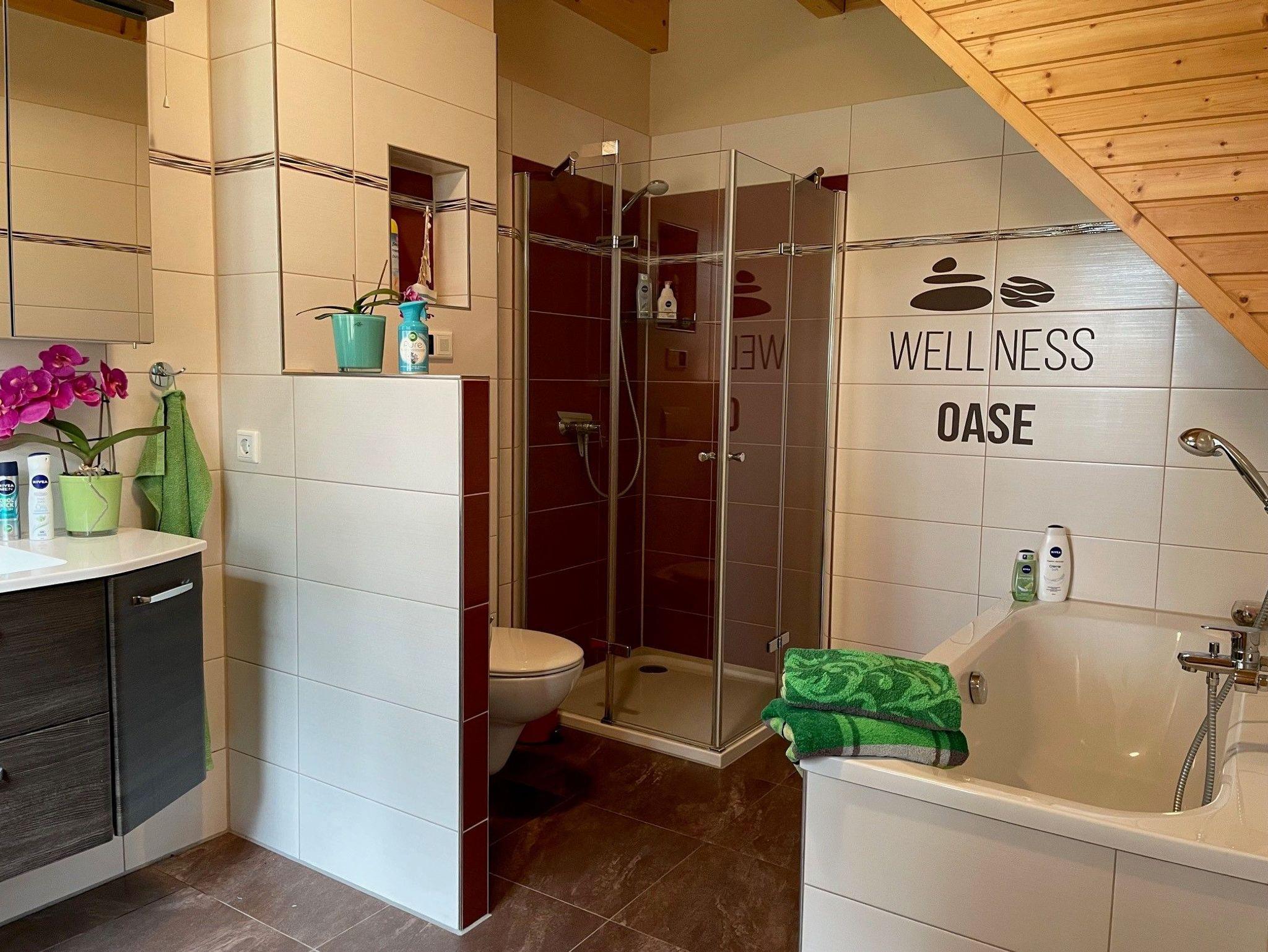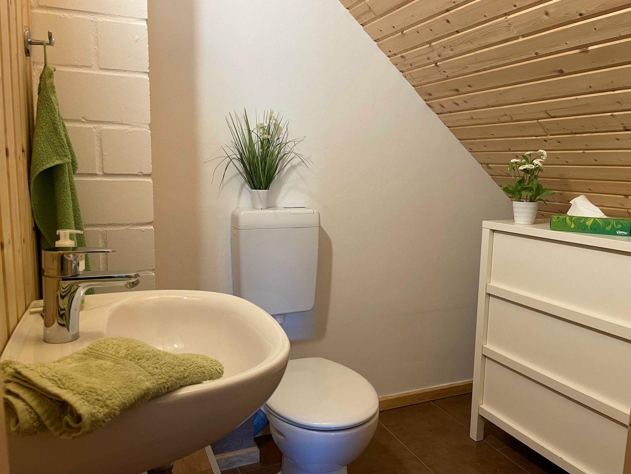 Der Wohn-/ Essbereich ist mit gemütlicher Sitzecke, TV, Radio und Kamin inkl. Kaminholz, Esstisch für 6 Personen, offene Küche mit Kühlschrank, Tiefkühlschrank, Geschirrspüler, ausreichend Geschirr, Elektroherd, Backofen, Mikrowelle, Toaster, Wasserkocher und Kaffeemaschine ausgestattet. Außerdem befinden sich im Erdgeschoss ein Schlafzimmer mit Doppelbett, großem Schrank und TV- Gerät sowie ein modernes Badezimmer mit Dusche/ WC und Badewanne.