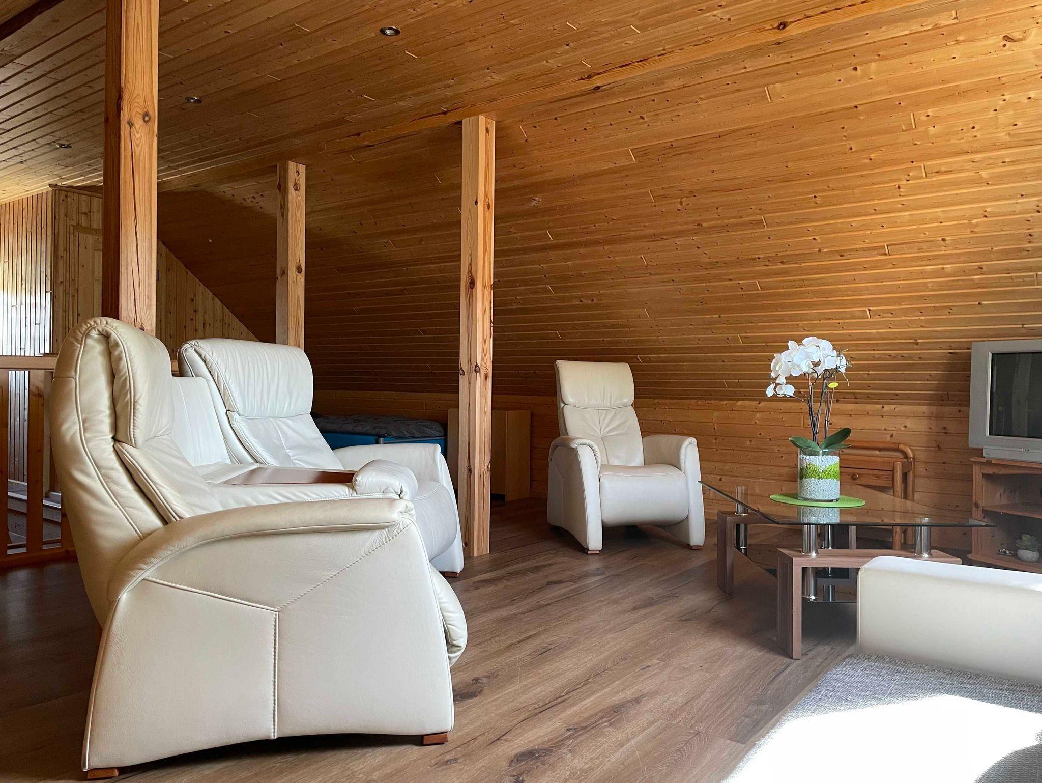 Hier befindet sich ein Wohn-/ Schlafbereich mit Sitzecke und TV, zwei Einzelbetten sowie ein kleines Gäste- WC.