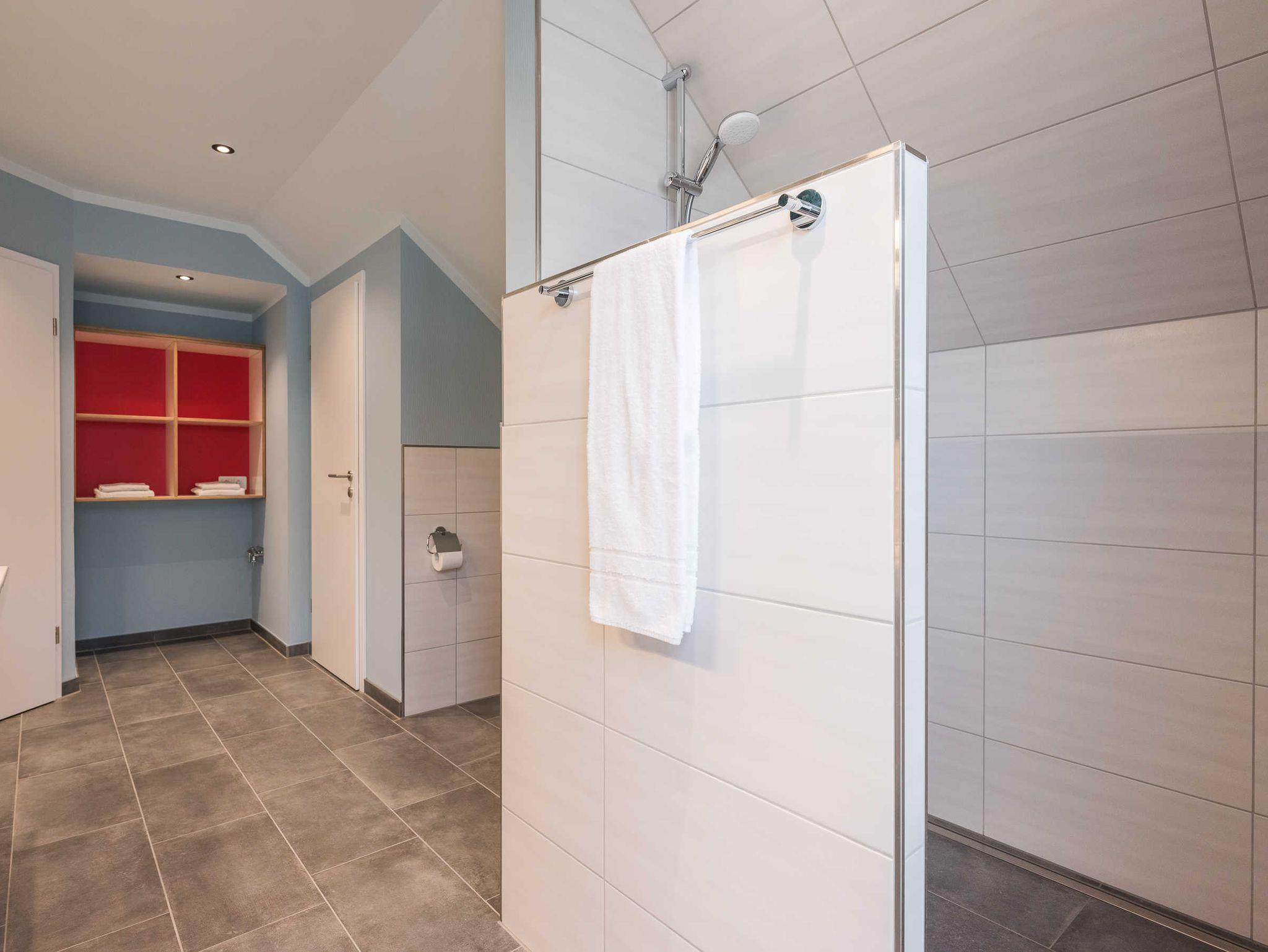 große, ebenerdige Dusche, Handtuchtrockner, WC, doppelter Waschtisch, Föhn