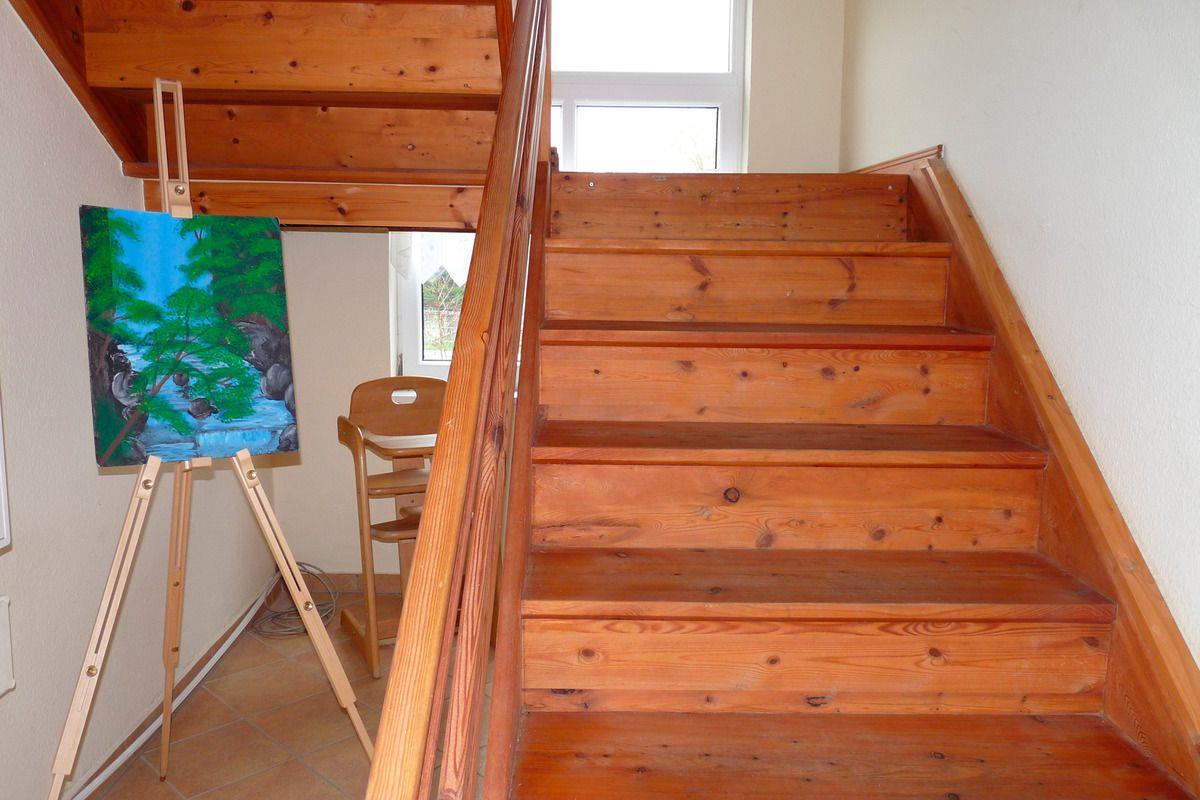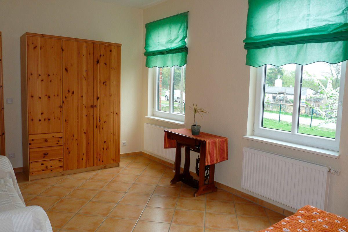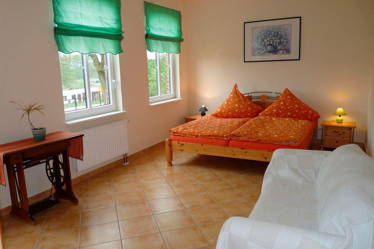 Die Ferienwohnung befindet sich im Haus auf der gesamten unteren Etage. Über das Treppenhaus betreten Sie den Flur. Dort stehen eine Flurgarderobe mit Spiegel und Schuhschrank. Im Wohnzimmer mit der offenen Küche ist eine große Eckschlafcouch, ein kleiner Tisch, ein Sessel, ein halbhoher Kleiderschrank, ein Regalteil mit dem TV und CD-Radio, sowie der Esstisch mit 6 Stühlen. In der Küche finden Sie alles was Sie brauchen. Die Einbauküche ist ausgestattet mit Spüle, Herd mit 4 Kochplatten, Kühlschrank, Kaffeemaschine, Wasserkocher und Toaster. Über den Flur gelangen Sie in das Bad mit WC, Badewanne und Duschvorhang. Durch das Bad gehen Sie in das Schlafzimmer. Darin stehen ein Doppelbett, eine Schlafcouch und ein Kleiderschrank. Vom Wohnzimmer aus gelangen Sie auf Ihre Terrasse. Hier finden Sie Gartenmöbel und einen Holzkohlegrill. Der Balkon der oberen Ferienwohnung wurde extra ohne Sichtkontakt zu ihrer Terrasse gebaut. Auf 2 Sonnenliegen können Sie sich überall im Garten entspannen. In Absprache mit der anderen Ferienwohnung können Sie gern die überdachte Terrasse auf dem Gelände und eine Feuerschale nutzen. Mitgebrachte Fahrräder oder Kanus können Sie unterstellen. Parkplätze sind direkt am Haus vorhanden.