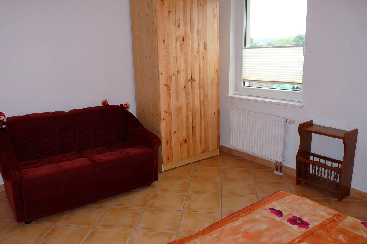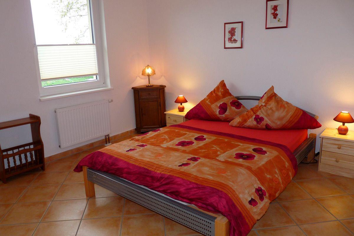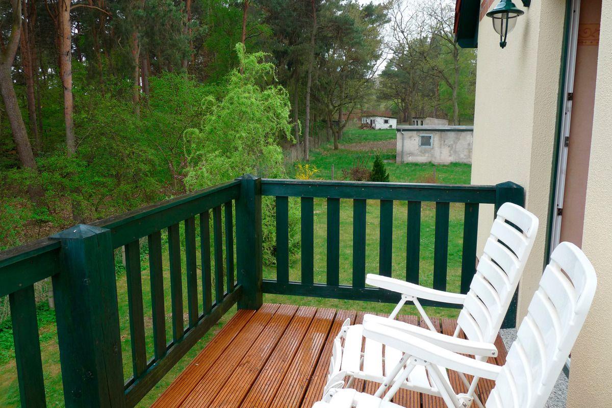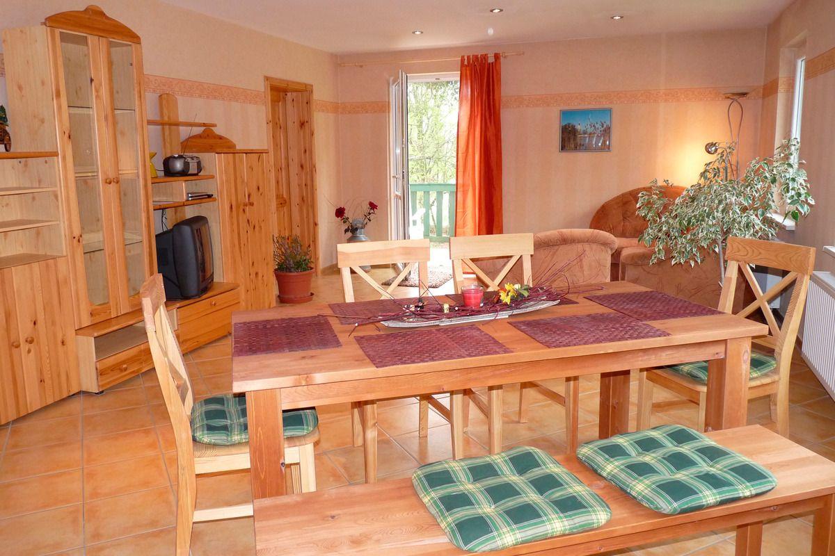 Die Ferienwohnung befindet sich auf der gesamten oberen Etage des Hauses. Über das Treppenhaus betreten Sie den Flur. Dort stehen eine Flurgarderobe mit Spiegel und Schuhschrank. Das Wohnzimmer mit der offenen Küche ist mit einer große Eckschlafcouch als Aufbettung für zwei Personen, einem kleinen Tisch, einem Sessel, einer Holzwohnwand mit dem Fernseher und CD-Radio, sowie dem Esstisch mit vier Stühlen und einer Bank eingerichtet. In der Küche finden Sie alles was Sie brauchen. Die Einbauküche ist mit Spüle, Herd mit 4 Kochplatten, Kühlschrank, Kaffeemaschine, Wasserkocher und Toaster ausgestattet. Vom Wohnzimmer aus kommen Sie in ein Schlafzimmer mit einem Doppelbett (zwei einzelne Matratzen) und einem Kleiderschrank. Über den Flur gelangen Sie in das Bad mit WC und Badewanne und in das zweite Schlafzimmer. Dieses ist mit einem Doppelbett (zwei einzelne Matratzen), einer Schlafcouch und einem Kleiderschrank möbliert. Vom Wohnzimmer aus erreichen Sie den ca. 10 m² großen Balkon mit Terrassenmöbeln. In Absprache mit der anderen Ferienwohnung können Sie gern die überdachte Terrasse auf dem Gelände, mit Gartenmöbel und Holzkohlegrill, und die Feuerschale nutzen. Mitgebrachte Fahrräder oder Kanus können Sie unterstellen. Parkplätze sind direkt am Haus vorhanden.