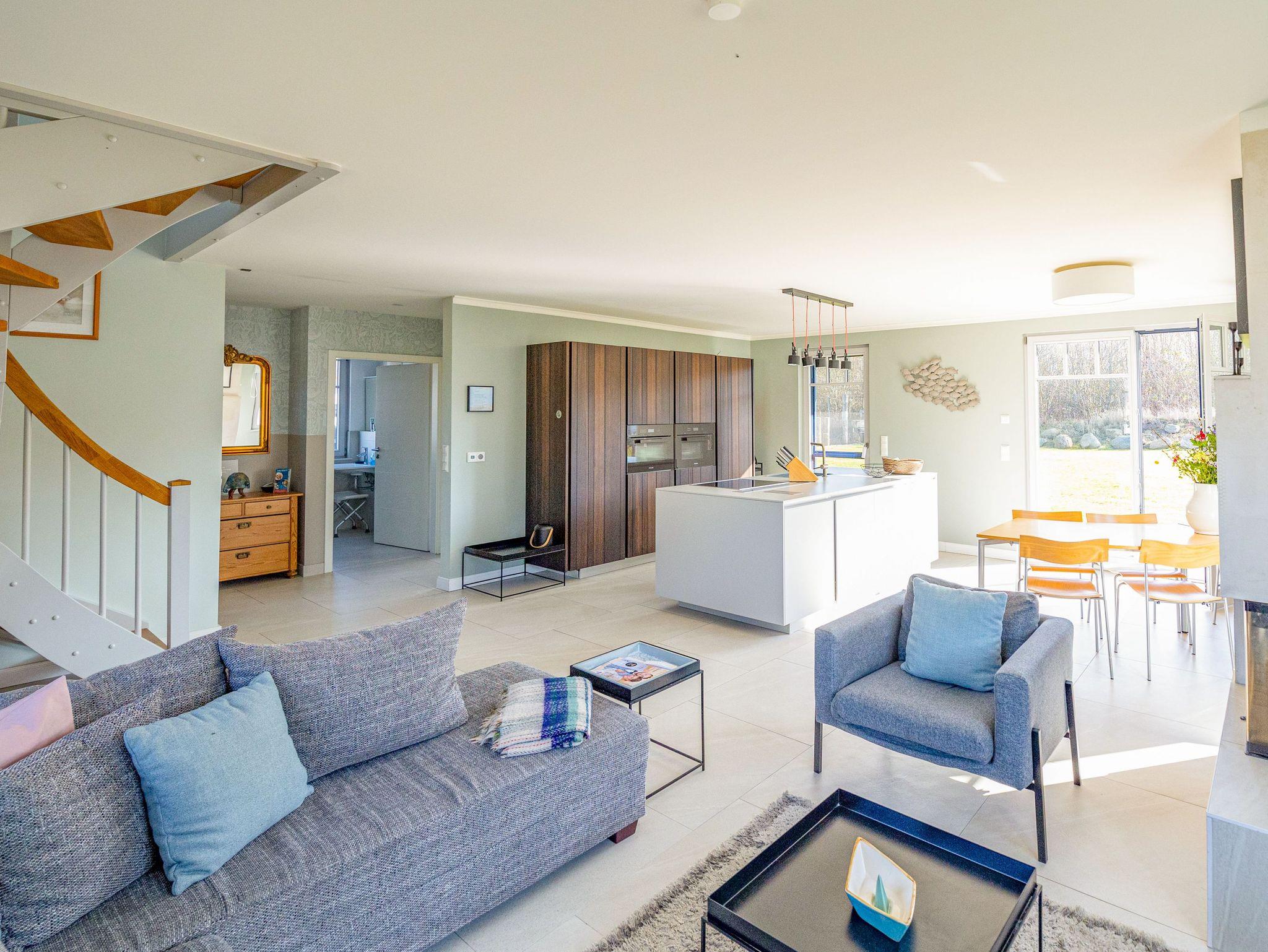 Das exklusive Reetdachhaus in Parow erstreckt sich über zwei Etagen und bietet auf 133 m² modernen Komfort und einladenden Charme. Der großzügige Wohnbereich im Erdgeschoss ist der ideale Ort zum Entspannen: Hier findest du ein gemütliches Sofa (140x200), einen TV und einen Kamin, der für eine angenehme Atmosphäre sorgt. Der Esstisch bietet Platz für gemeinsame Mahlzeiten und grenzt an die offene Küche, die hochwertig mit allem ausgestattet ist, was du brauchst: Herd, Kühlschrank mit Gefrierfach, Spülmaschine, Kaffeemaschine, Dampfgarer, Backofen, Toaster und Wasserkocher. Besonders für Familien mit Kindern ist der Hochstuhl in der Küche ein Highlight ? so können die Kleinen beim Kochen mithelfen und sich kreativ austoben. Zwei der vier liebevoll eingerichteten Schlafzimmer sind mit einem Doppelbett ausgestattet (180x200 und 160x200), während die beiden anderen Schlafzimmer jeweils zwei Einzelbetten (90x200) bieten. In einem der Zimmer für die Kinder befindet sich sogar eine Malwand, die für kreativen Spaß sorgt. Kleiderschränke und Kommoden bieten genügend Stauraum und befinden sich entweder in den Schlafzimmern oder im Flur. Für zusätzlichen Komfort sorgen zwei Badezimmer: Eines im Erdgeschoss mit einer ebenerdigen Dusche und eines im Obergeschoss mit Badewanne und Sauna ? hier kannst du nach einem langen Tag perfekt entspannen. Die Terrasse mit bequemen Sitzmöbeln ist der perfekte Ort, um den Tag ausklingen zu lassen. Im großzügigen Garten kannst du die Ruhe in einer Hängematte genießen, eine Feuerschale für gemütliche Abende unter freiem Himmel anfeuern oder den Elektrogrill für gemeinsame BBQ-Abende zünden. Eine Auswahl an Spielen und eine Carrera-Bahn sorgen für Unterhaltung ? ein Spaß für Groß und Klein, der auch bei schlechtem Wetter garantiert ist.