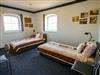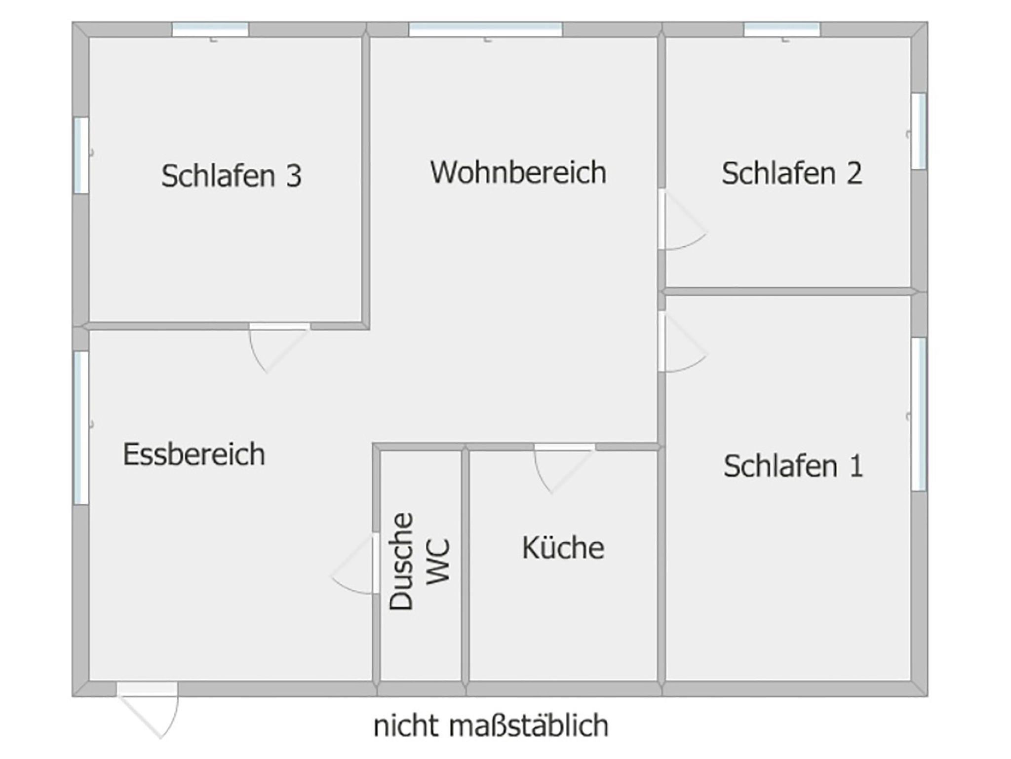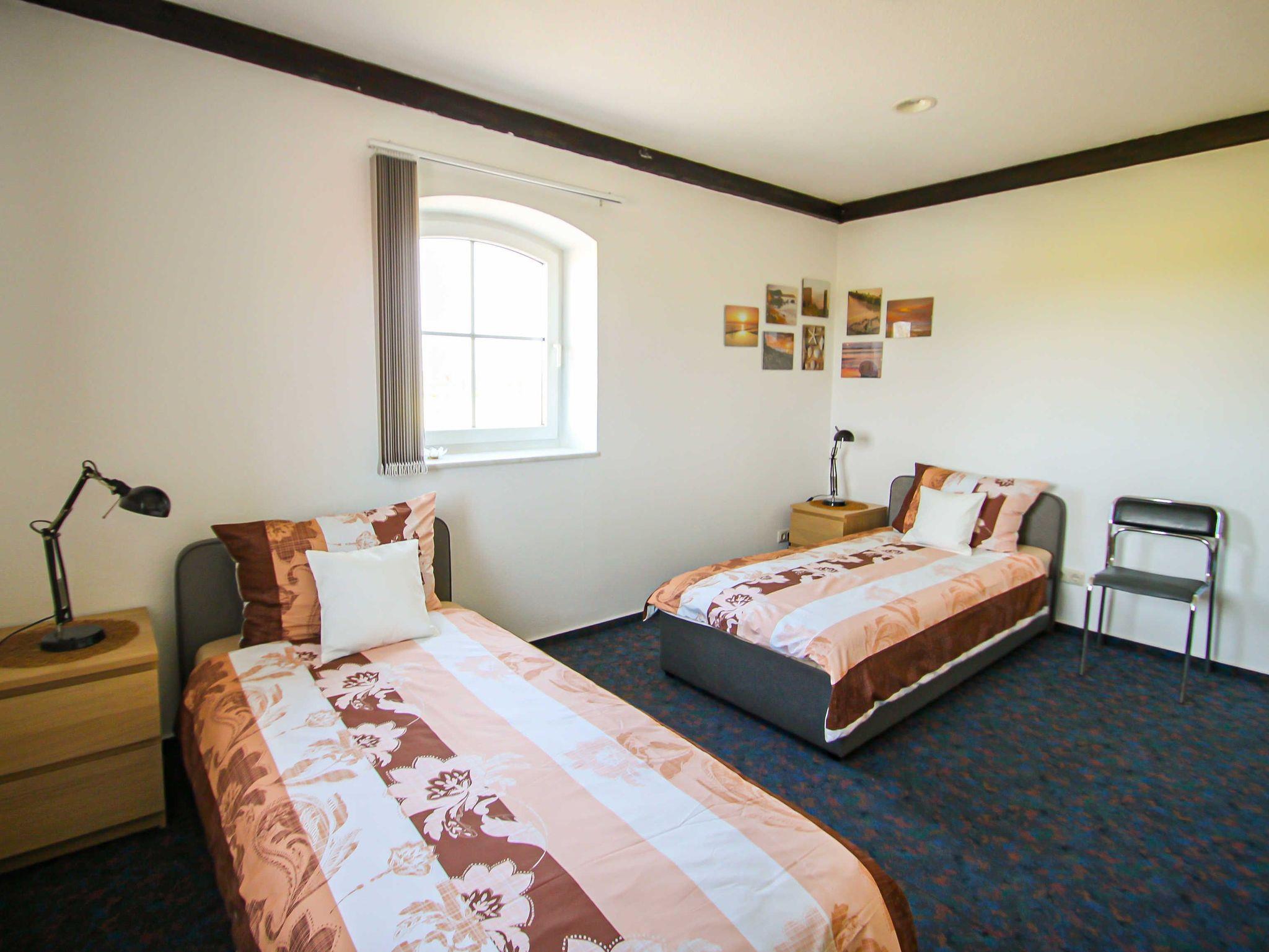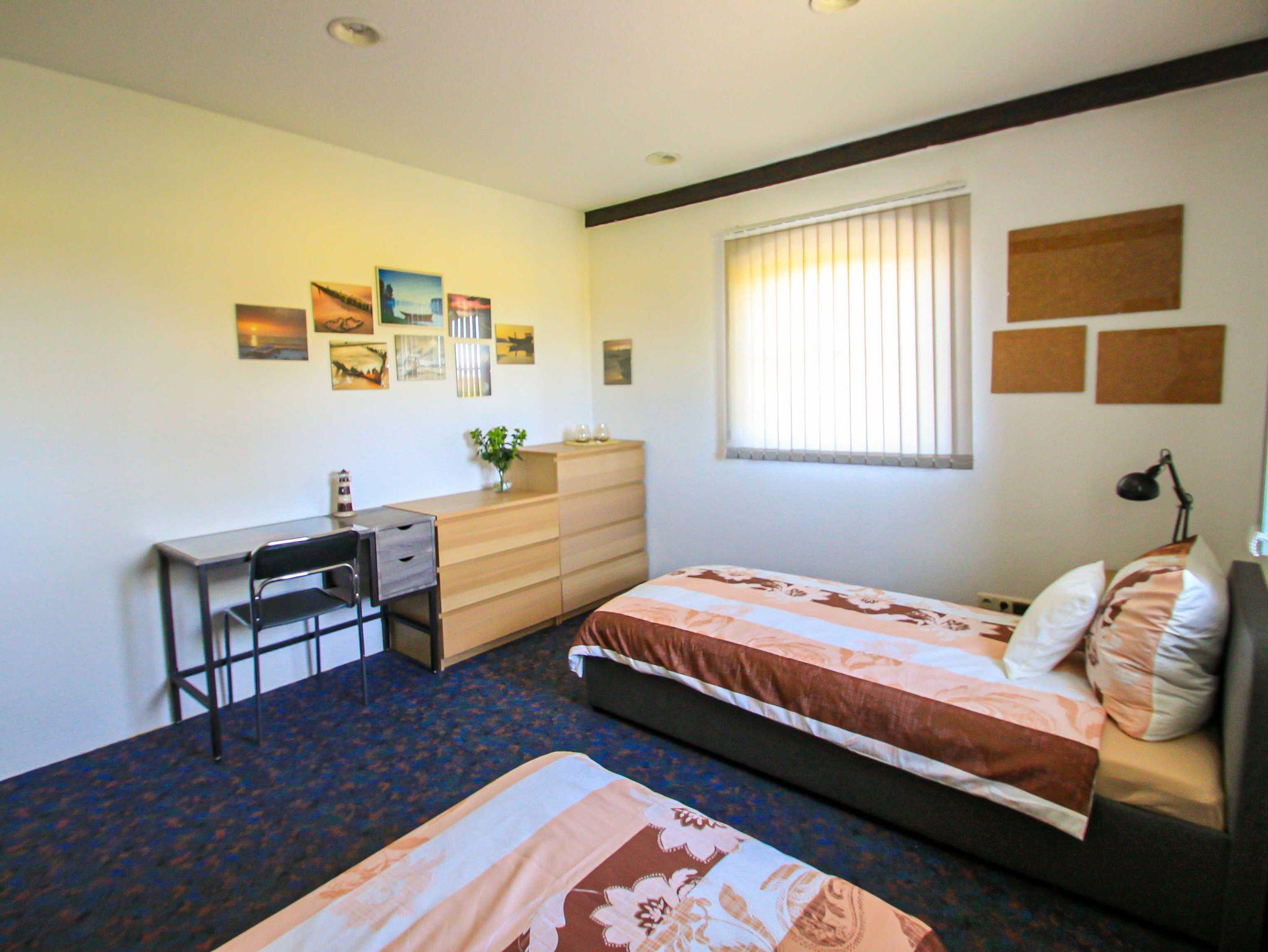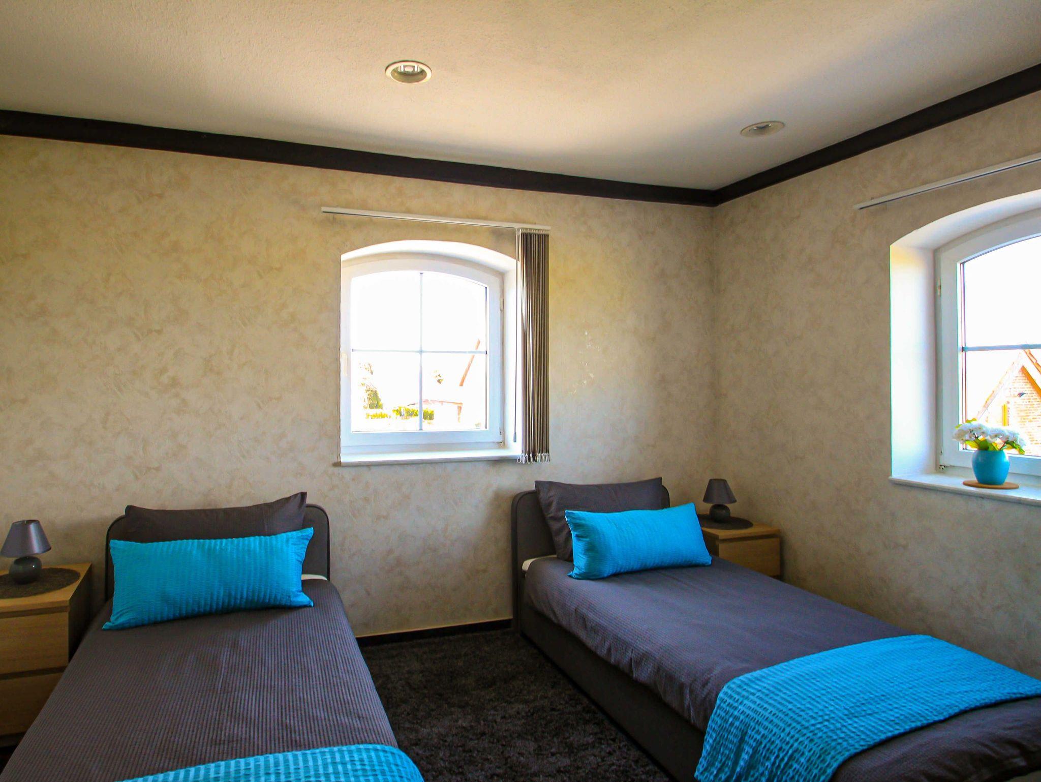 Insgesamt stehen drei Schlafzimmer mit jeweils zwei Einzelbetten (90x200, zusammenstellbar) zur Verfügung. Ein Schlafzimmer ist mit einem großen, geschwungenen Fenster (ca. 2,10 × 2,15 m) ausgestattet. Der Ausblick reicht über die angrenzenden Felder und mit etwas Glück lassen sich hier sogar Rehe beobachten.