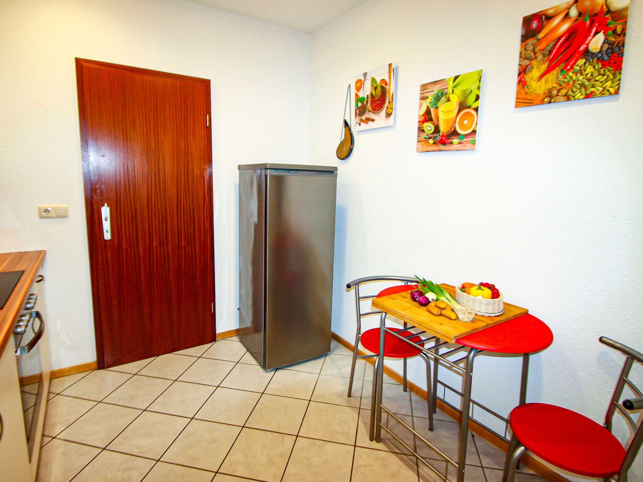 Im Wohnzimmer befinden sich ein Schlafsofa (140x200), ein Sessel und ein TV. Die voll ausgestattete Küche verfügt über Backofen mit Kochfeld, Dunstabzug, Geschirrspüler, Kühlschrank, Mikrowelle, Kaffeemaschine, Toaster, Wasserkocher, Eierkocher sowie ausreichend Geschirr. Ein Bad mit Dusche und WC ist vorhanden.