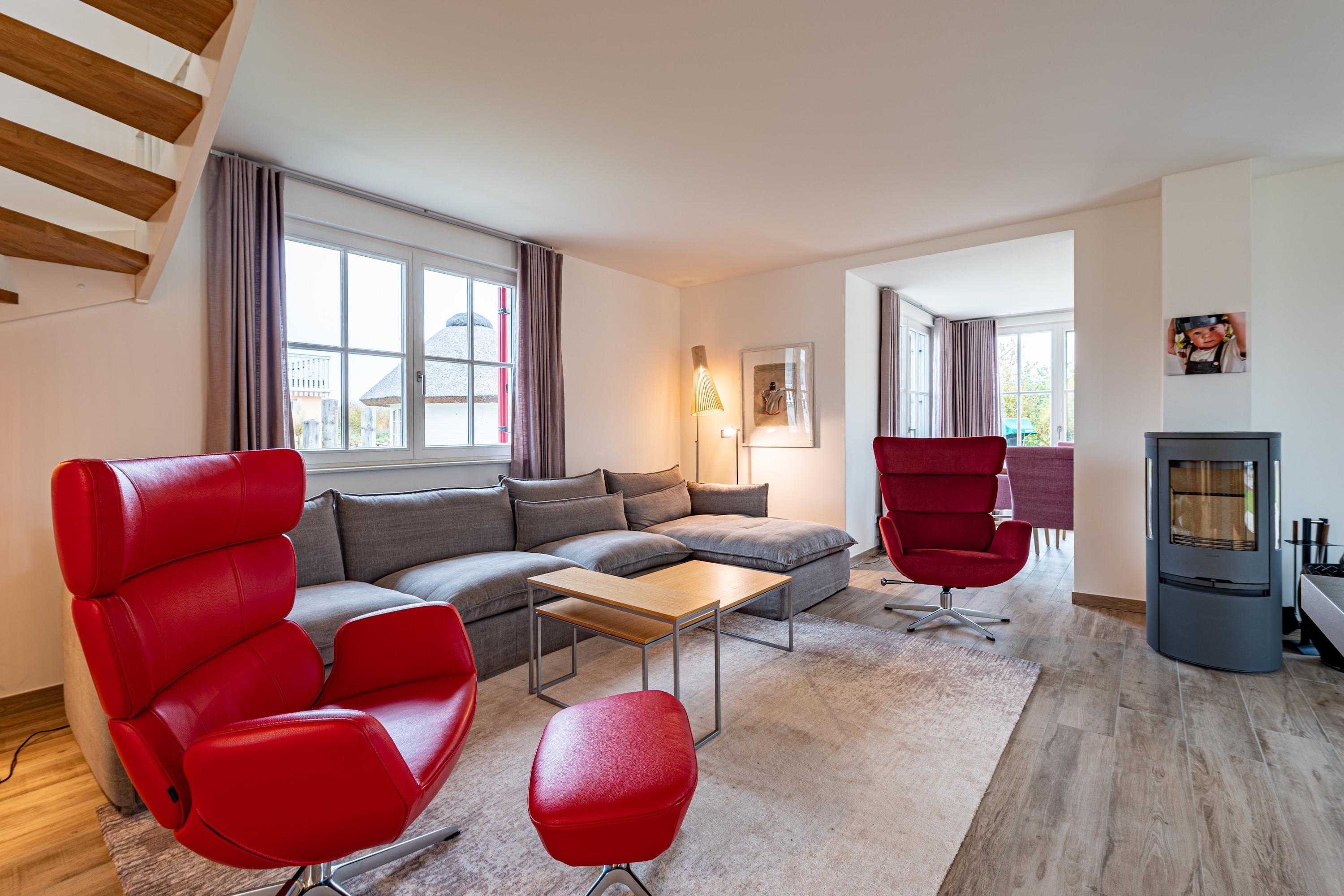 Die Fußbodenheizung und der Kamin sorgen zu jeder Jahreszeit für angenehmes Wohlfühlklima und die Außenterrassen, bestückt mit diversen Gartenmöbeln und einem Strandkorb, der Balkon sowie der große eingezäunte Garten laden zum Verweilen im Freien ein.