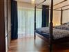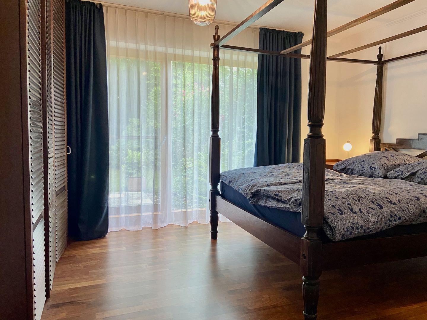 Das besondere Hauptschlafzimmer mit Möbeln im spanischen Stil und tiefblauen Verdunkelungsvorhängen verspricht traumhafte Urlaubsmomente. Der großzügige Garten ist direkt vom Schlafzimmer aus zugänglich, ein Bad mit Badewanne und Dusche befindet sich neben dem Schlafzimmer. Das zweite Schlafzimmer mit direkt angeschlossenem Bad und begehbarer Dusche ist mit zwei Einzelbetten ausgestattet, die bei Bedarf zusammengefügt werden können. Dieses Schlafzimmer bietet direkten Zugang zum Innenhof des Apartments.