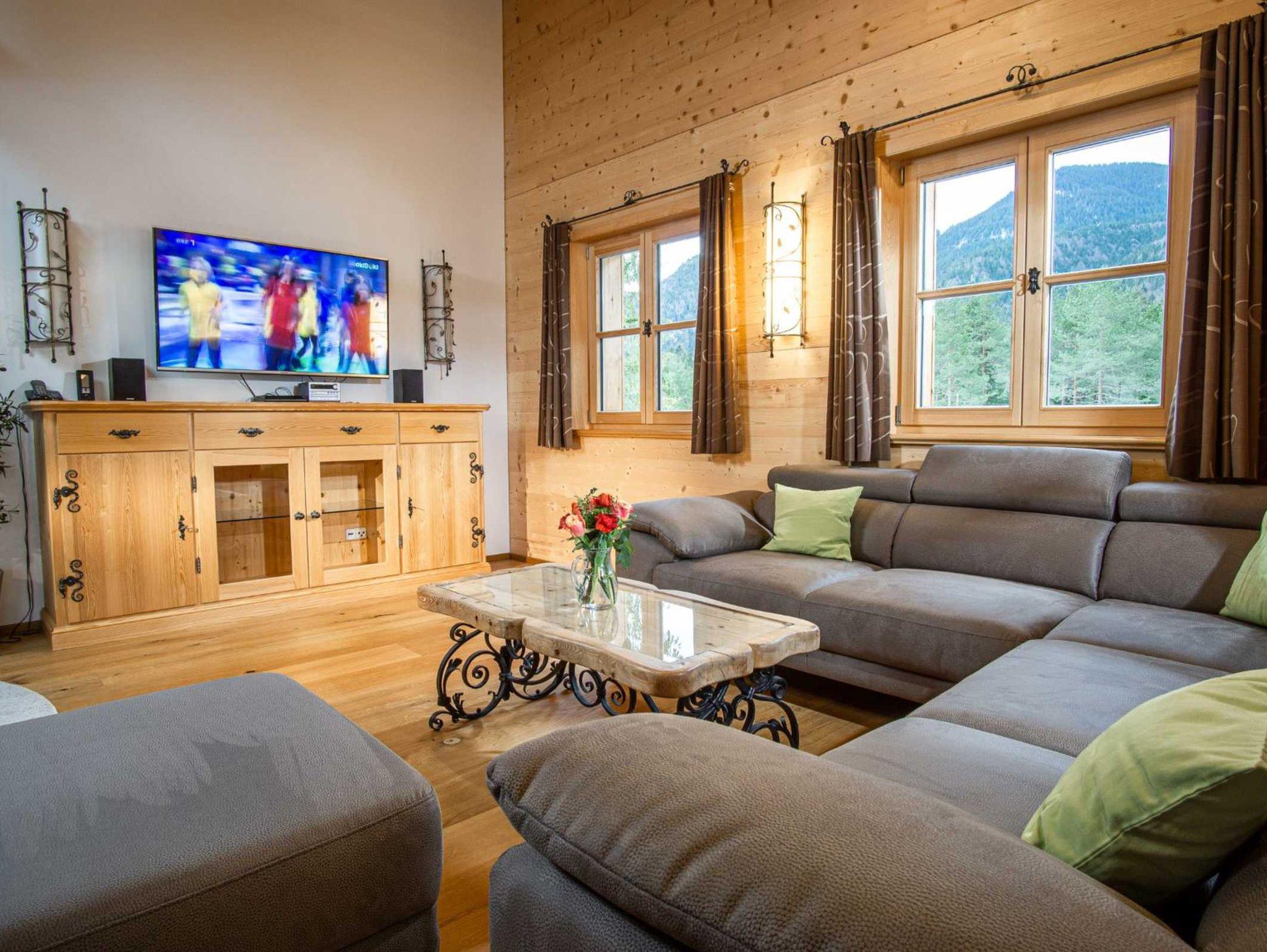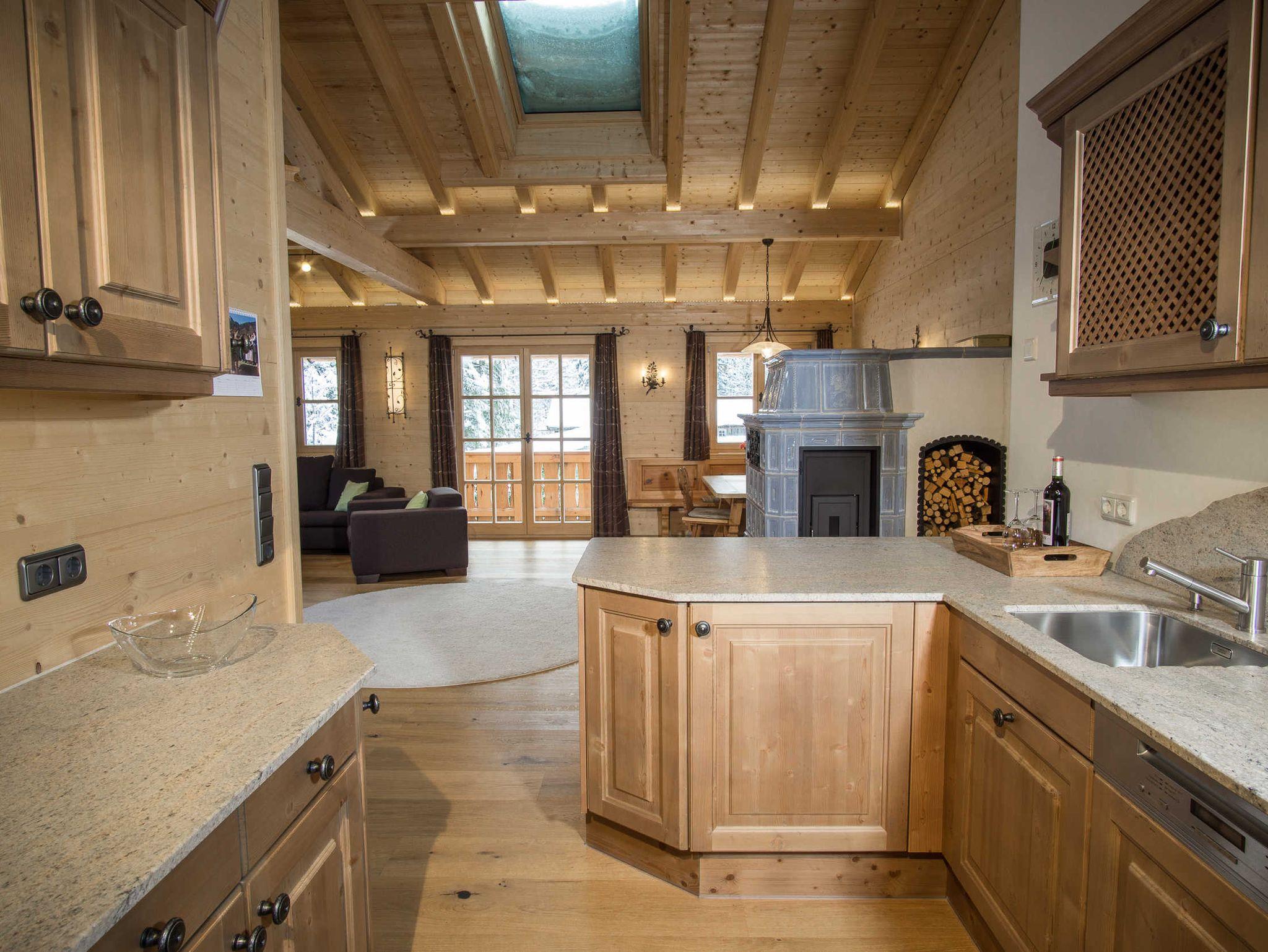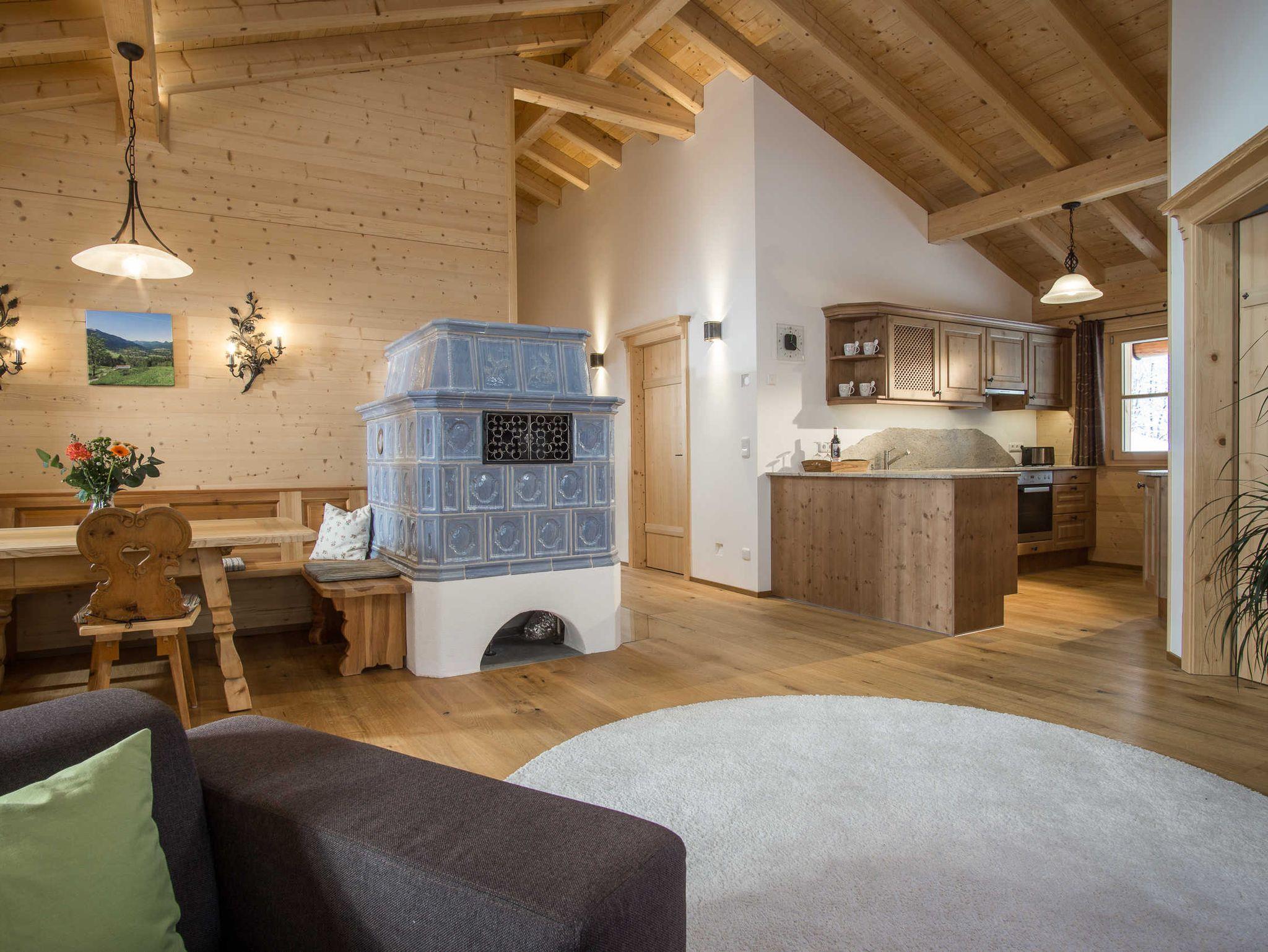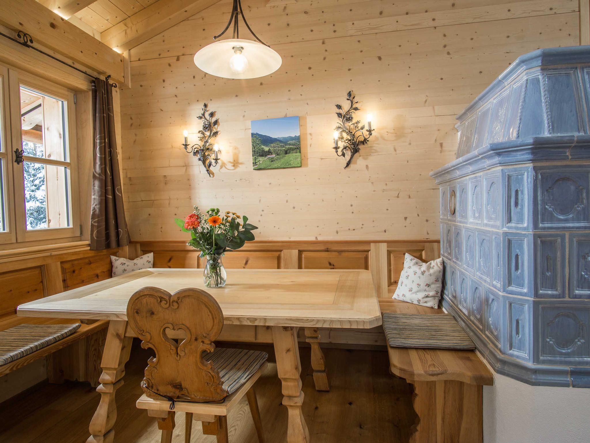 Sie verfügt über einen großzügigen Wohnbereich mit viel naturbelassenen Holzeinbauten, einer gemütlichen Couch-Sitzecke mit einem 55 Flachbildschirm, einer großen Eckbank mit Esstisch und dem beheizbaren Kachelofen.