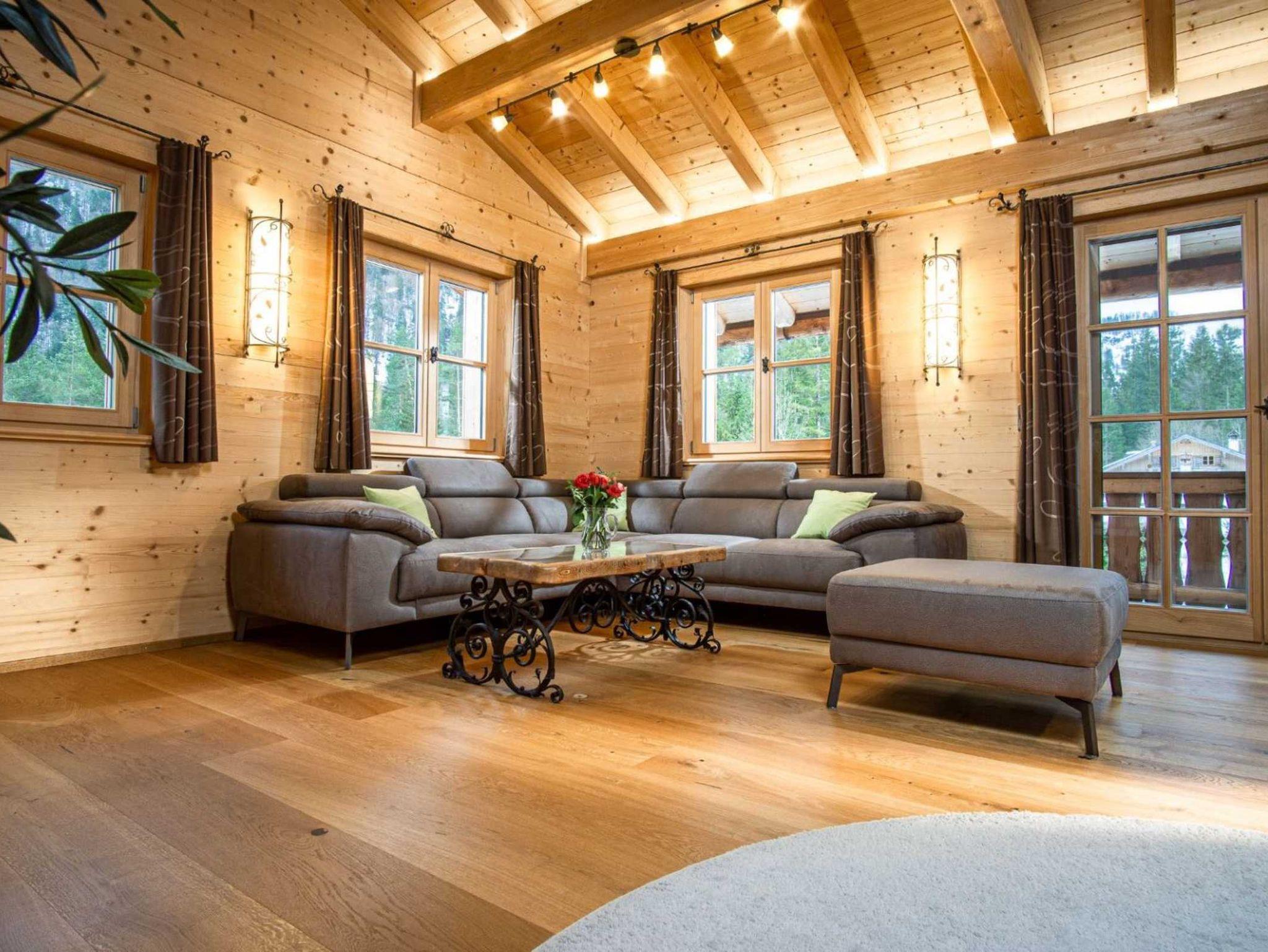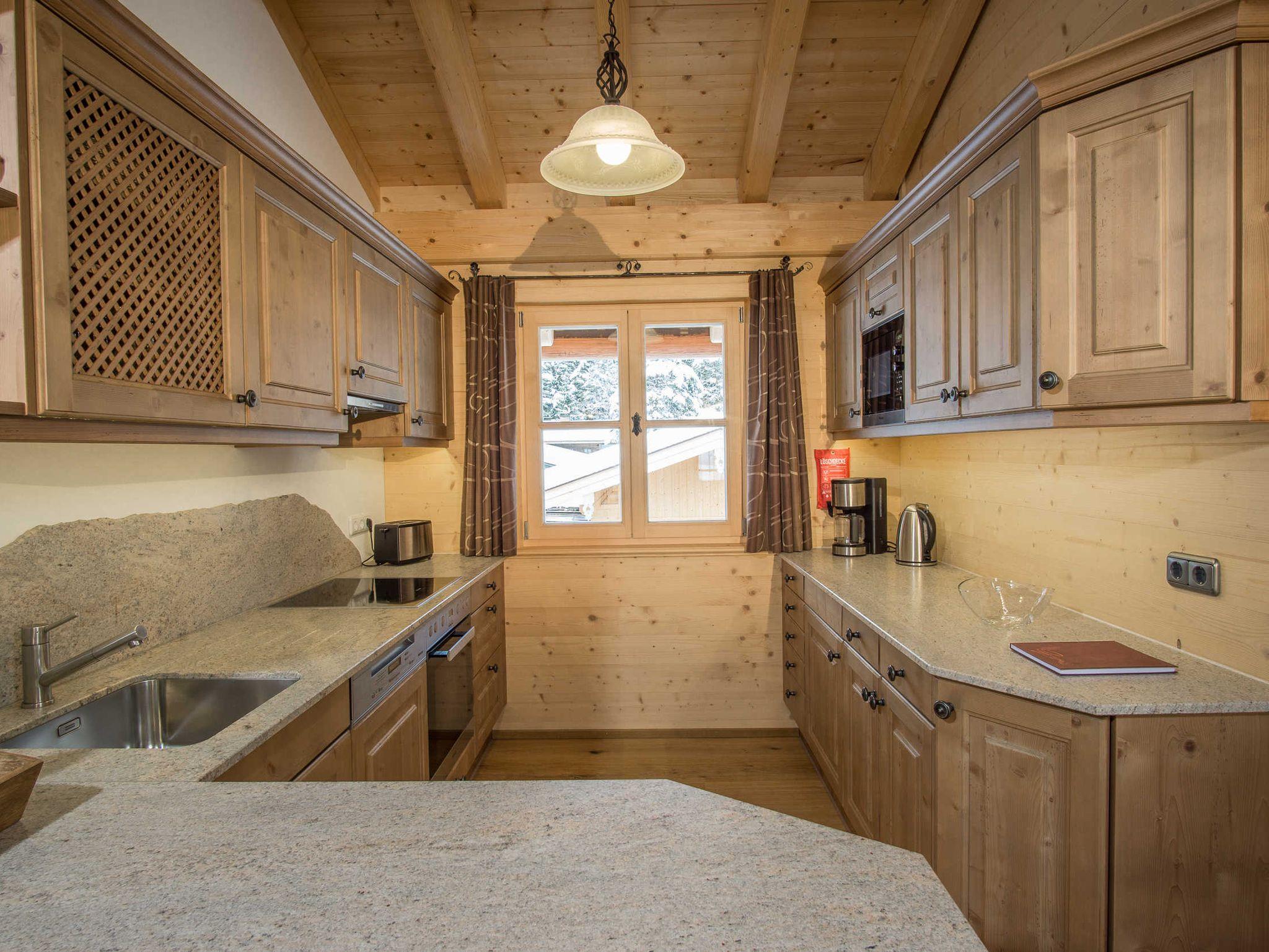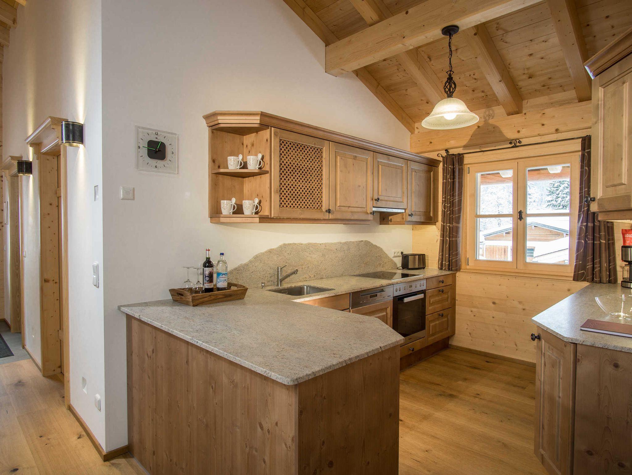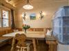Sie verfügt über einen großzügigen Wohnbereich mit viel naturbelassenen Holzeinbauten, einer gemütlichen Couch-Sitzecke mit einem 55 Flachbildschirm, einer großen Eckbank mit Esstisch und dem beheizbaren Kachelofen.