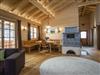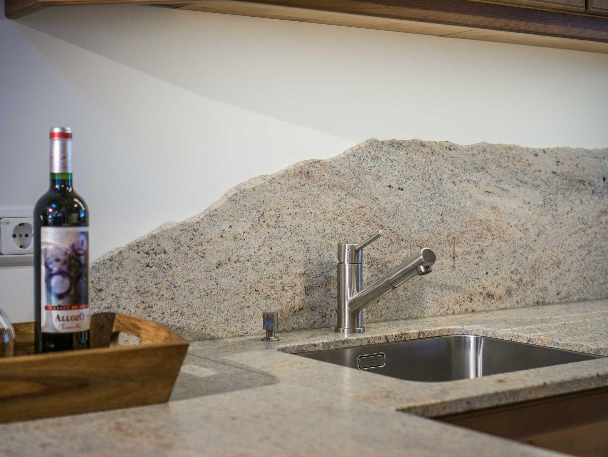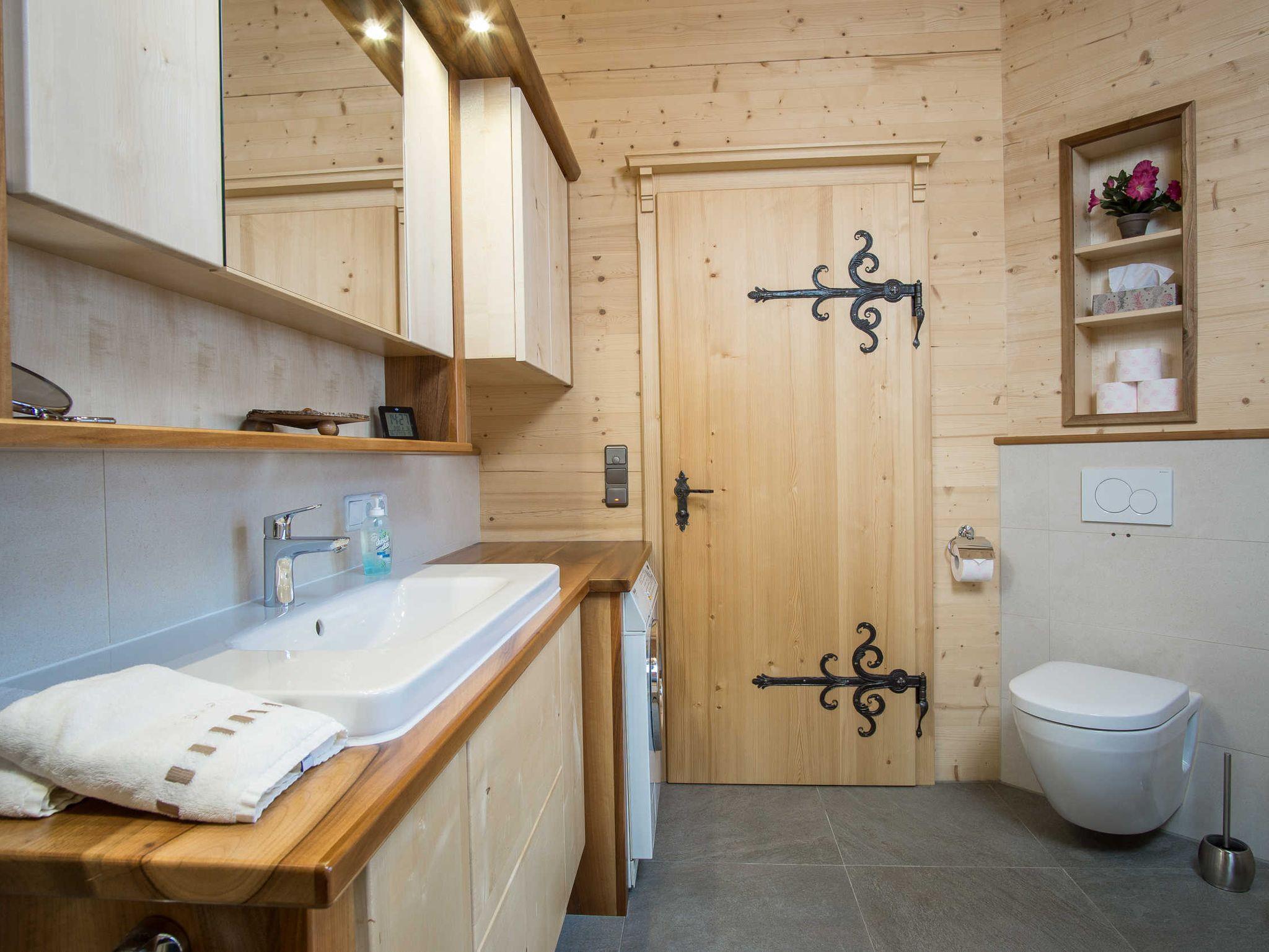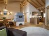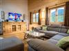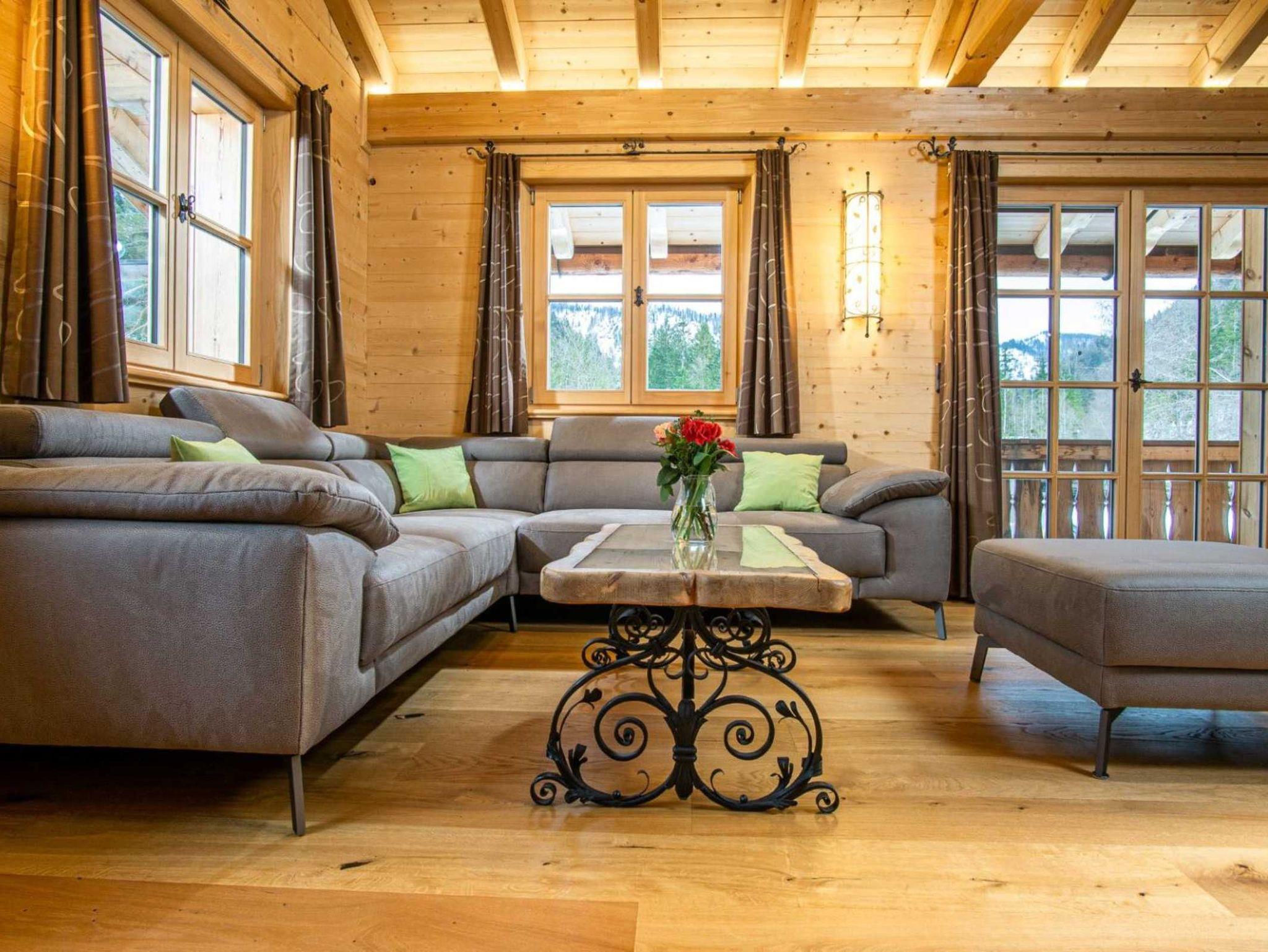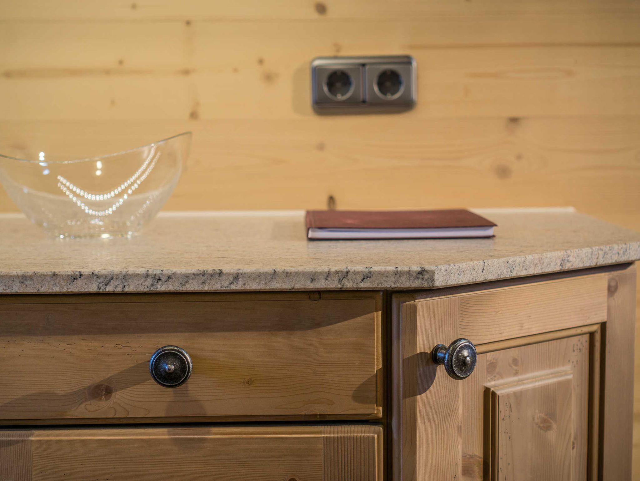 Sie verfügt über einen großzügigen Wohnbereich mit viel naturbelassenen Holzeinbauten, einer gemütlichen Couch-Sitzecke mit einem 55 Flachbildschirm, einer großen Eckbank mit Esstisch und dem beheizbaren Kachelofen.