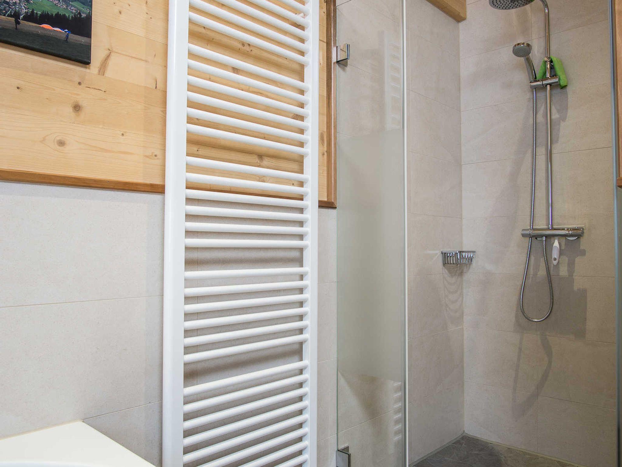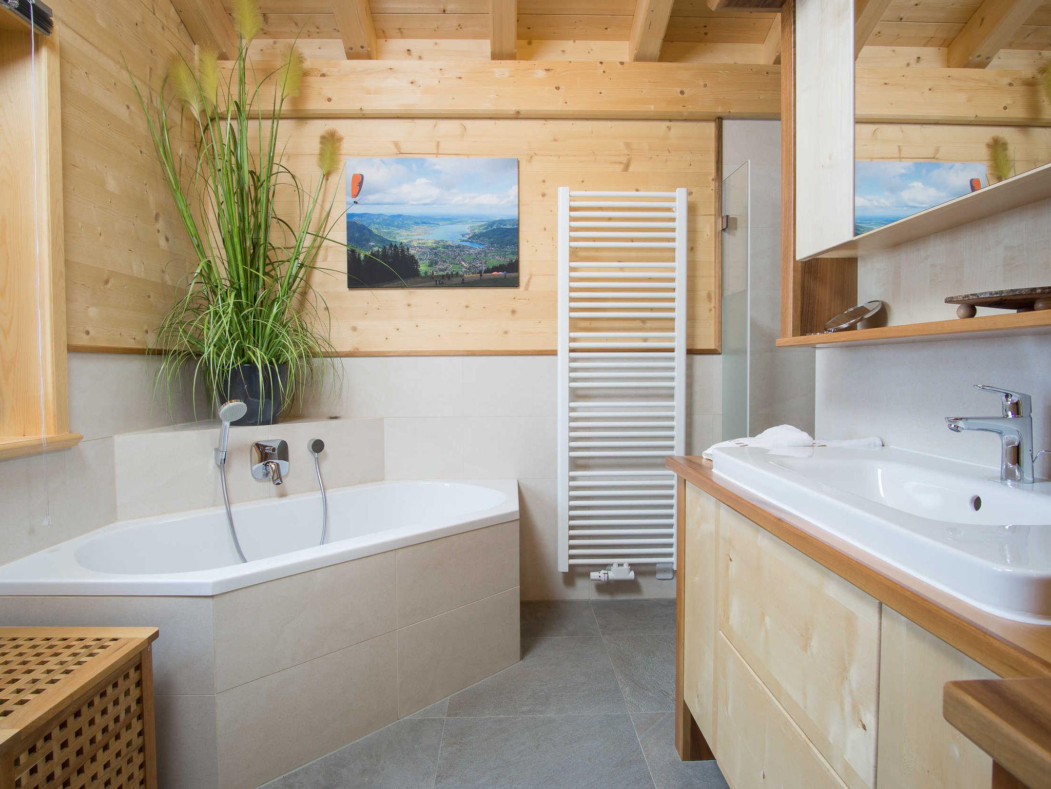 Die Badeinrichtung besteht aus einer geräumigen Eckbadewanne und einer barrierefreien Dusche, sowie einer Toilette, Waschmaschine und einem Haartrockner mit kleinen und großen Handtüchern und Badvorleger.