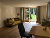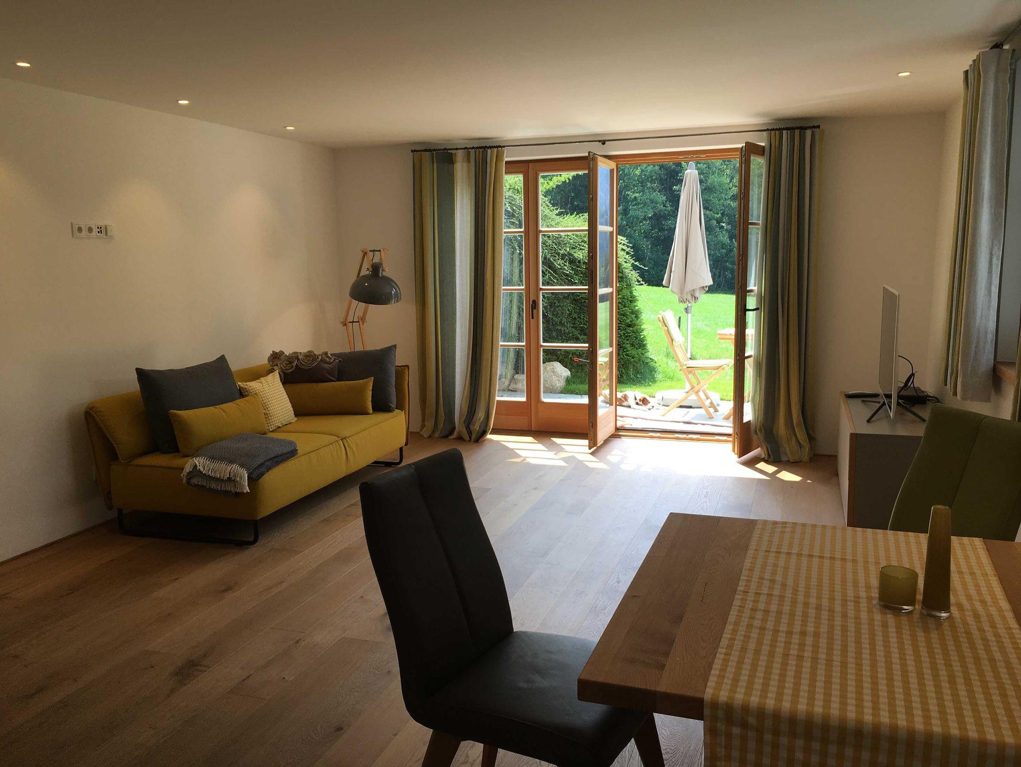 Die Wohnung ist mit Dielenboden, einem stilvollen Bad mit großer Badewanne, Dusche und Altholz-Waschtisch, einer kleinen Küchenzeile sowie hochwertigen Möbeln ausgestattet. Sie verfügt über einen separaten Eingang und eine umlaufende Garten-Terrasse mit Südwest-Ausrichtung, auf der Sie den ganzen Tag die Sonne und den Traumblick genießen können.
